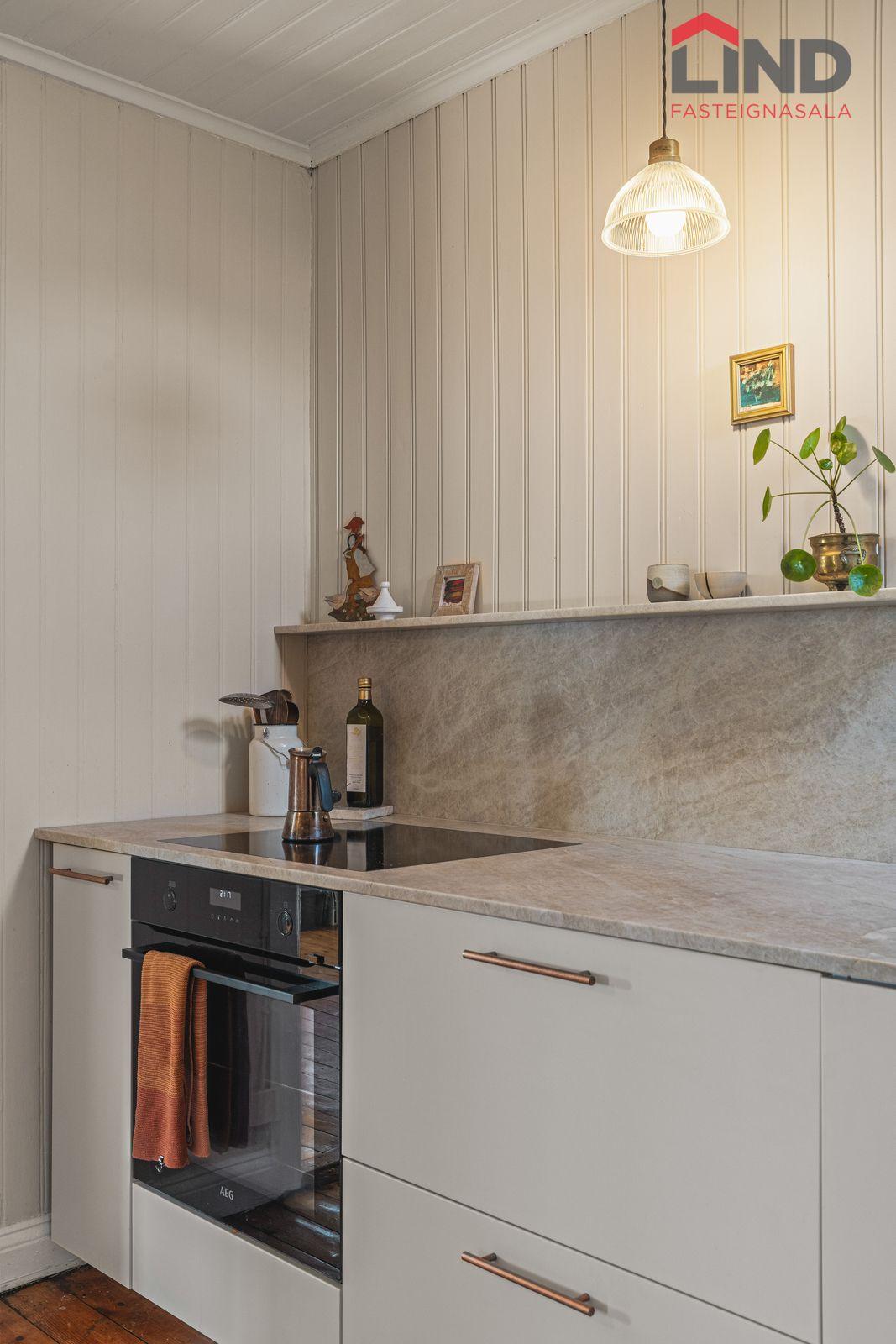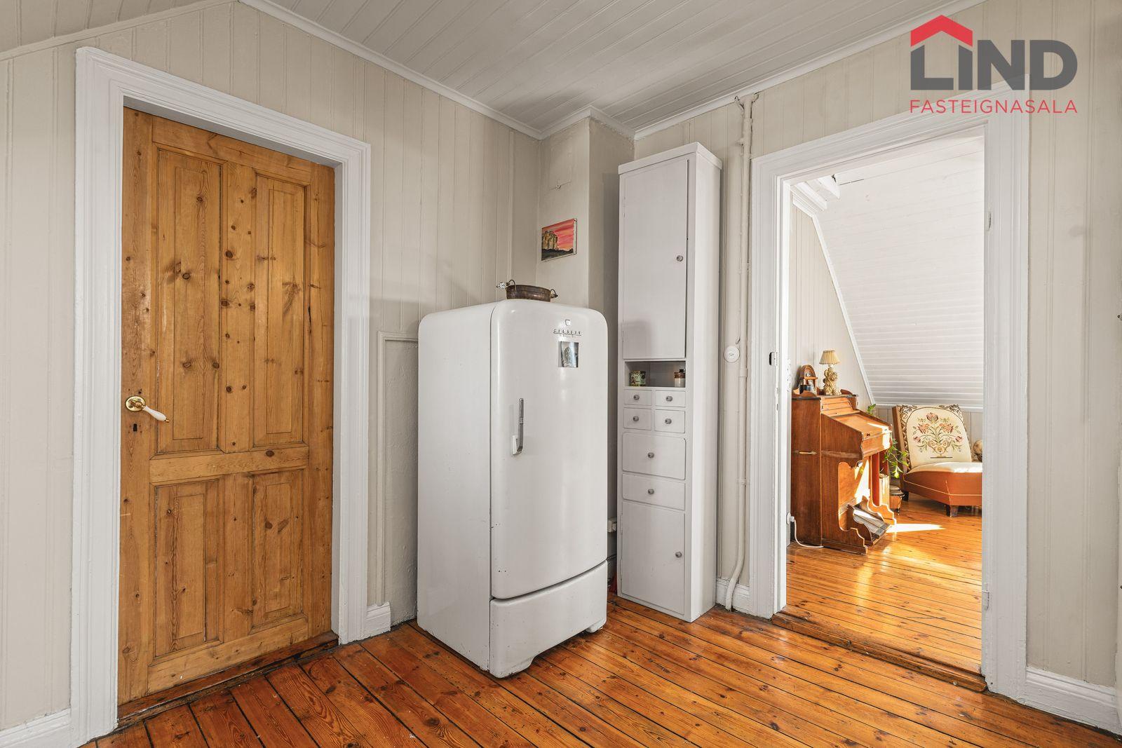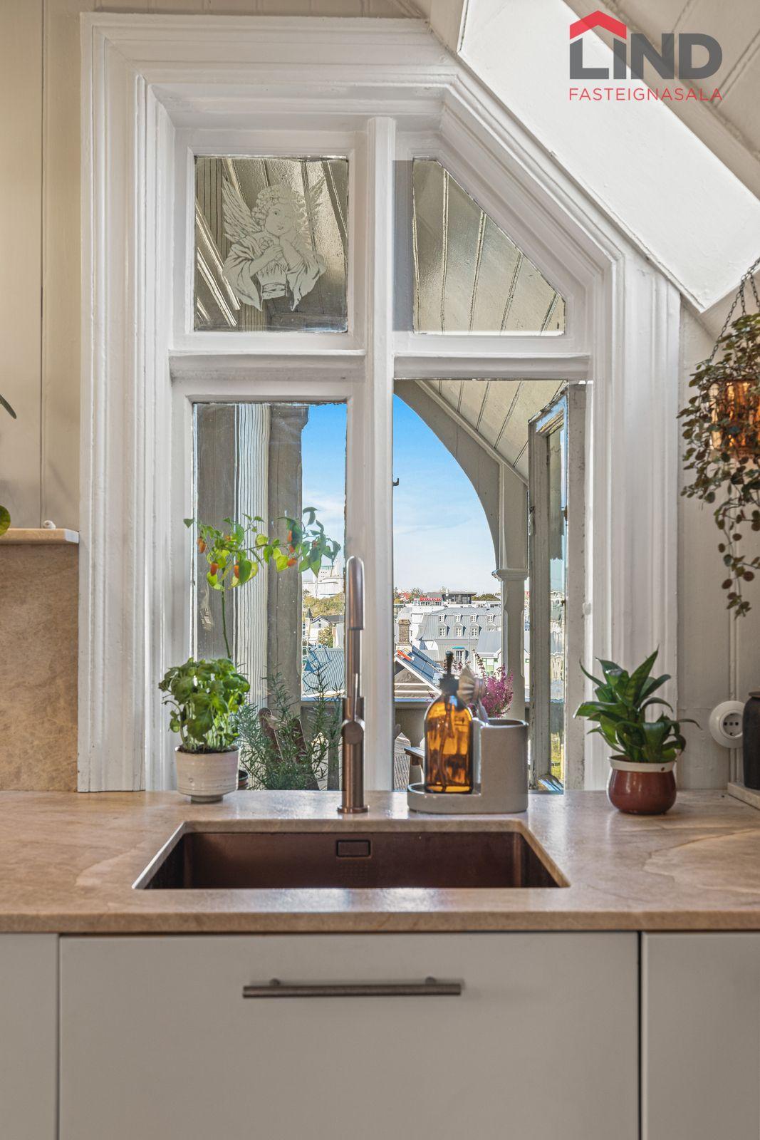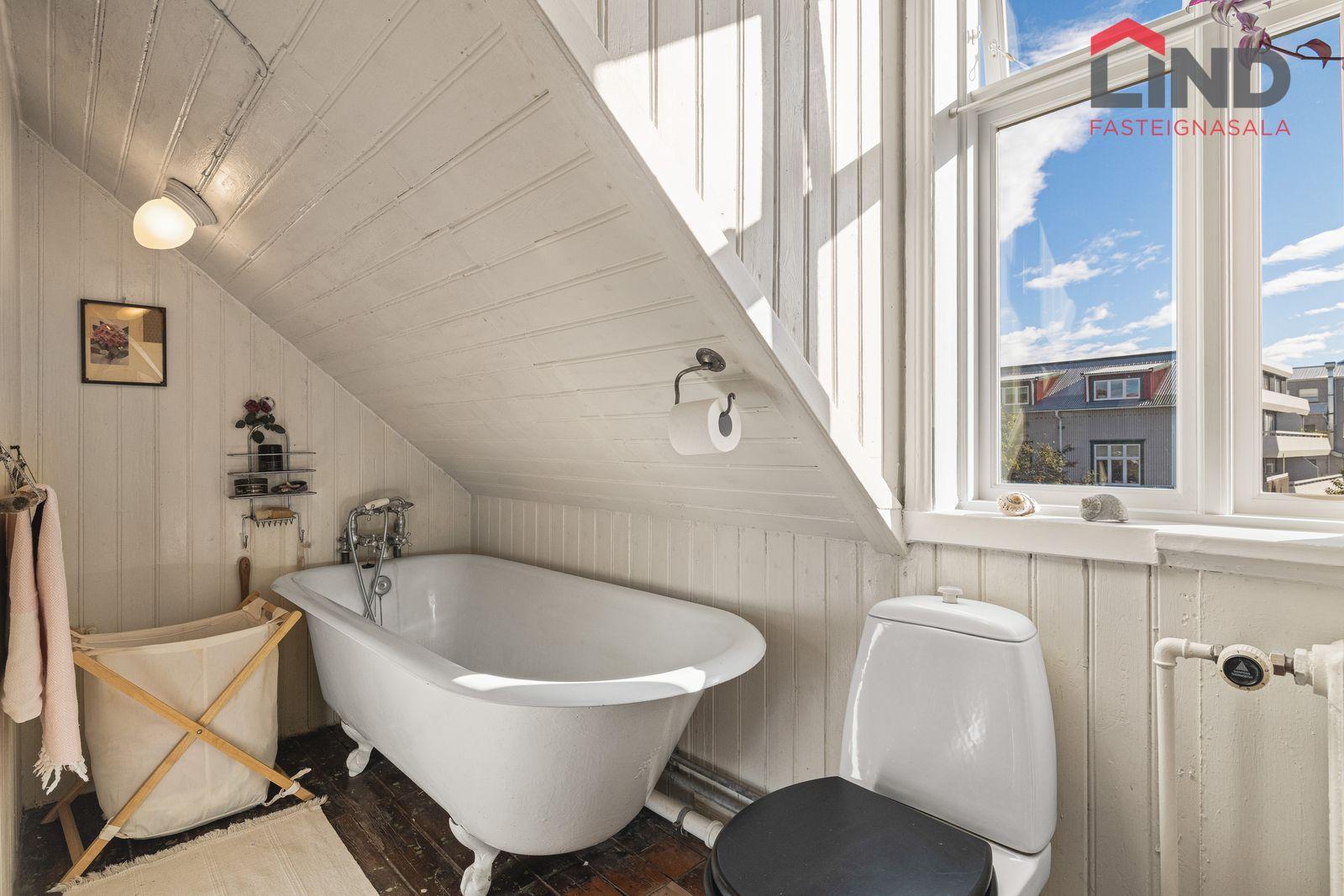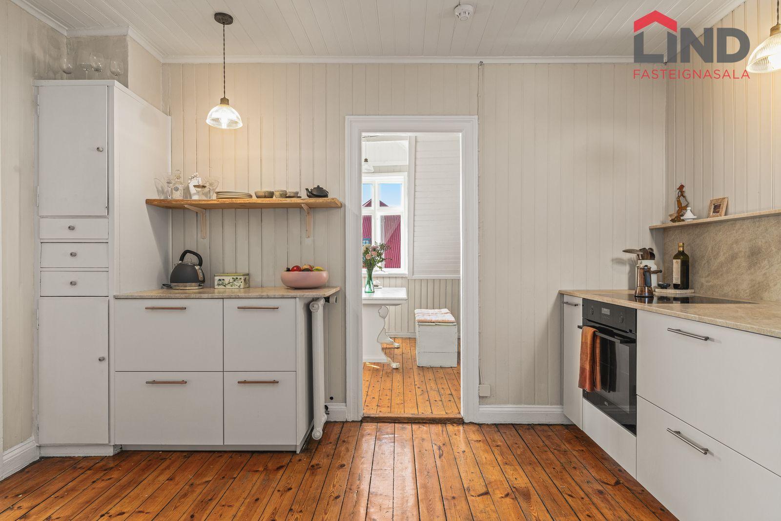 Lind fasteignasala / Heimir Hallgrímsson lögg. fasteignasali kynna til sölu glæsilega og sjarmerandi 3ja herbergja útsýnisíbúð með svölum á 3. hæð í afar fallegu bárujárnsklæddu timburhúsi byggðu árið 1907. Íbúðin er skráð 74,1 fermetrar að stærð en er mun stærri að grunnfleti þar sem hluti íbúðar er undir súð og nýtast þeir fermetrar mjög vel. Íbúðin er með upphaflegum viðarborðum á gólfum og panelklæddum veggjum og loftum. Aukin lofthæð er yfir hluta af stofum með fallegum viðarbitum í lofti. Reynt hefur verið að halda í upprunlegt horf hússins í viðhaldssögu þess. M.a. voru allir gluggar á austur- og suðurhlið endurnýjaðir (sérsmíðaðir) á árinu í upprunalegum stíl hússins. Þá var eldhús endurnýjað nýlega á smekklegan máta. Auk þess er búið að endurnýja mest af neysluvatnslögnum og rafmagnstöflu innan íbúðar.