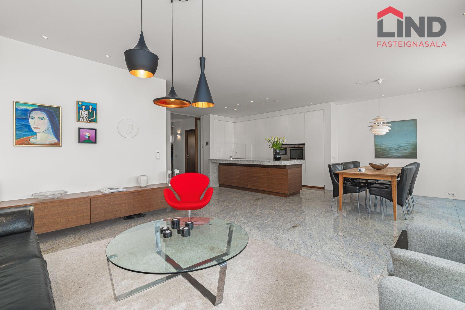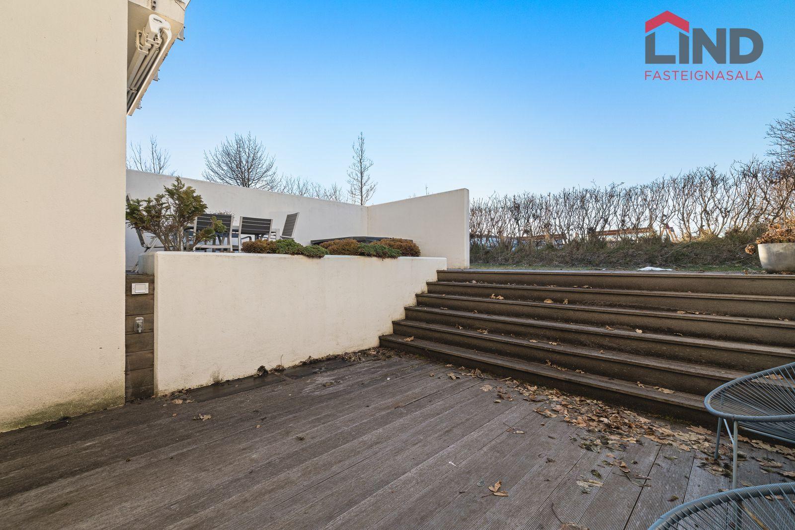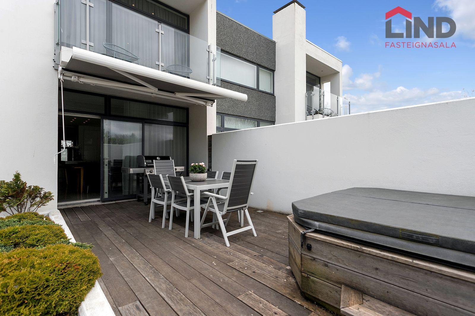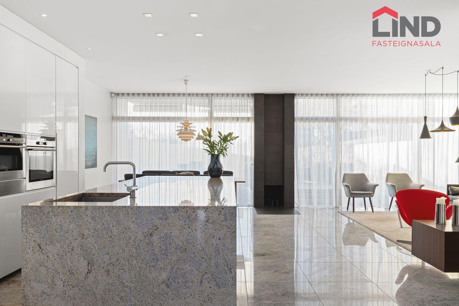 Stofa, borðstofa og eldhús eru í opnu, björtu rými með gólfsíðum gluggum. Þaðan er útgengt í skjólgóðan suðurgarð með timburpalli, heitum potti og steyptum skjólveggjum. Fallegur arinn er í rýminu. Loft eru niðurtekin með innfelldri lýsingu. Granítflísar eru á gólfum hæðarinnar.