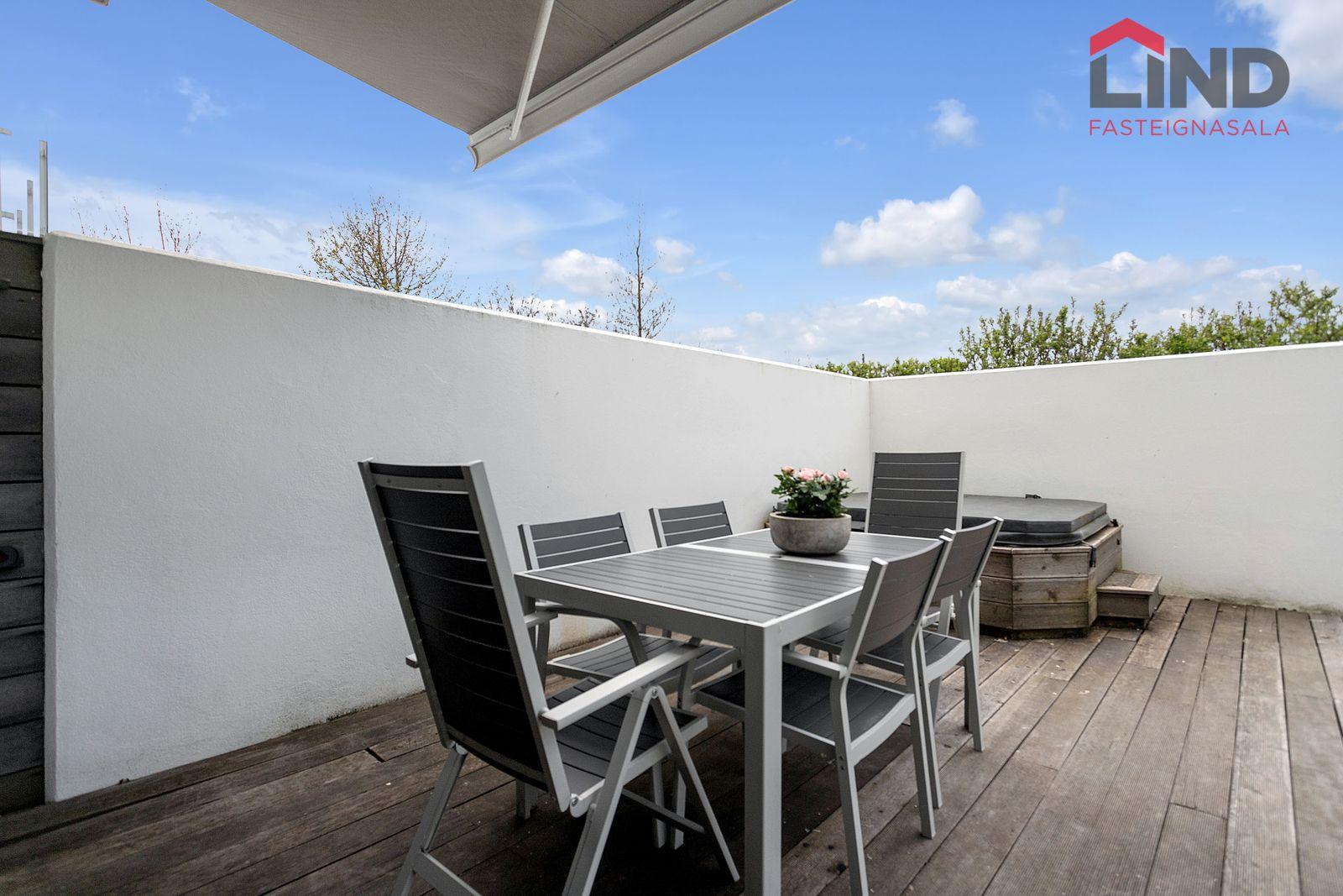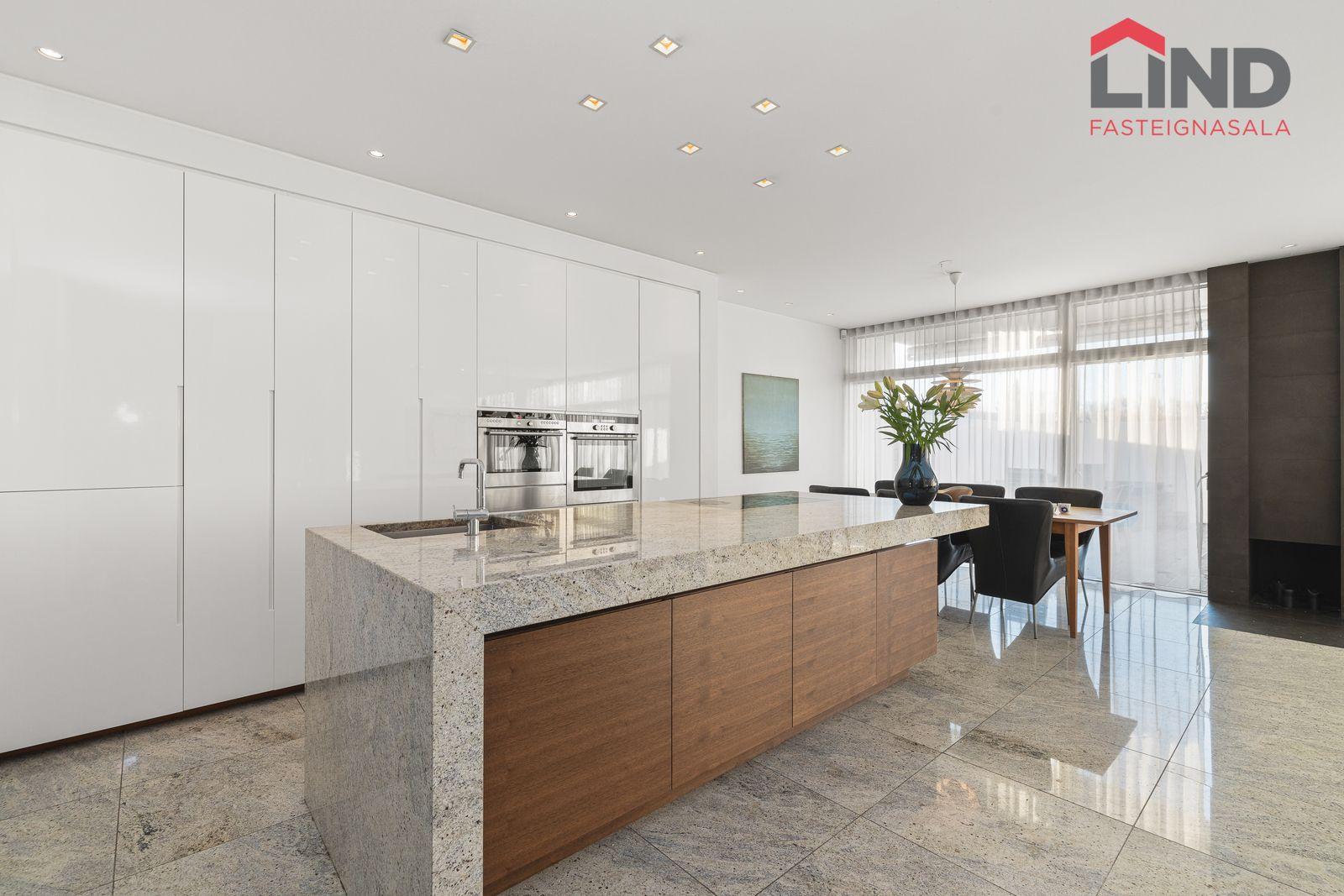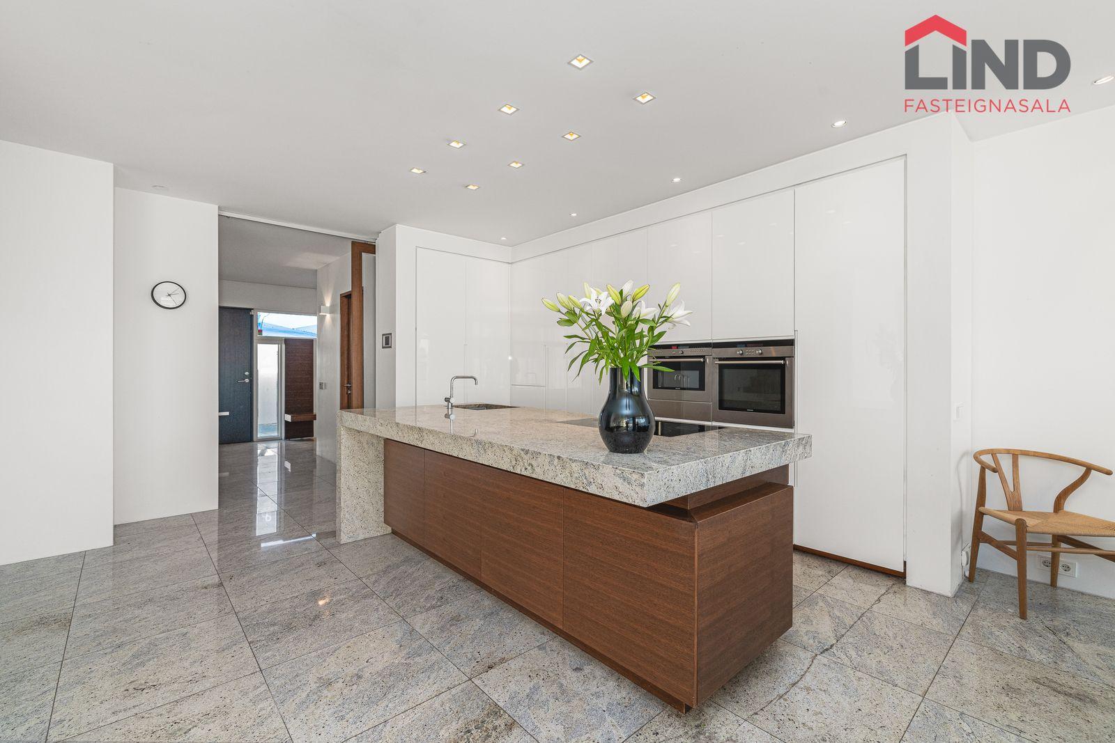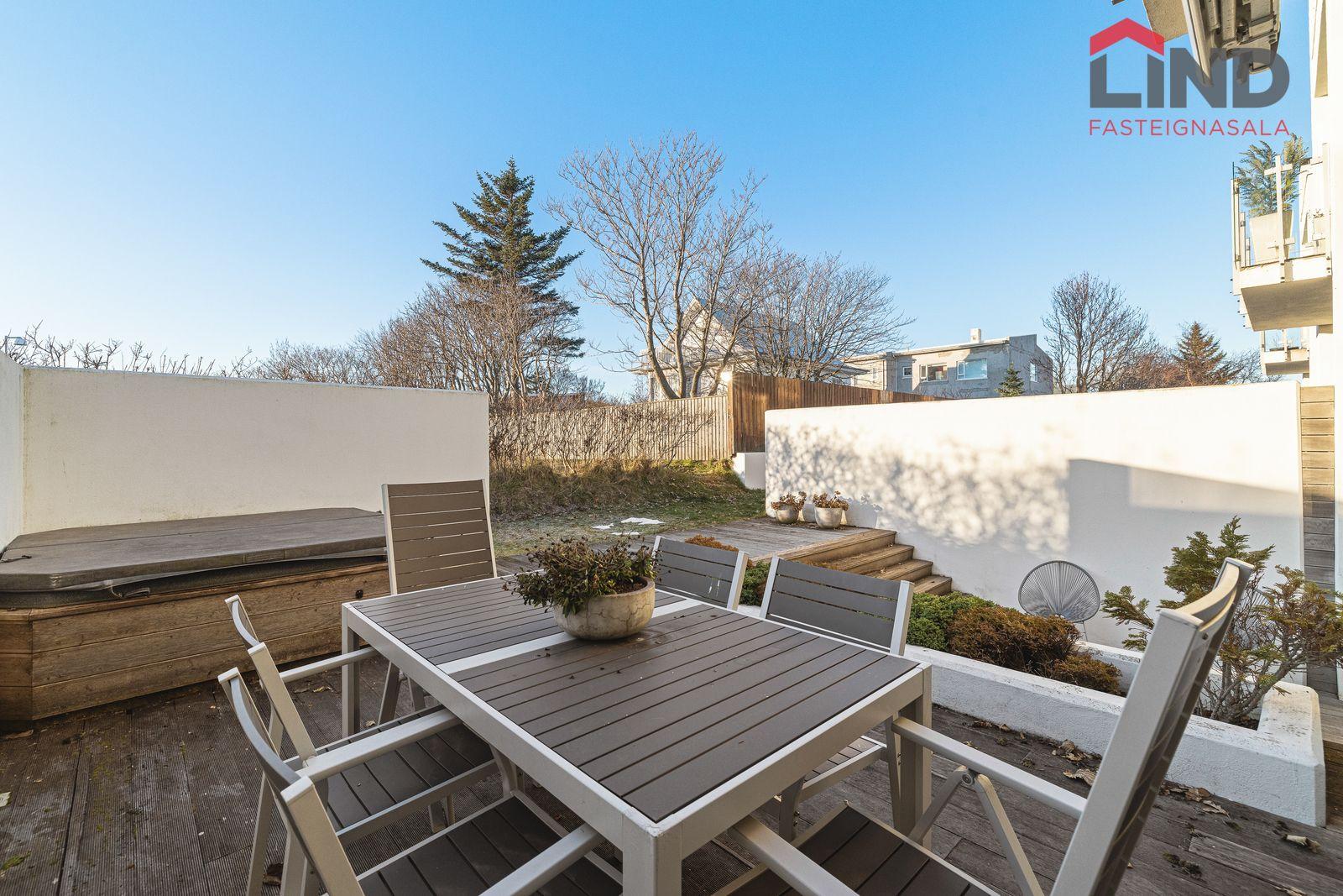 Stofa, borðstofa og eldhús eru í opnu, björtu rými með gólfsíðum gluggum. Þaðan er útgengt í skjólgóðan suðurgarð með timburpalli, heitum potti og steyptum skjólveggjum. Fallegur arinn er í rýminu. Loft eru niðurtekin með innfelldri lýsingu. Granítflísar eru á gólfum hæðarinnar.