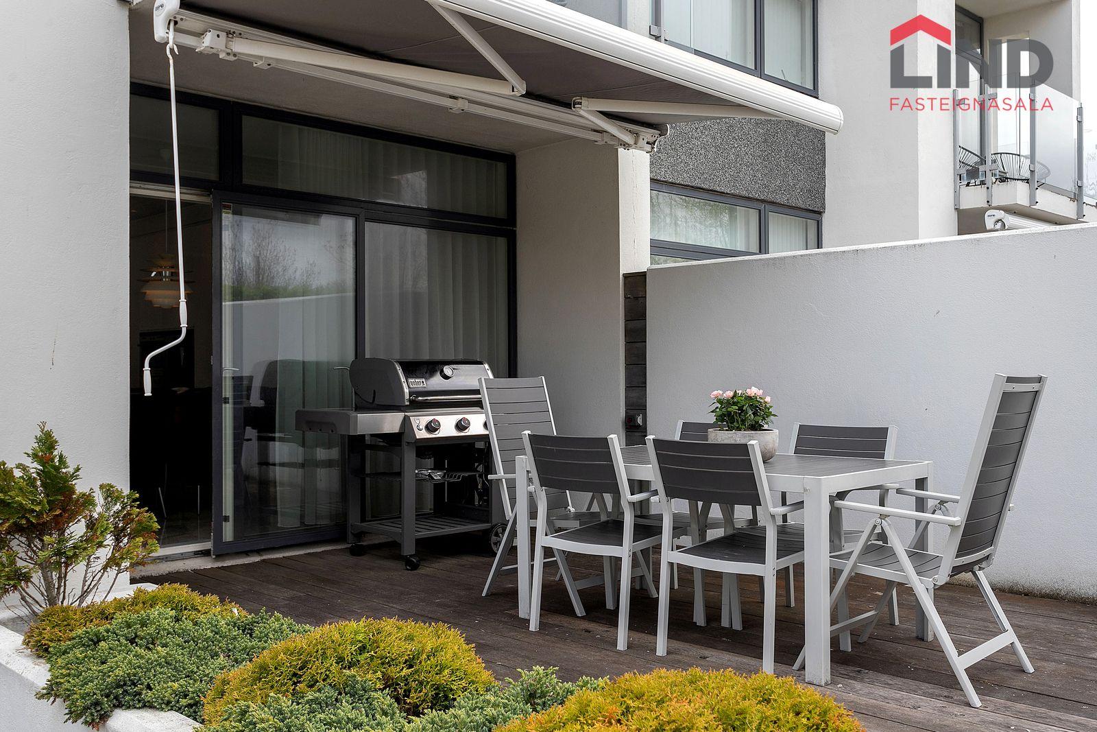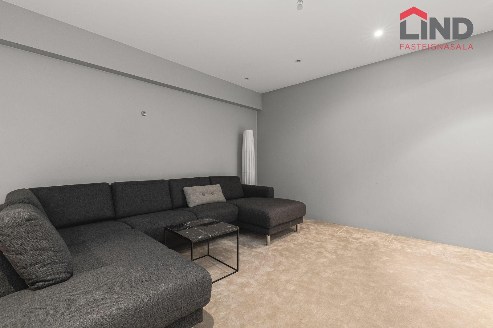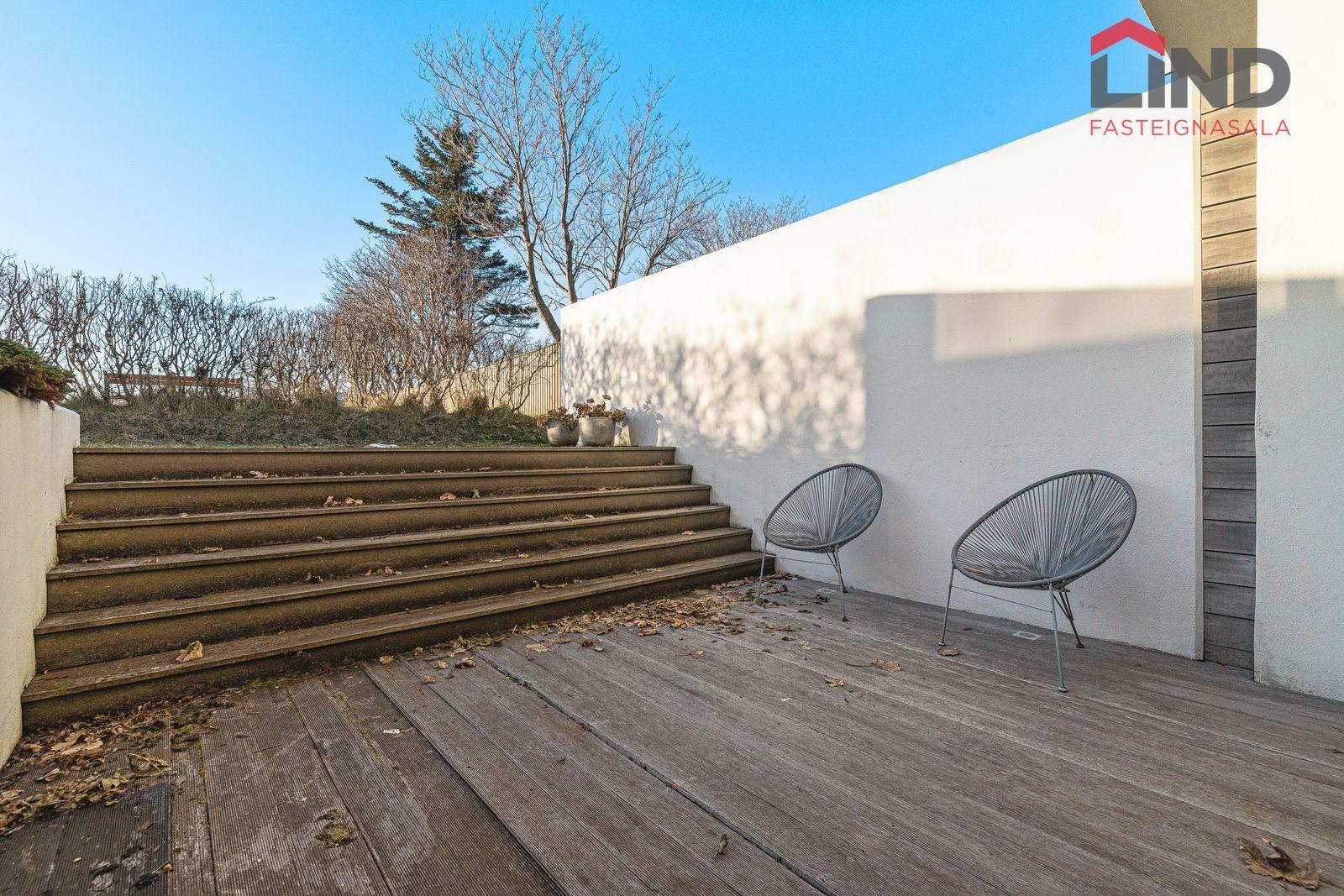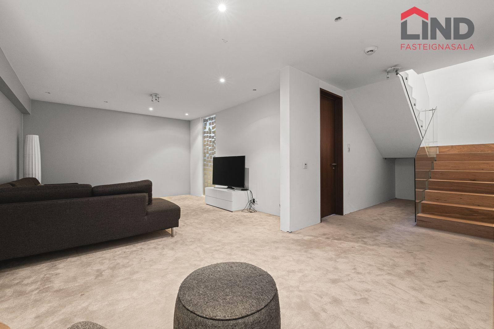 Stofa, borðstofa og eldhús eru í opnu, björtu rými með gólfsíðum gluggum. Þaðan er útgengt í skjólgóðan suðurgarð með timburpalli, heitum potti og steyptum skjólveggjum. Fallegur arinn er í rýminu. Loft eru niðurtekin með innfelldri lýsingu. Granítflísar eru á gólfum hæðarinnar.
