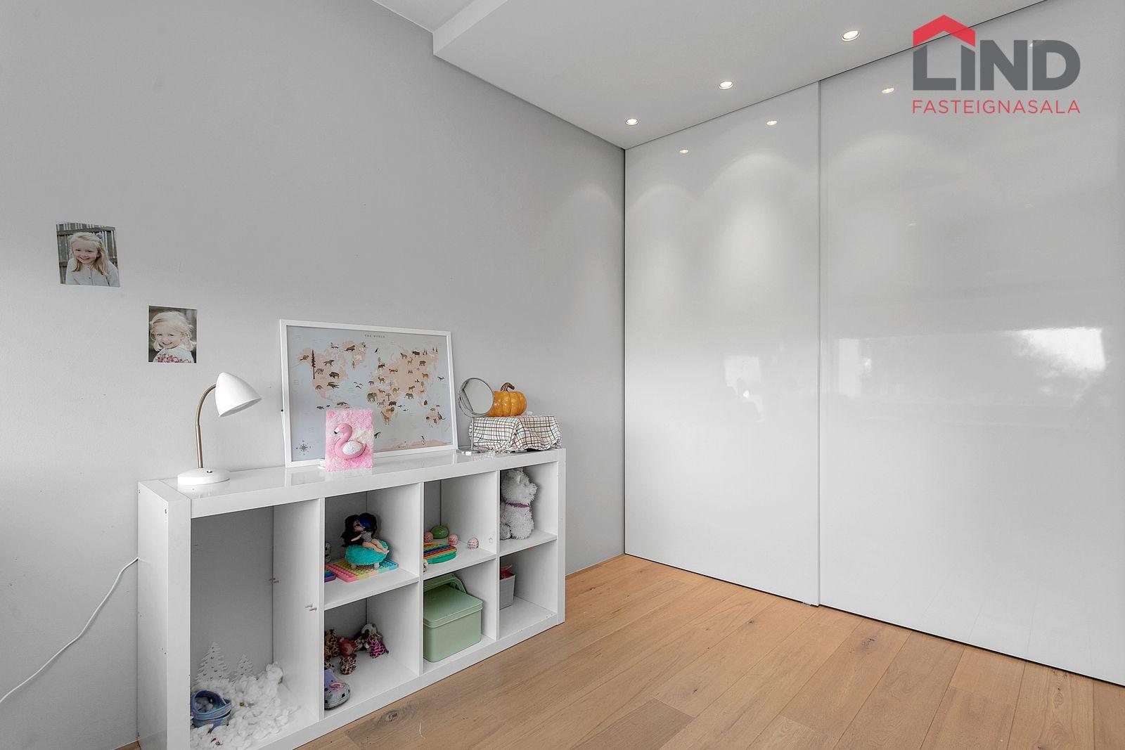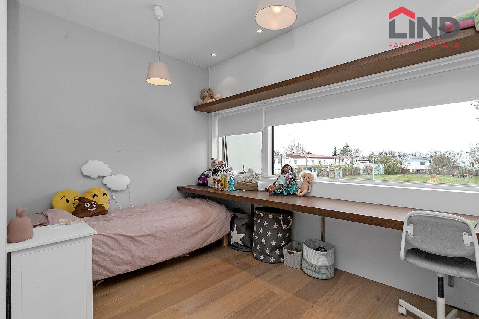 Þrjú rúmgóð barnaherbergi með innbyggðum skápum, sérsmíðuðum innréttingum og hillum.