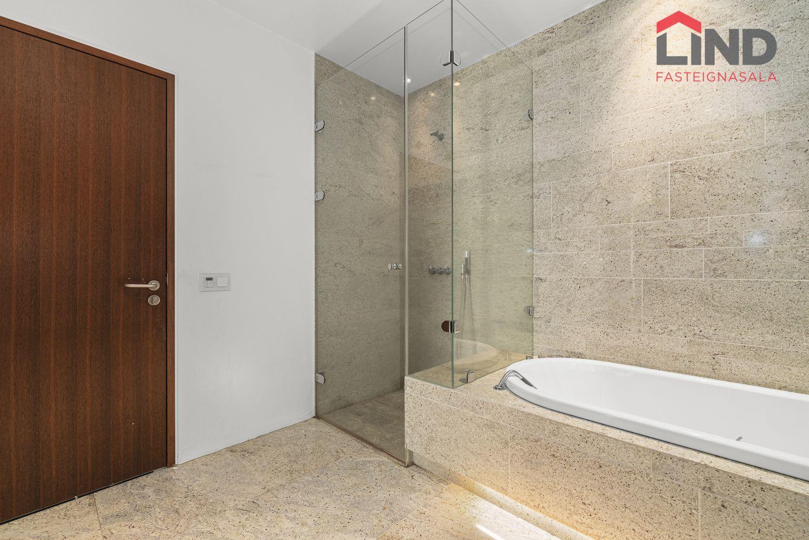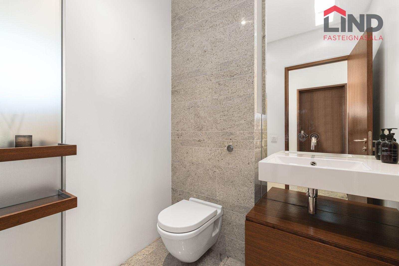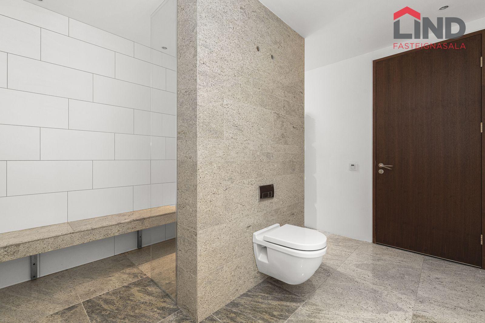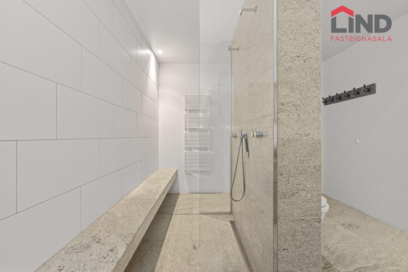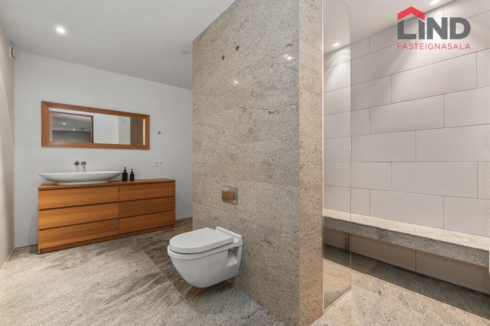 Vandað baðherbergi með granítflísum í hólf og gólf, upphengt salerni og stór tvöföld sturta aðskilin frá fremri hluta baðherbergis.