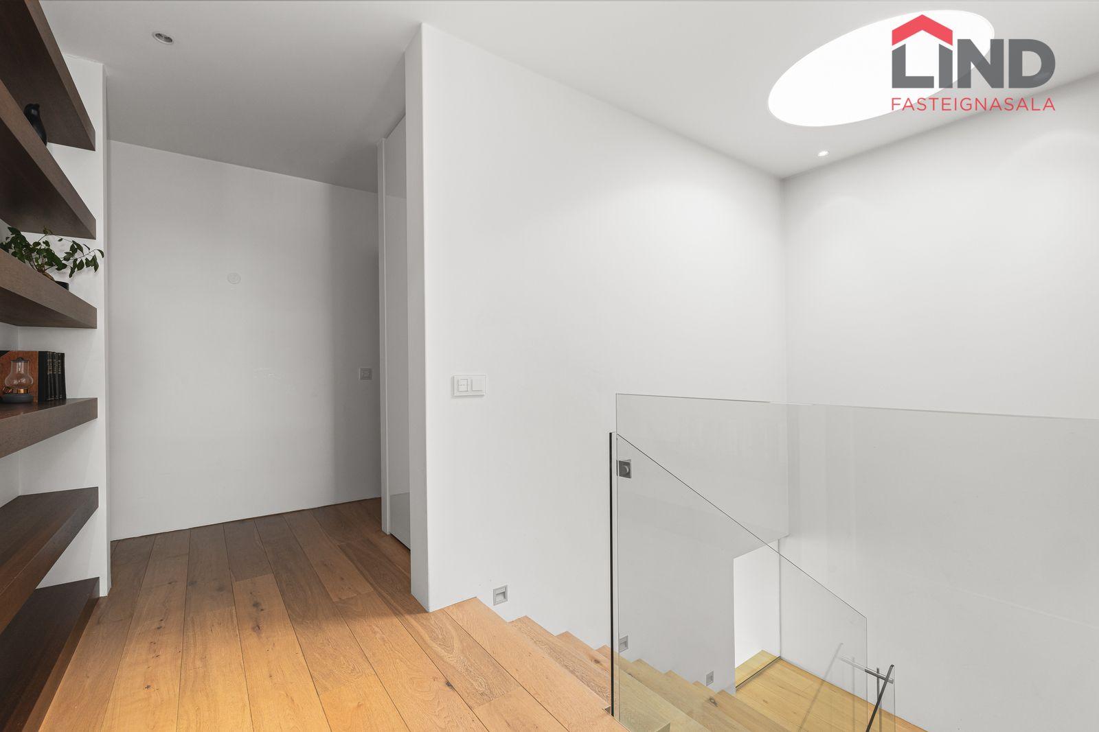 Vandað eikarplankaparket er á allri efri hæðinni, nema á baðherbergi þar sem eru granítflísar.