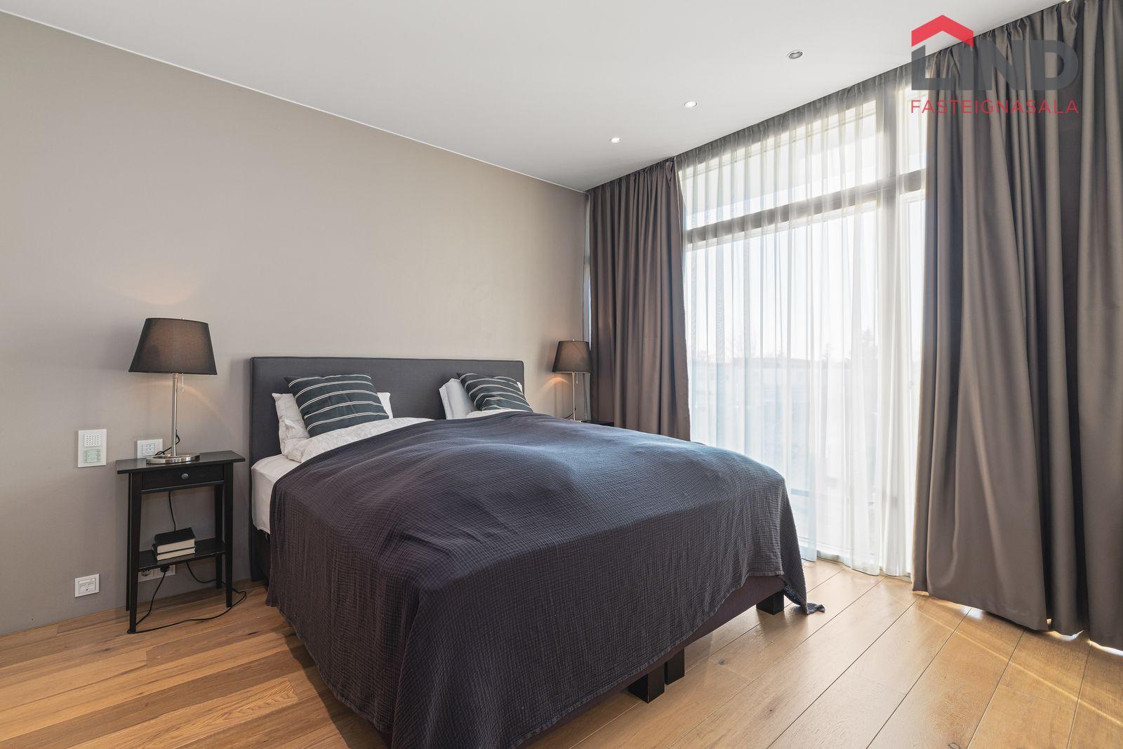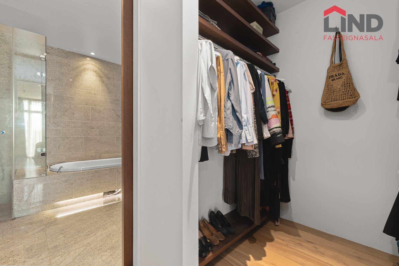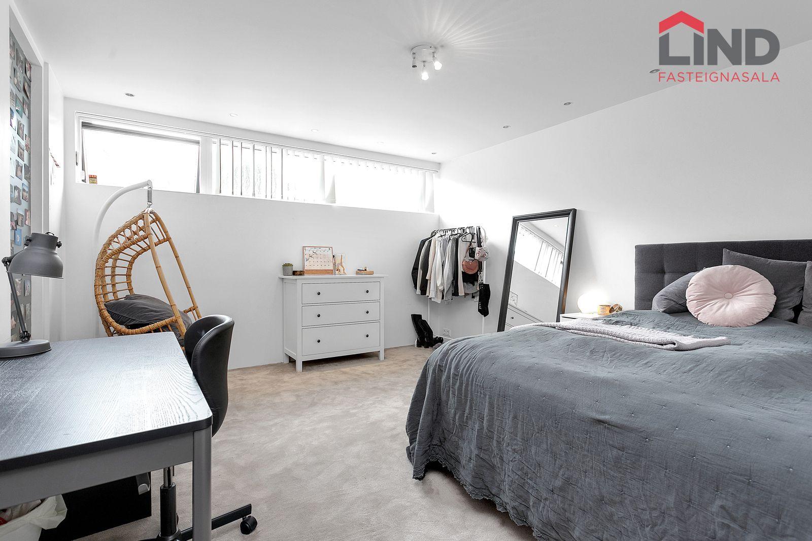 Rúmgott herbergi með útgengi á suðursvalir. Innangengt í fataherbergi með vönduðum innréttingum.