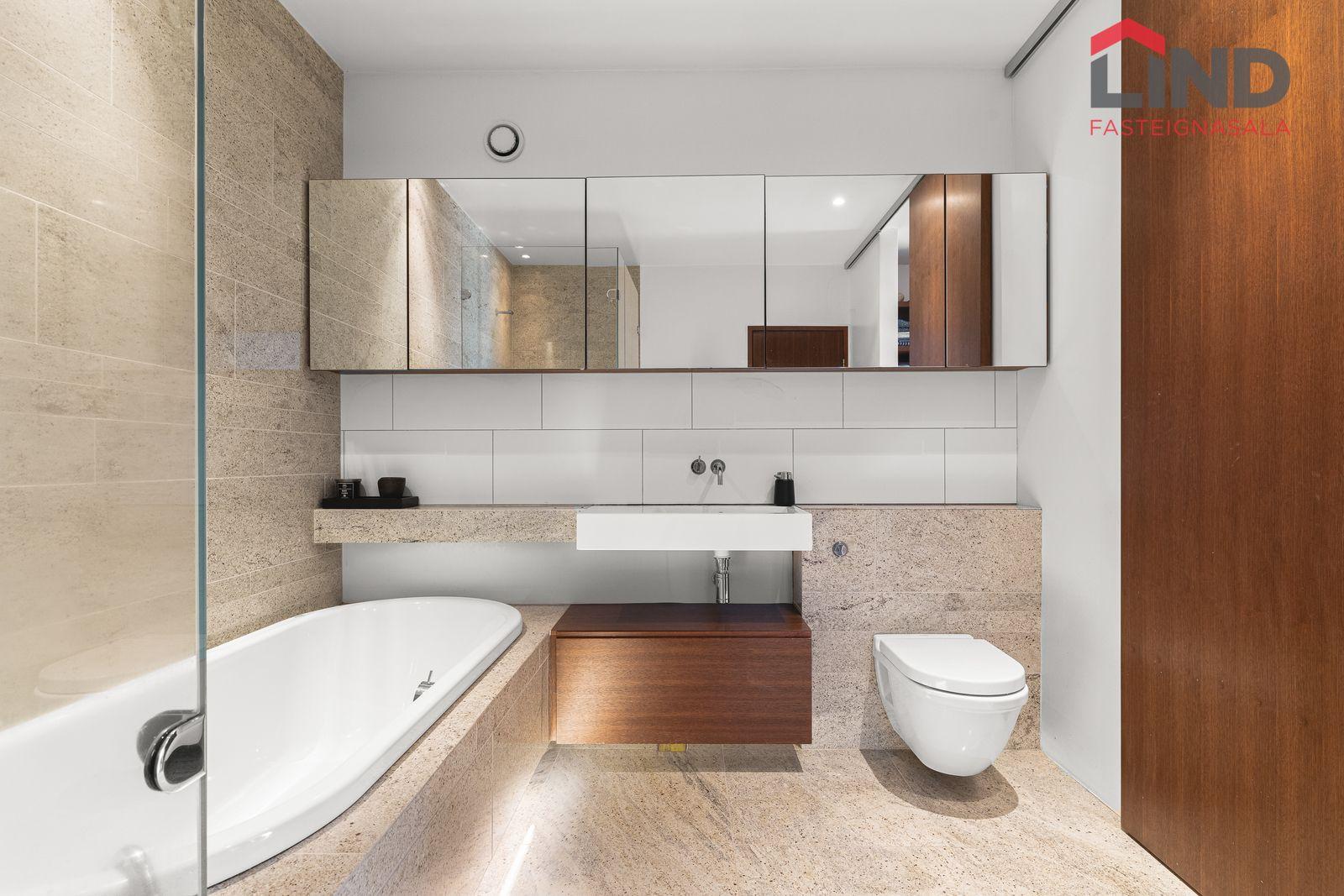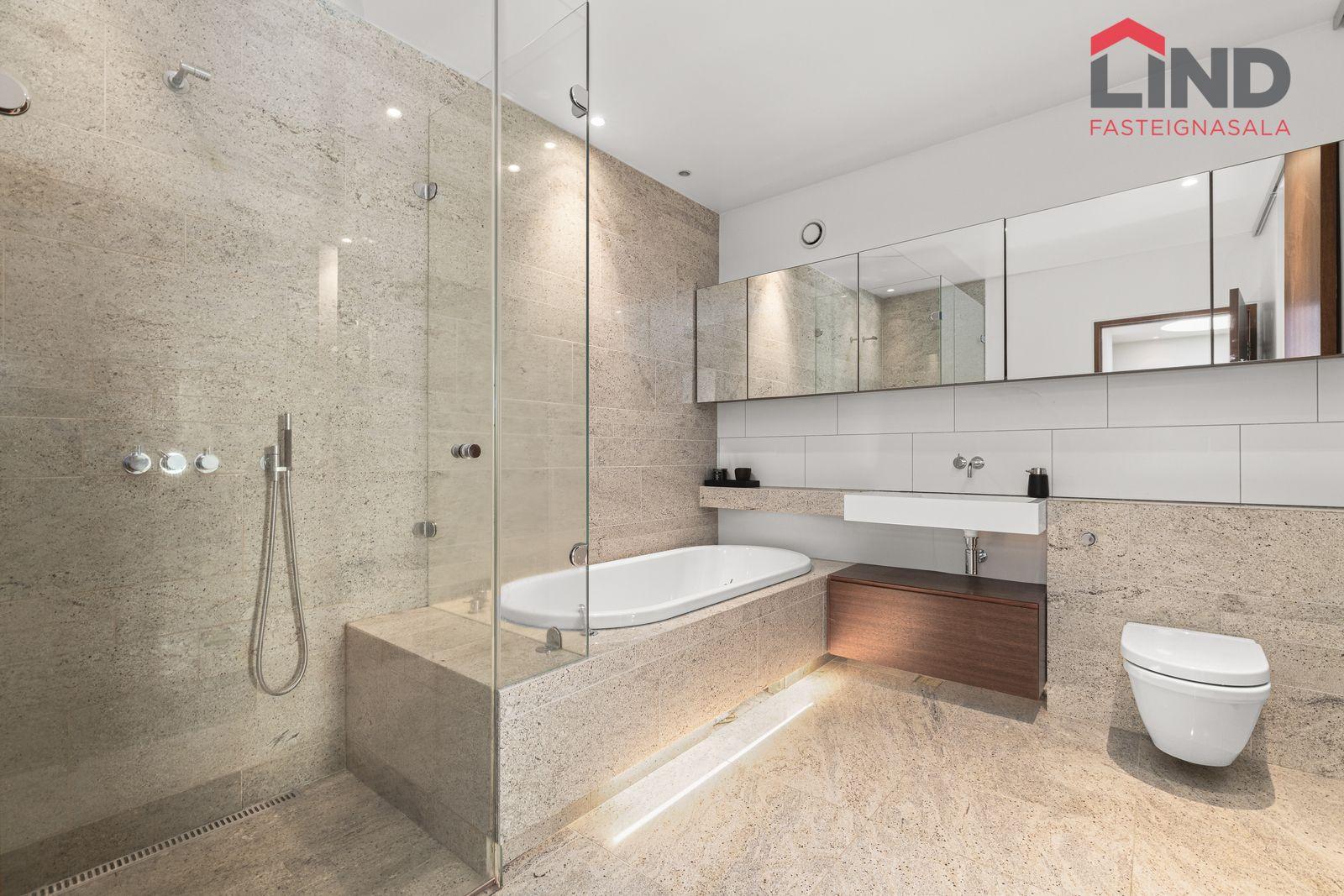 Granítflísar á veggjum og gólfi, baðkar með innfelldri lýsingu, stór flísalögð sturta, upphengt salerni og innrétting undir vaski með efri skápum.