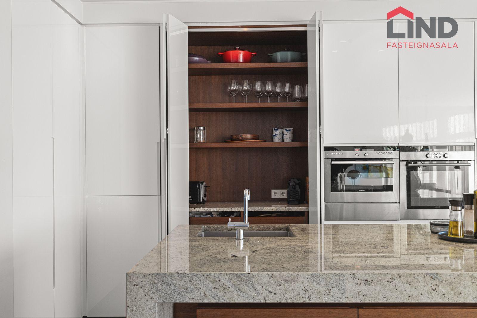 Allar innréttingar og hurðir í húsinu eru sérsmíðaðar og eru innréttingar og innra skipulag hannað af Rut Káradóttur.