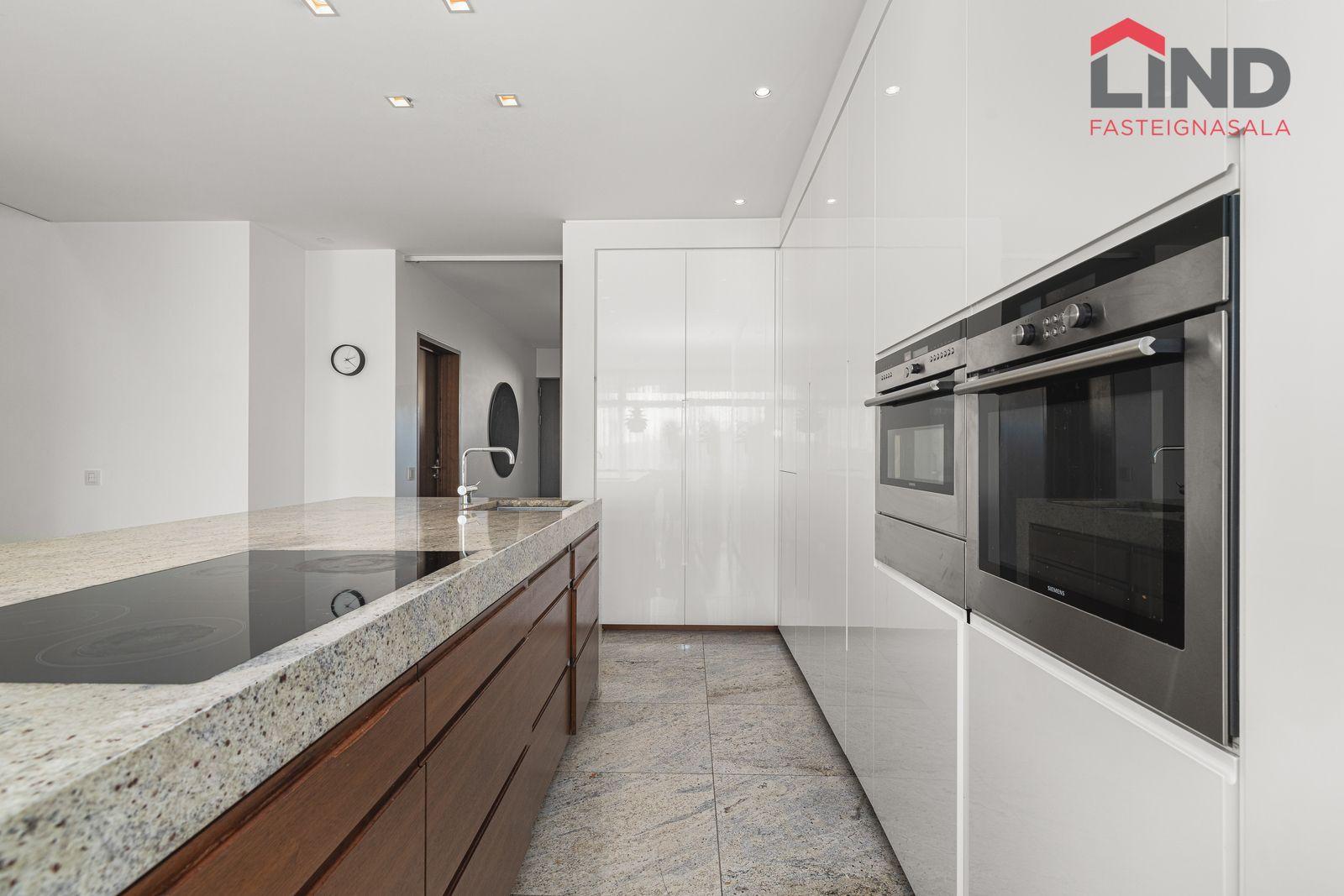 Upphengt salerni, granítflísar á gólfi og falleg innrétting.