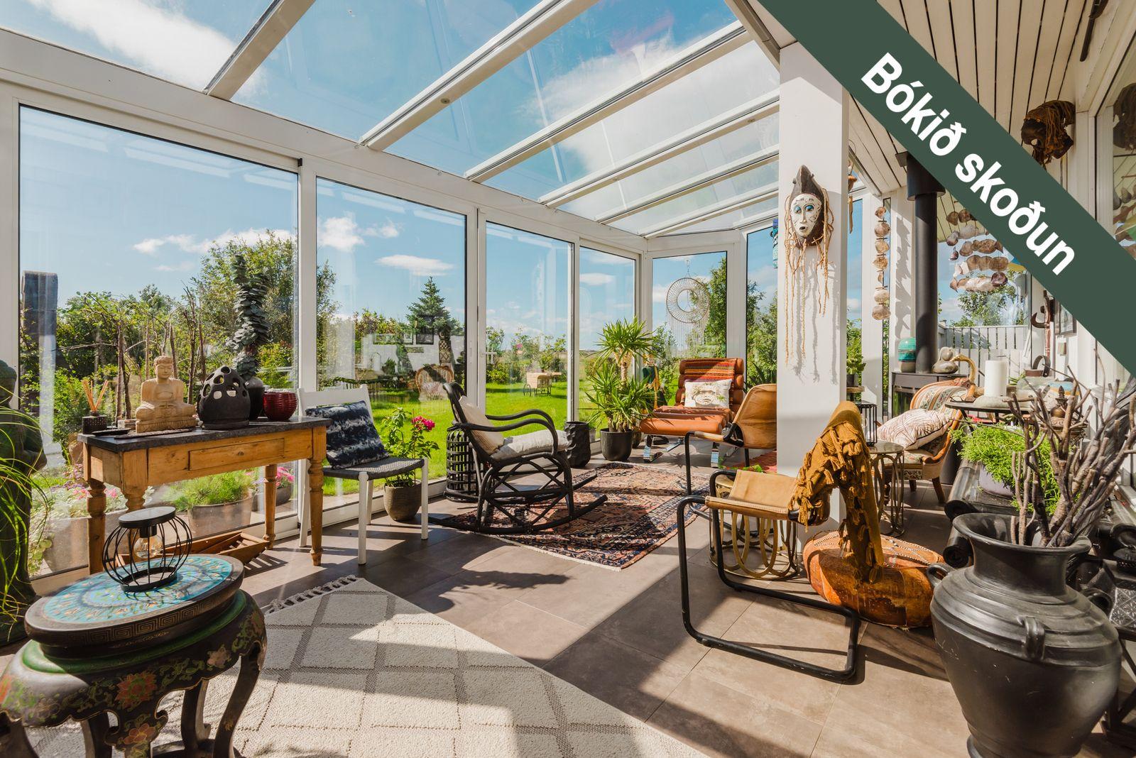 Heildarstærð eignarinnar er 224,4 fm og þar af er bílskúr 37fm sem hefur verið breytt í fullbúna íbúð – innkeyrsluhurð fjarlægð og settir gluggar til að nýta rýmið sem best. Allar innréttingar í bílskúr eru frá Brúnás. Við húsið var auk þess byggð glæsileg rúmgóð 23 fm sólstofa árið 2020 , flísalögð með gólfhita og kamínu, sem nýtist vel sem auka rými til dvalar með óviðjafnanlegu útsýni yfir náttúruna.