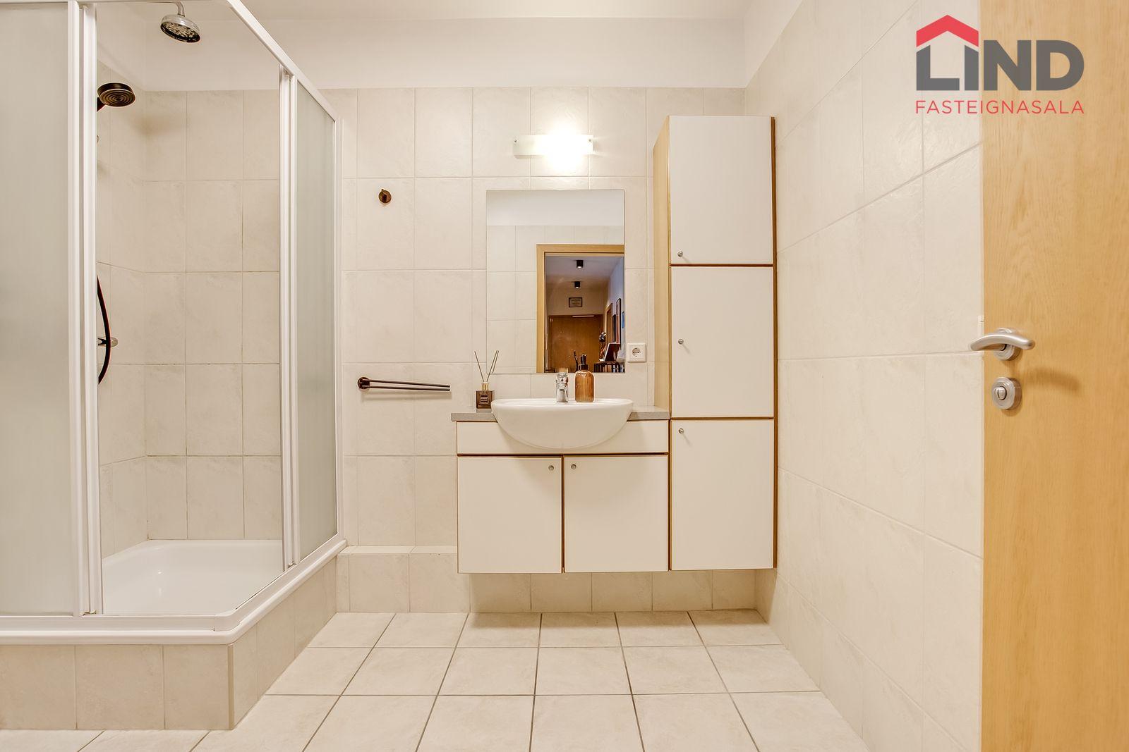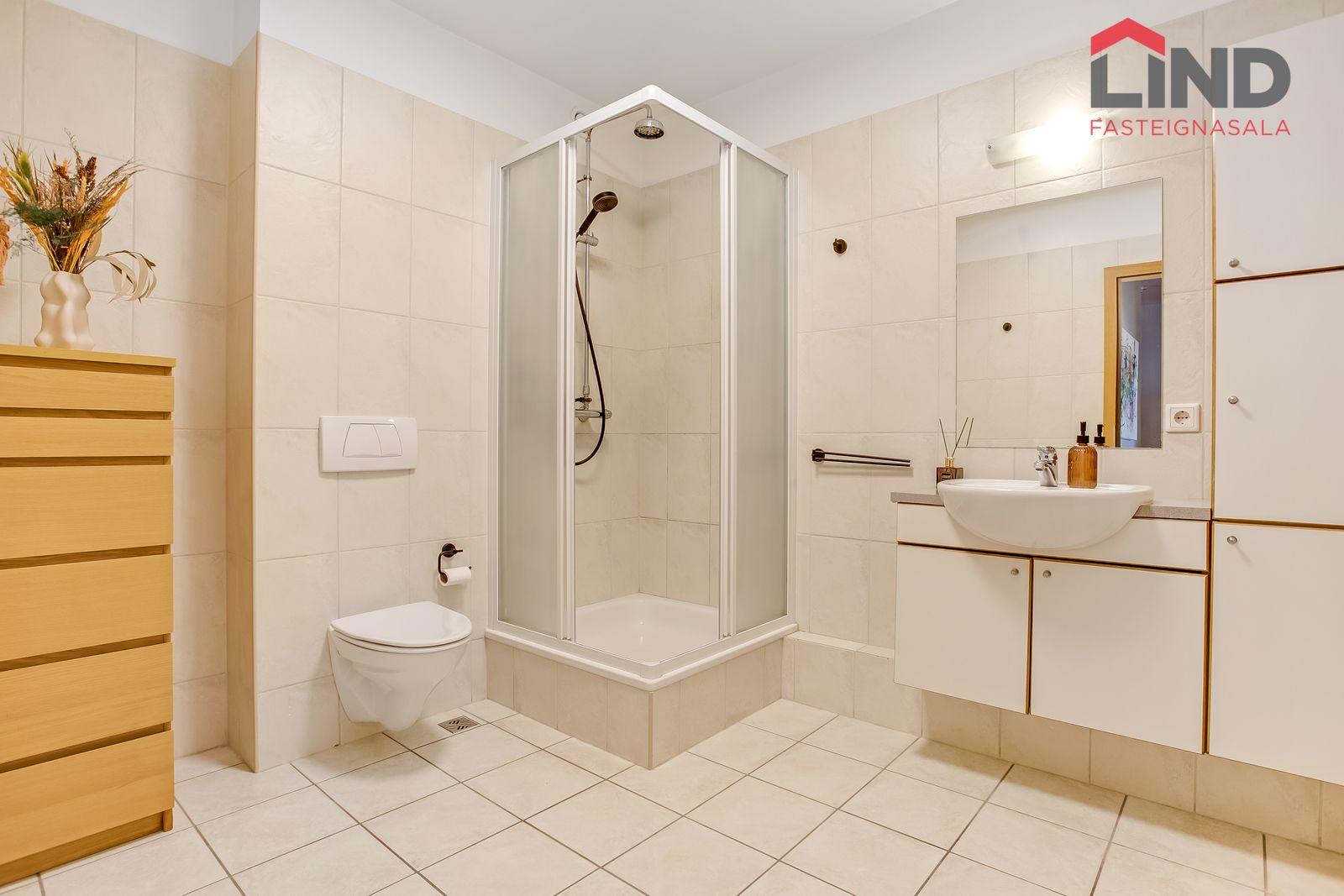 Baðherbergið er mjög rúmgott með innréttingu undir og við handlaug, sturtuklefa, upphengdu salerni, ofni og flísum á gólfi og veggjum að mestu.
