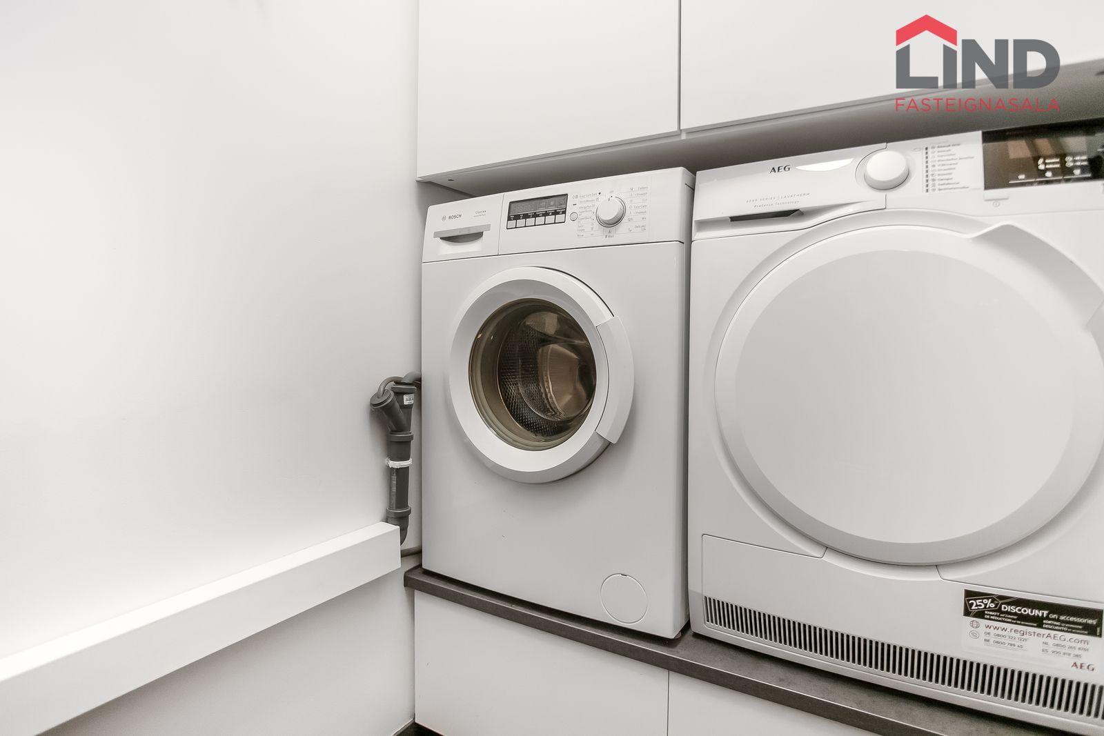 Þvottahús er innan eldhús með flísum á gólfi. Aðstaða fyrir þvottavél í vinnuhæð. Létt innrétting undir og við þvottavél. Stálvaskur.