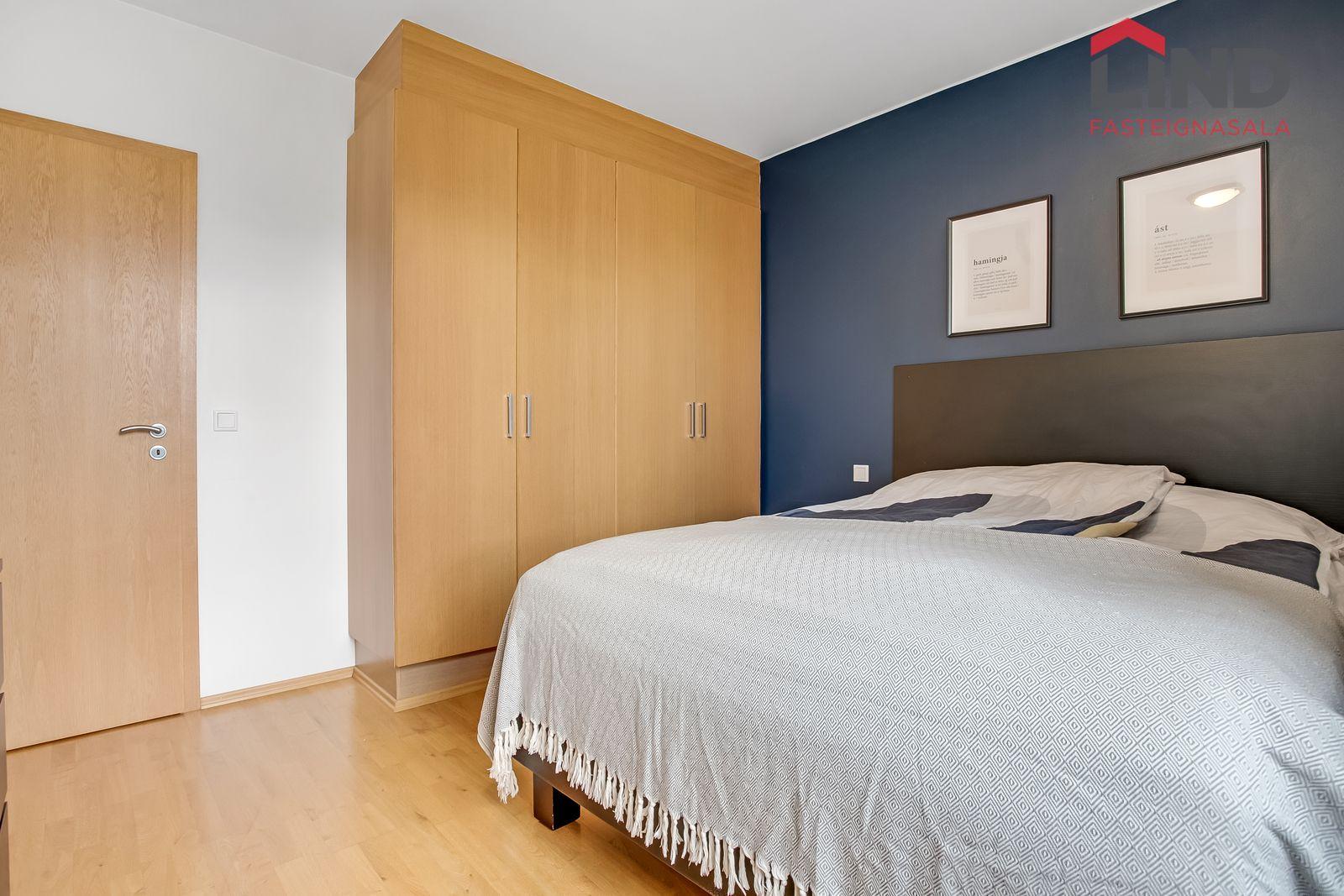 Svefnherbergin er þrjú með fataskápum og parketi á gólfi.