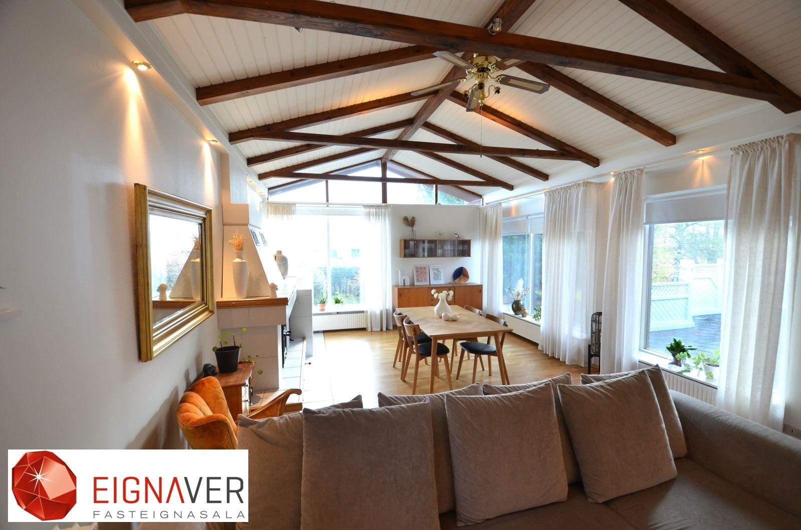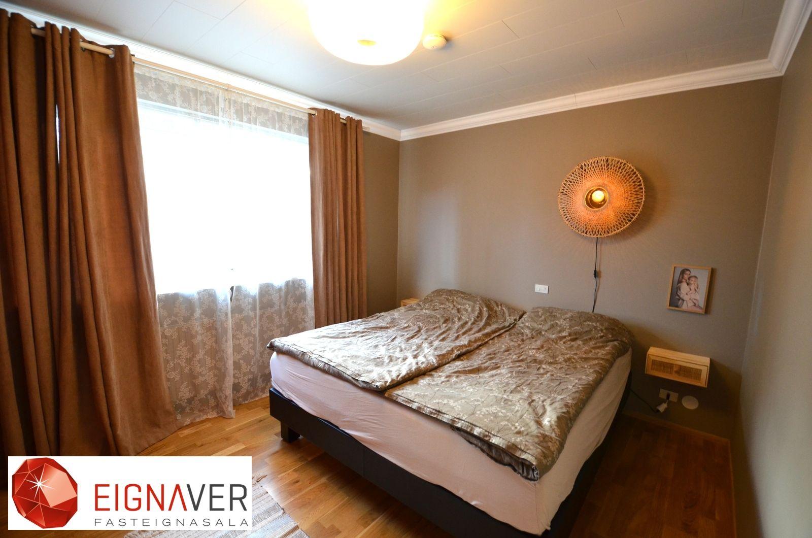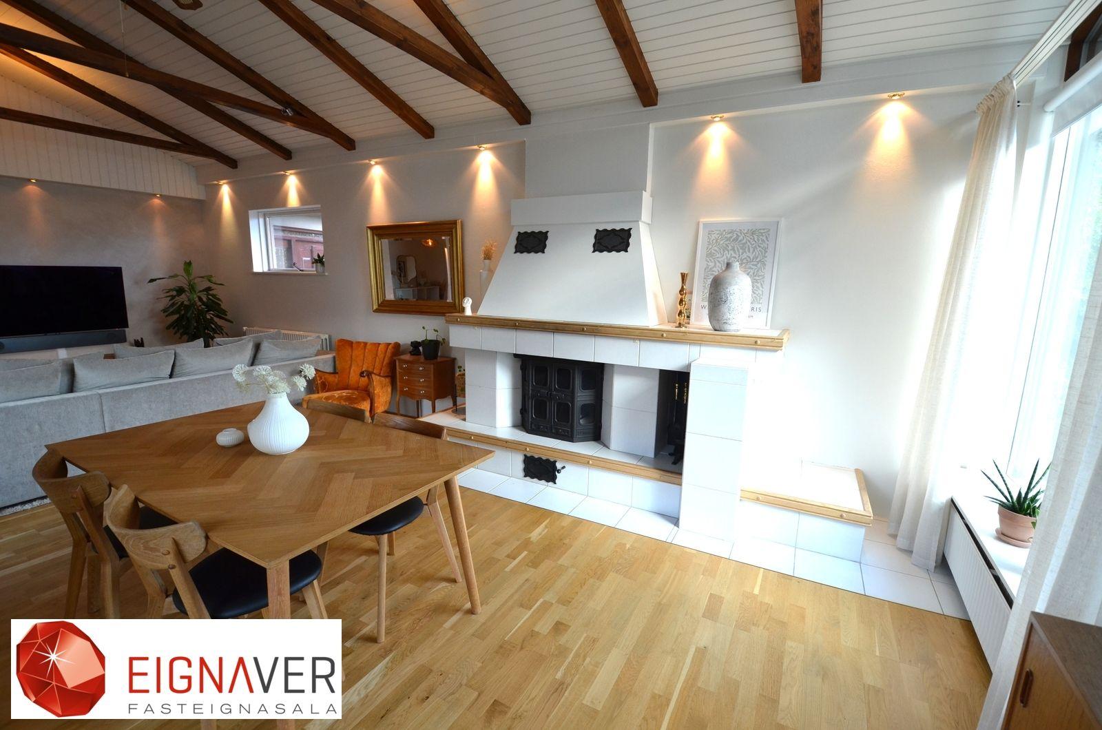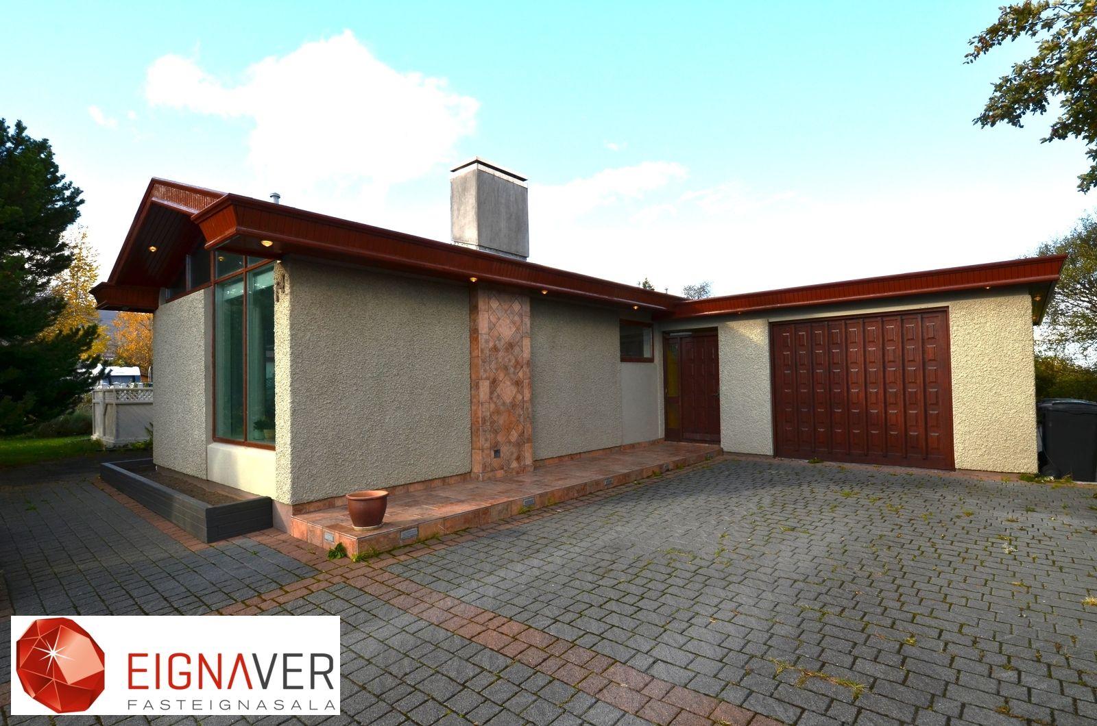 Nánari lýsing: Forstofa flísar á gólfi, skápar. Svefnherbergisgangur er með parketi á góli. Svefnherbergin eru fjögur í húsinu, öll með parketi á gólfi og fataskápar í tveimur herbergjum. Stofa/borðstofa koma saman, parket á gólfi, fallegur arinn er í stofu. Björt og rúmgóð stofa með aukinni lofthæð. Baðherbergið er rúmgott og fínt, flísar á gólfi. Góð innrétting, sturta og baðkar sér. Gluggi með opnanlegu fagi. Eldhús, fín innrétting, flísar á gólfi og á milli skápa. Gólfhiti er í eldhúsi. Gengið er út á verönd og þar er skemmtilegt glerskýli. Bakinngangur er á milli og íbúðar og bílskúrs, flísar á gólfi og fataskápur í enda. Þvottahúsgangur er við bakinngang þar er fín innrétting. Frá þessu rými er fellistigi upp á geymsluloft. Snyrting er við bakinngang, flísar á gólfi og veggjum. Bílskúr, rúmgóður bílskúr, lakkað gólf þar.