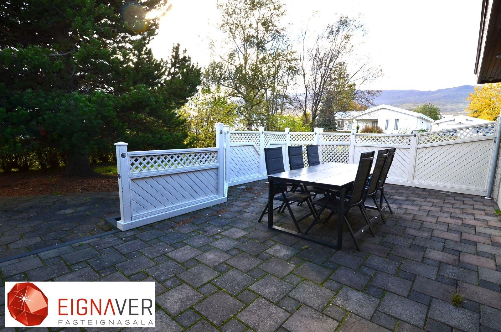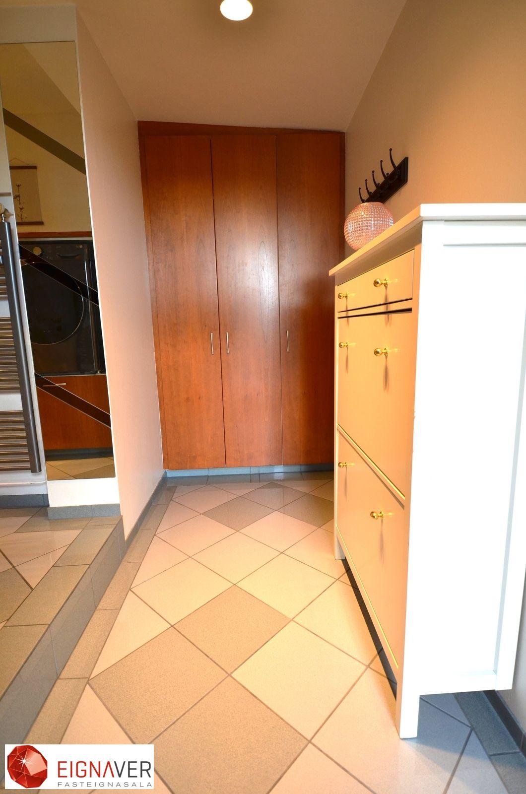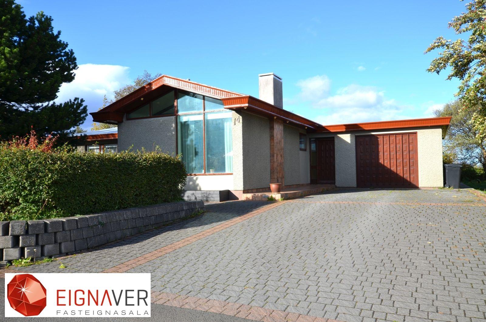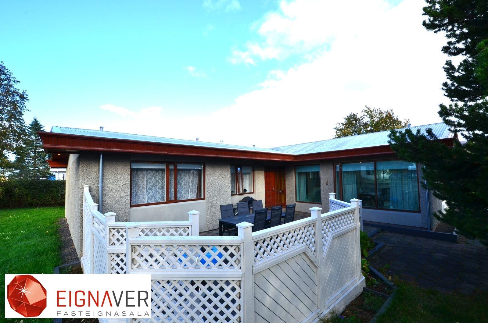 Nánari lýsing: Forstofa flísar á gólfi, skápar. Svefnherbergisgangur er með parketi á góli. Svefnherbergin eru fjögur í húsinu, öll með parketi á gólfi og fataskápar í tveimur herbergjum. Stofa/borðstofa koma saman, parket á gólfi, fallegur arinn er í stofu. Björt og rúmgóð stofa með aukinni lofthæð. Baðherbergið er rúmgott og fínt, flísar á gólfi. Góð innrétting, sturta og baðkar sér. Gluggi með opnanlegu fagi. Eldhús, fín innrétting, flísar á gólfi og á milli skápa. Gólfhiti er í eldhúsi. Gengið er út á verönd og þar er skemmtilegt glerskýli. Bakinngangur er á milli og íbúðar og bílskúrs, flísar á gólfi og fataskápur í enda. Þvottahúsgangur er við bakinngang þar er fín innrétting. Frá þessu rými er fellistigi upp á geymsluloft. Snyrting er við bakinngang, flísar á gólfi og veggjum. Bílskúr, rúmgóður bílskúr, lakkað gólf þar.