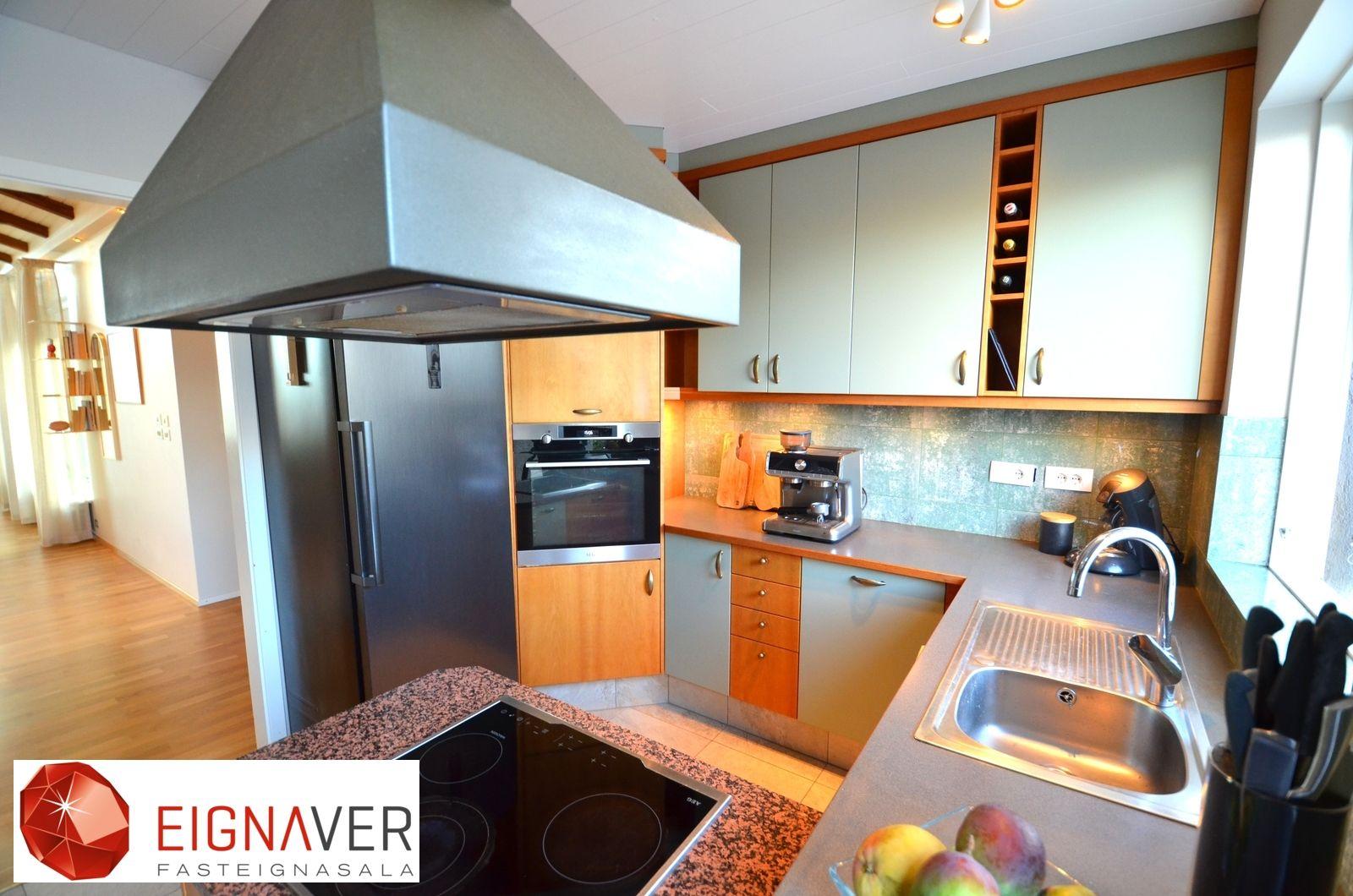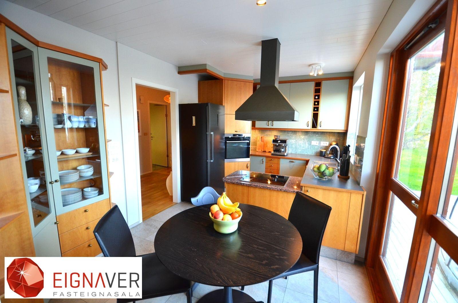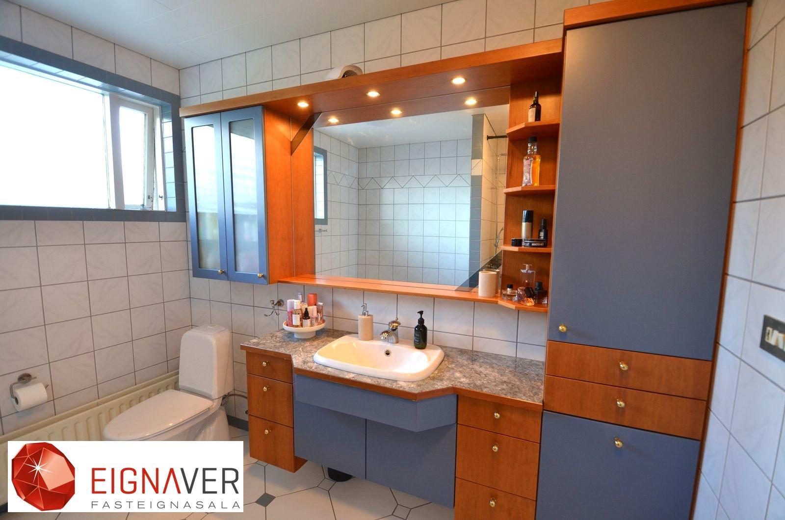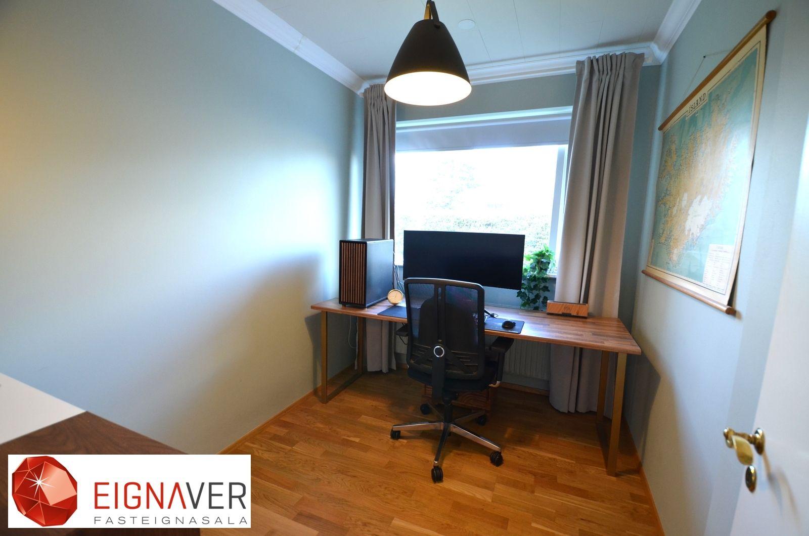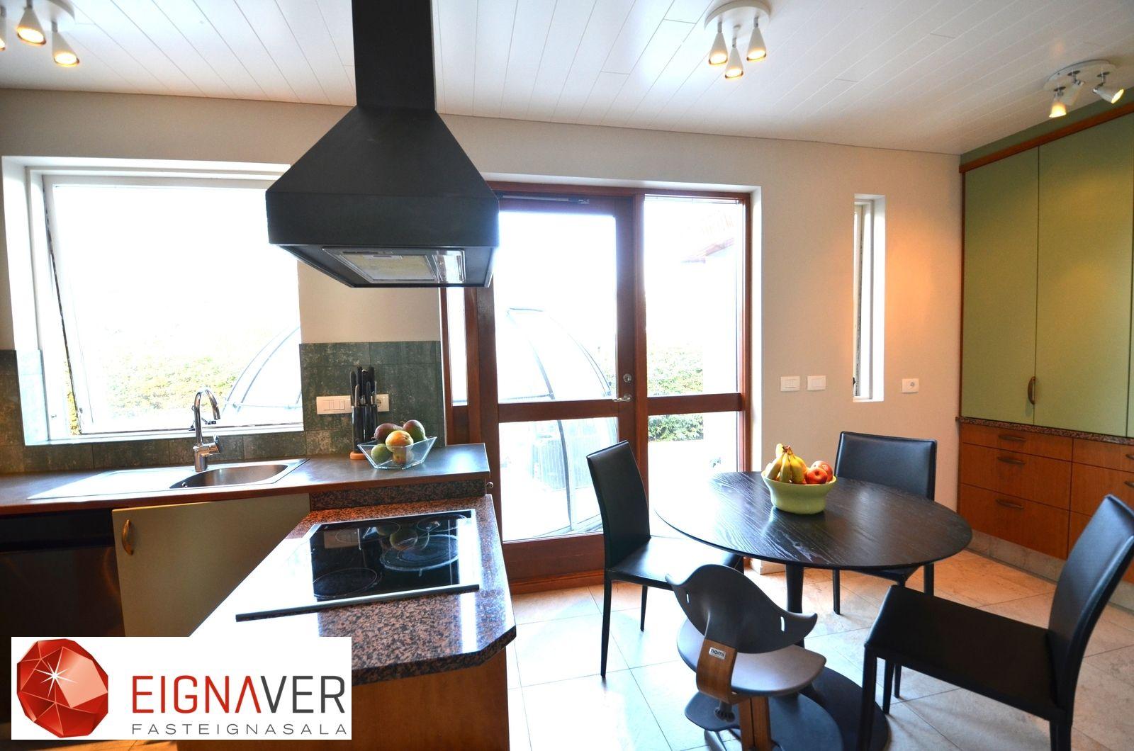 Nánari lýsing: Forstofa flísar á gólfi, skápar. Svefnherbergisgangur er með parketi á góli. Svefnherbergin eru fjögur í húsinu, öll með parketi á gólfi og fataskápar í tveimur herbergjum. Stofa/borðstofa koma saman, parket á gólfi, fallegur arinn er í stofu. Björt og rúmgóð stofa með aukinni lofthæð. Baðherbergið er rúmgott og fínt, flísar á gólfi. Góð innrétting, sturta og baðkar sér. Gluggi með opnanlegu fagi. Eldhús, fín innrétting, flísar á gólfi og á milli skápa. Gólfhiti er í eldhúsi. Gengið er út á verönd og þar er skemmtilegt glerskýli. Bakinngangur er á milli og íbúðar og bílskúrs, flísar á gólfi og fataskápur í enda. Þvottahúsgangur er við bakinngang þar er fín innrétting. Frá þessu rými er fellistigi upp á geymsluloft. Snyrting er við bakinngang, flísar á gólfi og veggjum. Bílskúr, rúmgóður bílskúr, lakkað gólf þar.