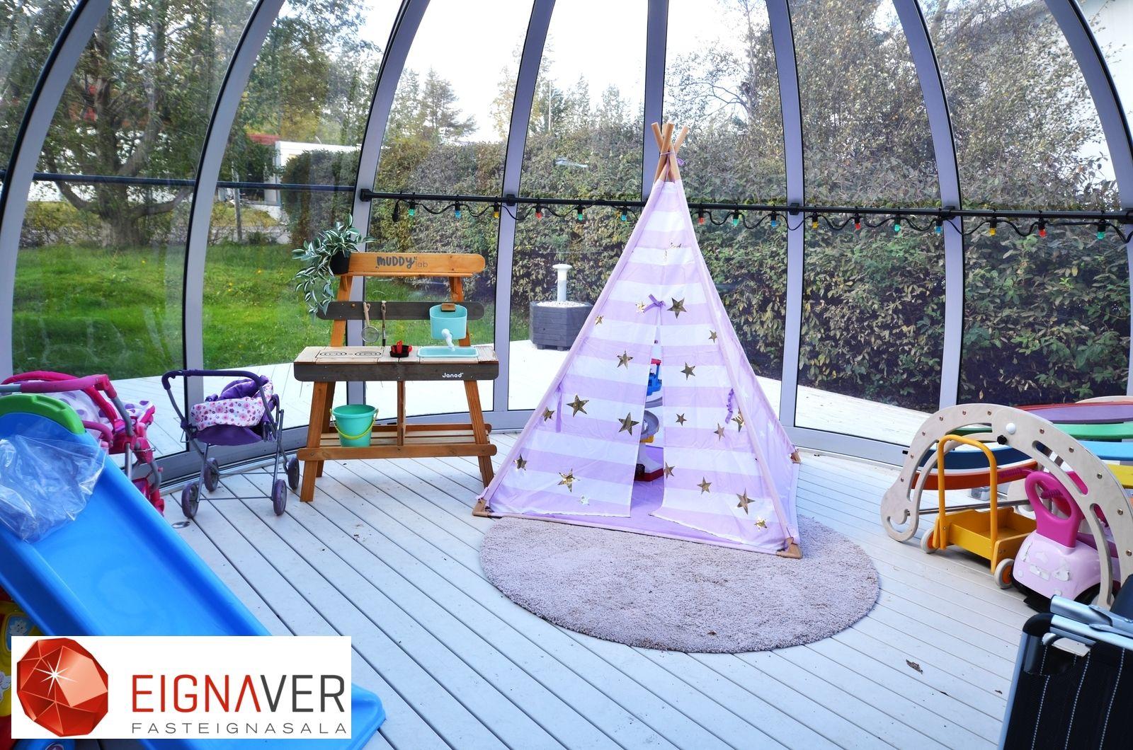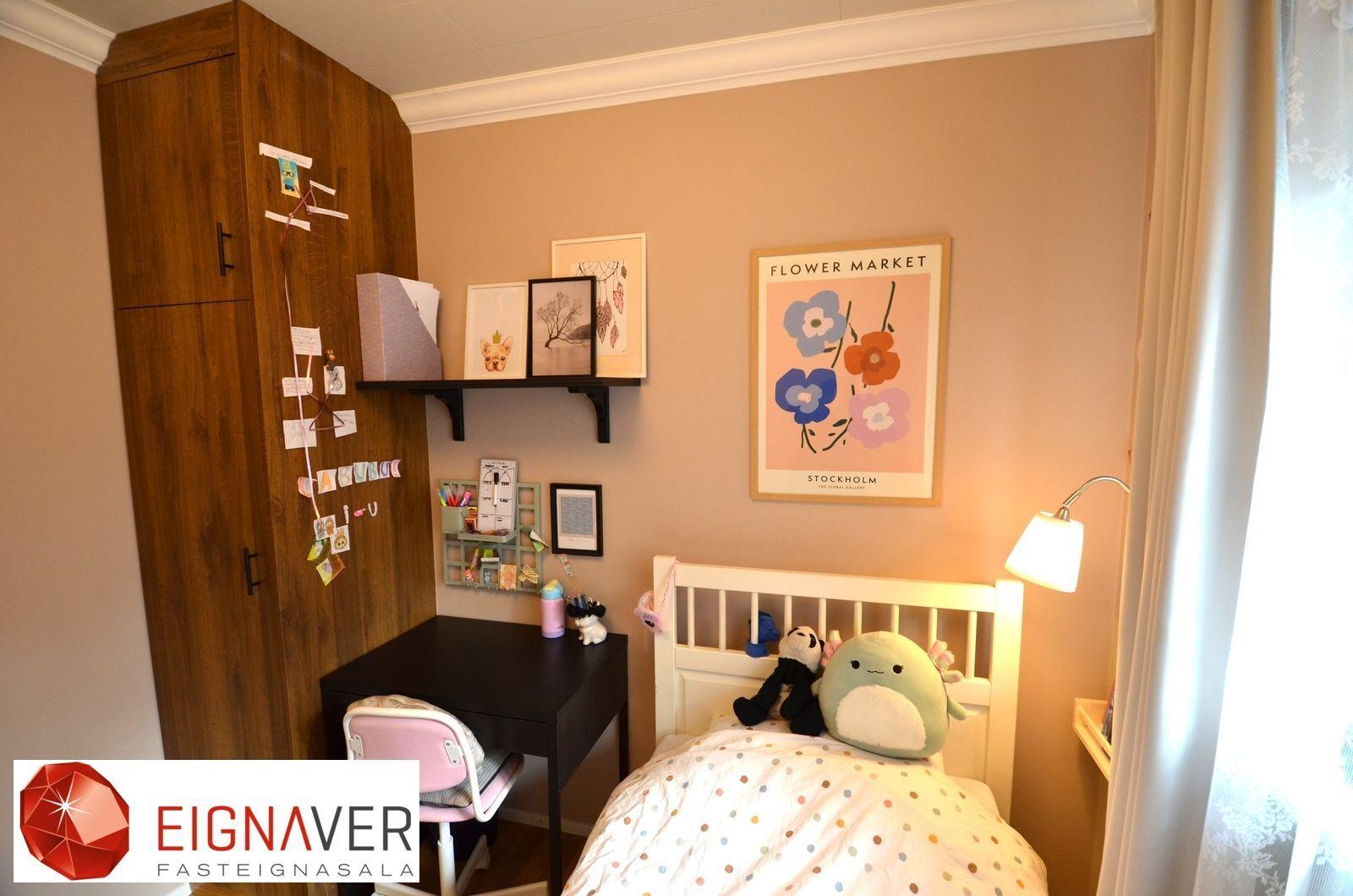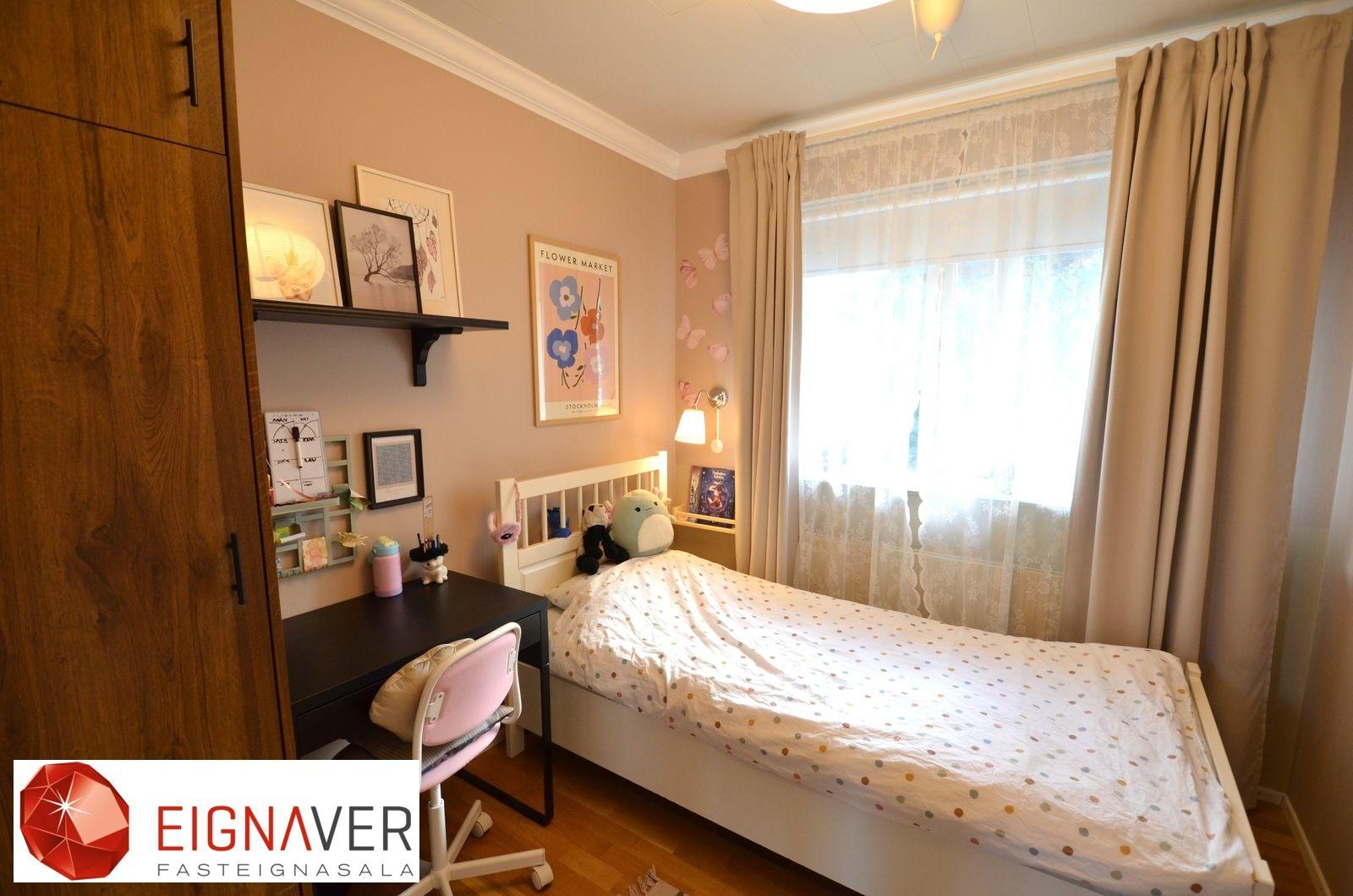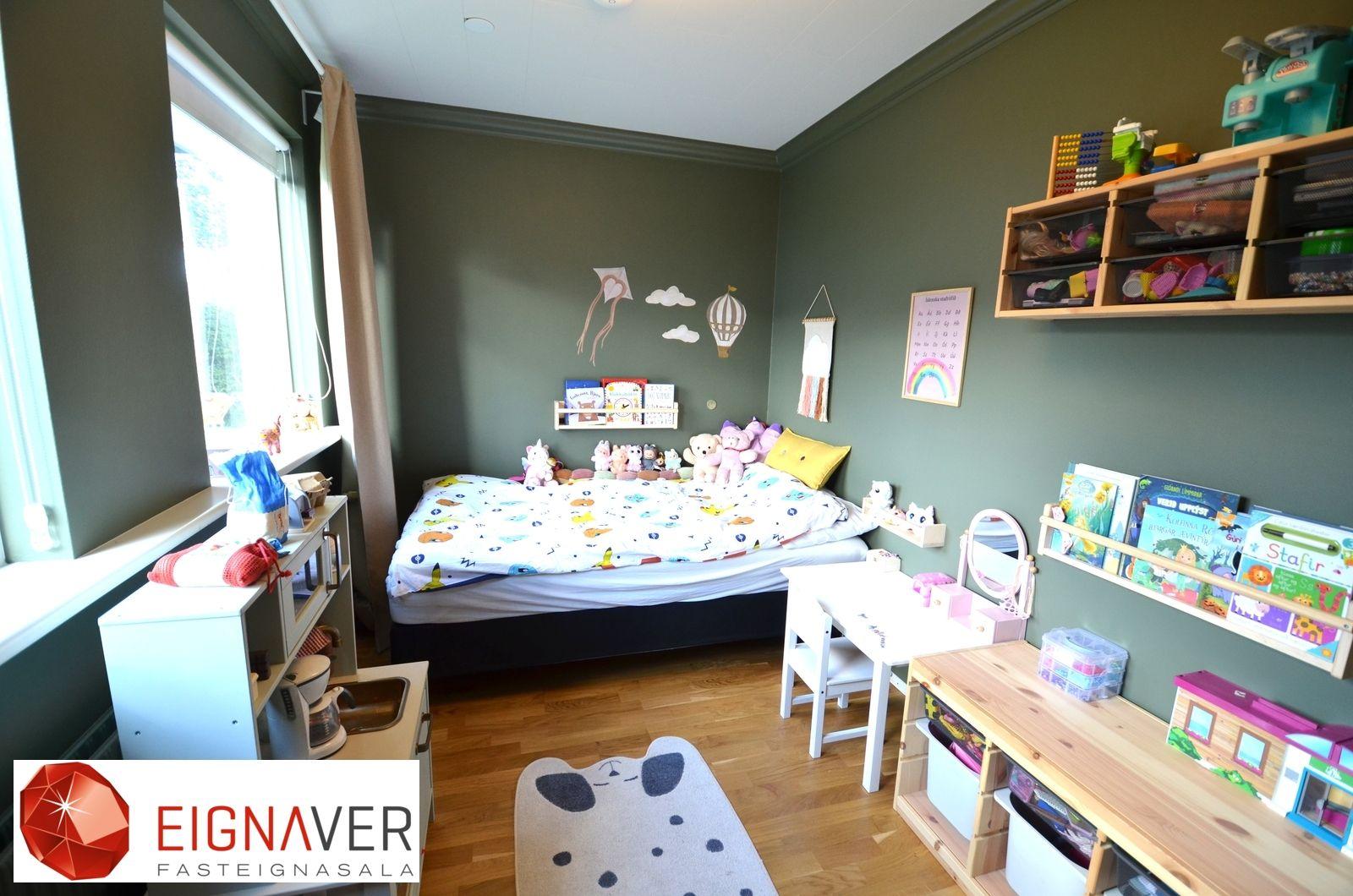 Nánari lýsing: Forstofa flísar á gólfi, skápar. Svefnherbergisgangur er með parketi á góli. Svefnherbergin eru fjögur í húsinu, öll með parketi á gólfi og fataskápar í tveimur herbergjum. Stofa/borðstofa koma saman, parket á gólfi, fallegur arinn er í stofu. Björt og rúmgóð stofa með aukinni lofthæð. Baðherbergið er rúmgott og fínt, flísar á gólfi. Góð innrétting, sturta og baðkar sér. Gluggi með opnanlegu fagi. Eldhús, fín innrétting, flísar á gólfi og á milli skápa. Gólfhiti er í eldhúsi. Gengið er út á verönd og þar er skemmtilegt glerskýli. Bakinngangur er á milli og íbúðar og bílskúrs, flísar á gólfi og fataskápur í enda. Þvottahúsgangur er við bakinngang þar er fín innrétting. Frá þessu rými er fellistigi upp á geymsluloft. Snyrting er við bakinngang, flísar á gólfi og veggjum. Bílskúr, rúmgóður bílskúr, lakkað gólf þar.