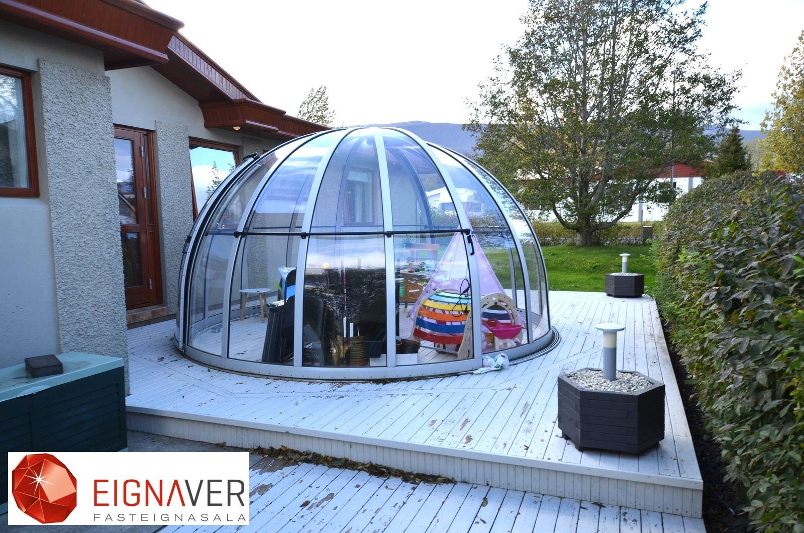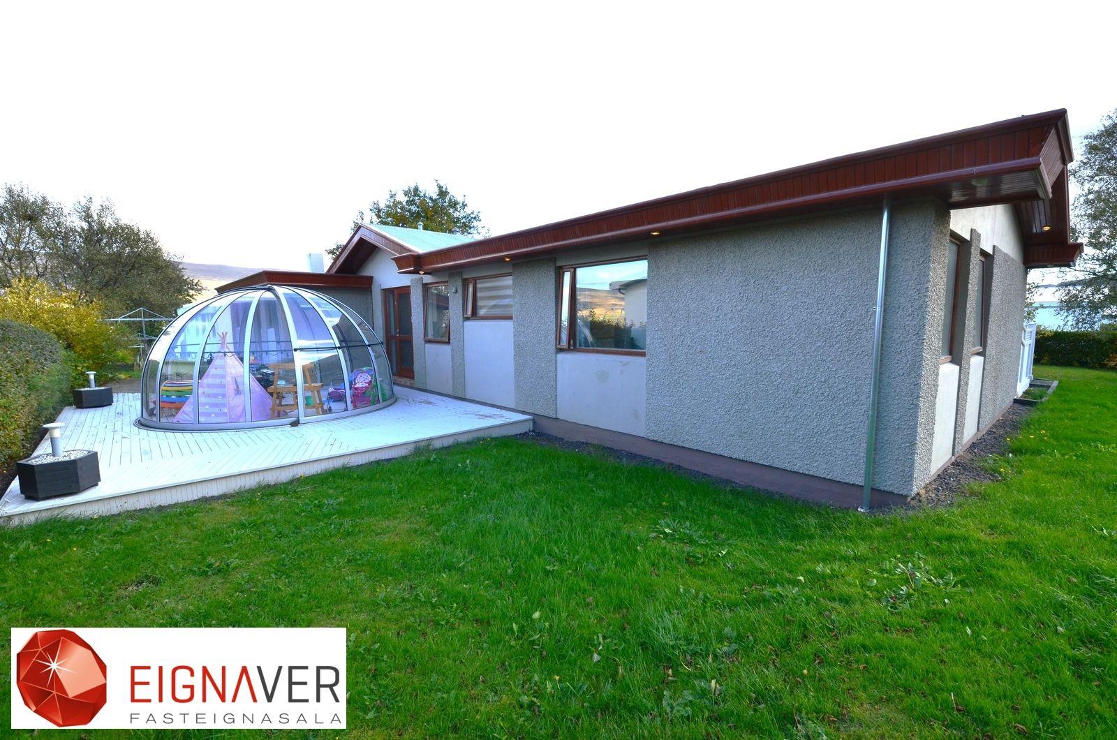 Mánahlíð 14 Akureyri. Fallegt 5 herbergja einbýlishús á einni hæð ásamt innbyggðum bílskúr. Samtals er húseignin 181,2 fm. Glerskýli á verönd. Hiti í plani fyrir framan bílskúr. Íbúð 135,8 fm. Bílskúr 45,4 fm.