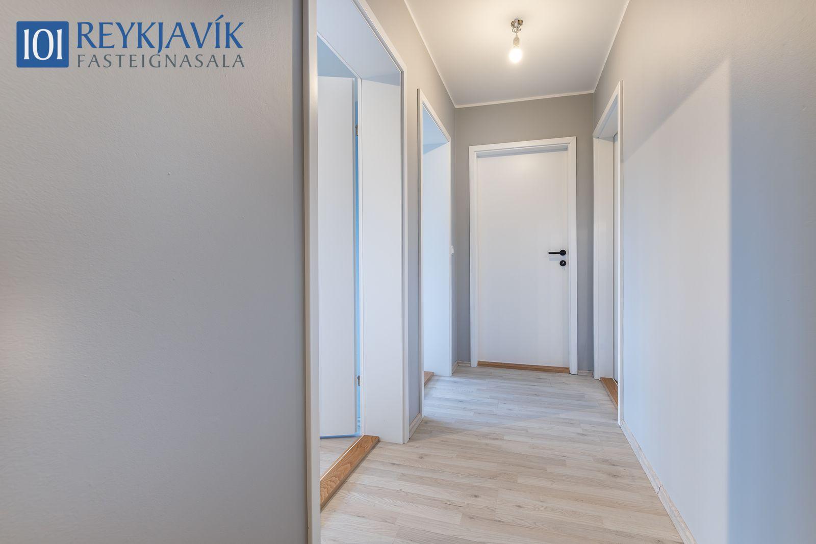 Lýsing eignar: Forstofa parketlögð og með nýjum fataskáp. Tvö svefnherbergi hlið við hlið á gangi parketlögð og með nýjum fataskápum. Baðherbergi, flísalagt gólf og veggir, baðkar/sturta, ný neðri baðinnrétting með handlaug og skúffum undir. Efri skápar og spegill með lýsingu fyrir ofan. Rúmgott þvottahús er í enda gangs, dúklagt gólf og stór innrétting með efri og neðri skápum og rúmgóðu borði. Tenging er þar fyrir þvottavél og þurrkara.