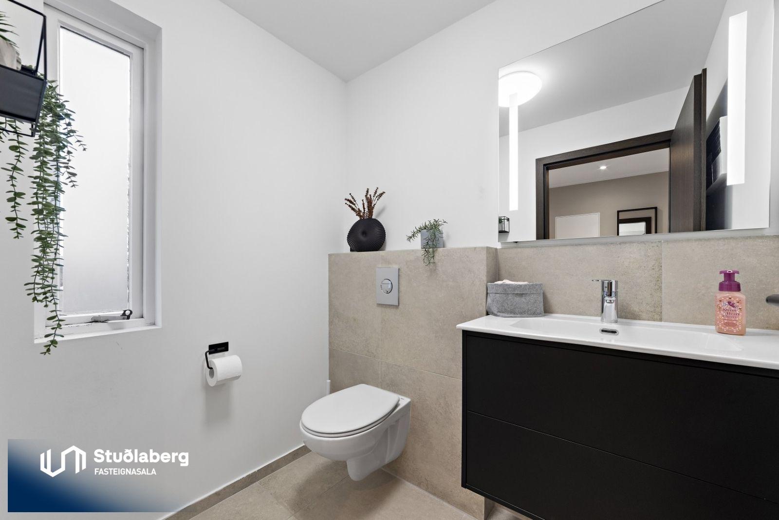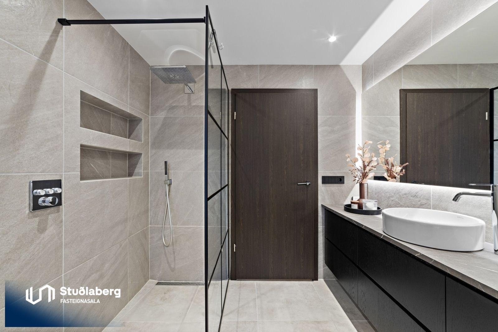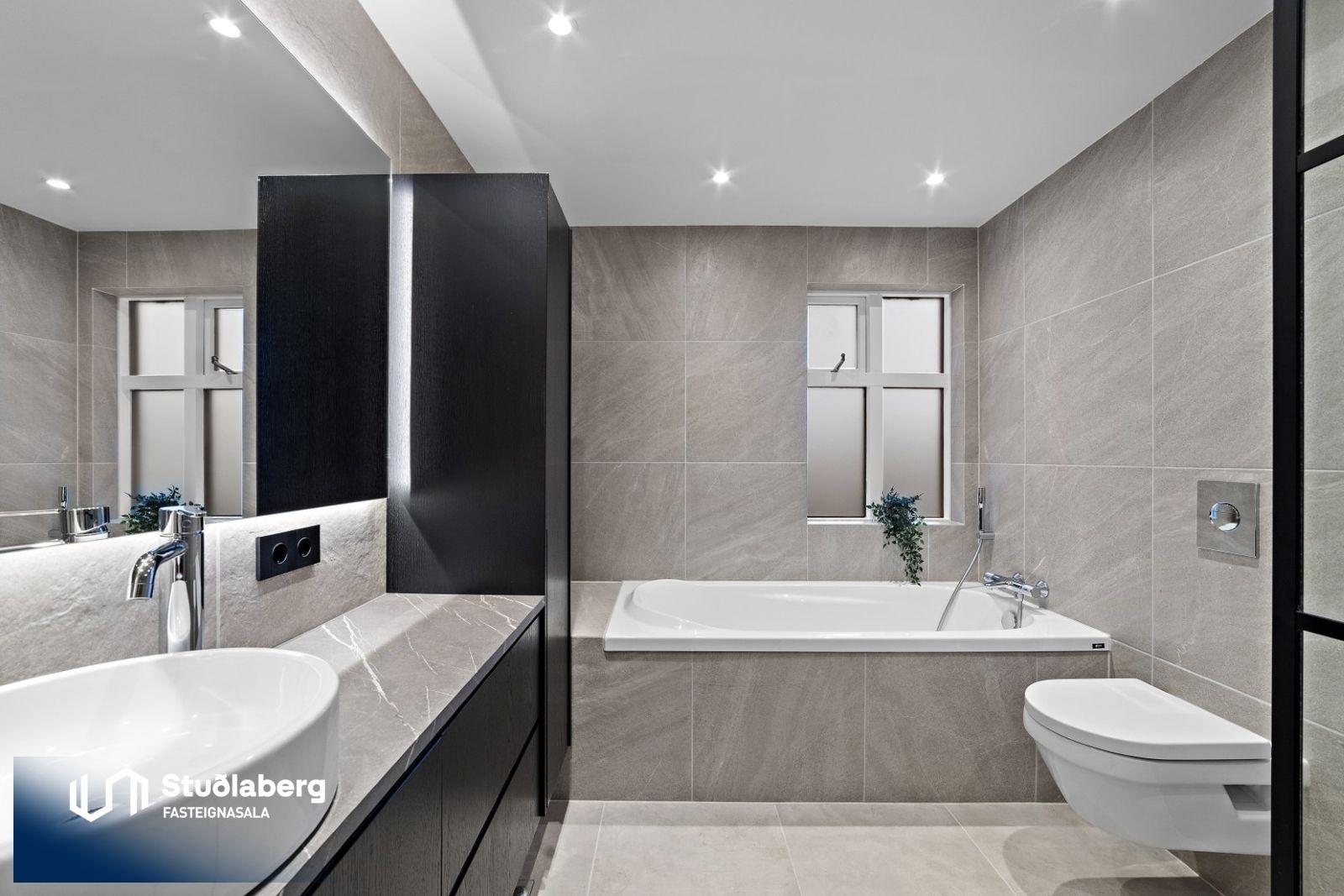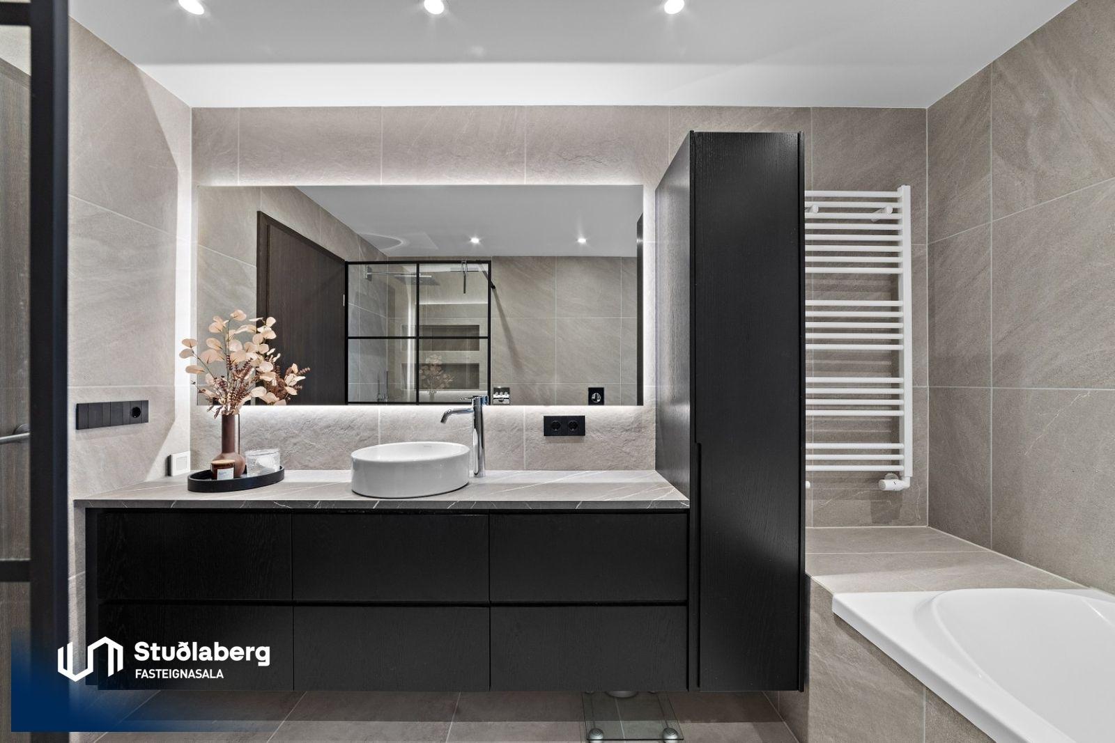 Á baðherbergi eru flísar á gólfi og á veggjum, þar er góð innrétting, upphengt salerni, handklæðaofn, sturtuaðstaða stúkuð af með gleri og baðkar.