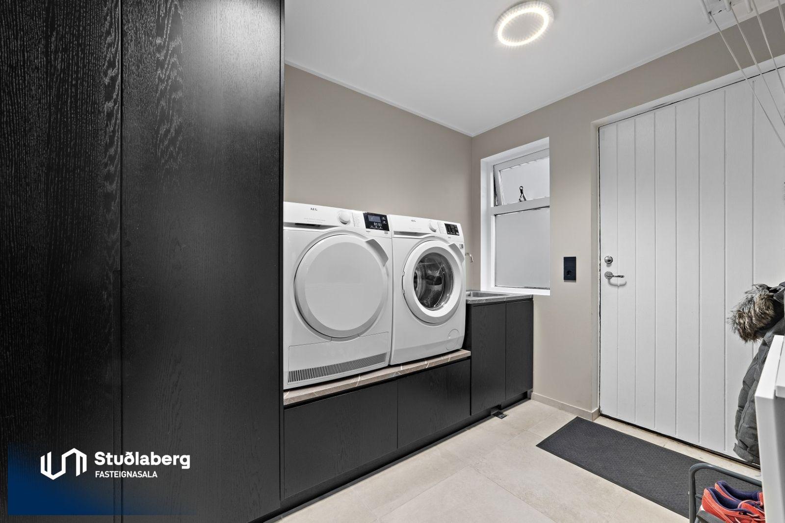 Þvottahús er inn af eldhúsi, þar eru flísar á gólfi, góð innrétting með aðstöðu fyrir þvottavél og þurrkara og hurð er út á plan.