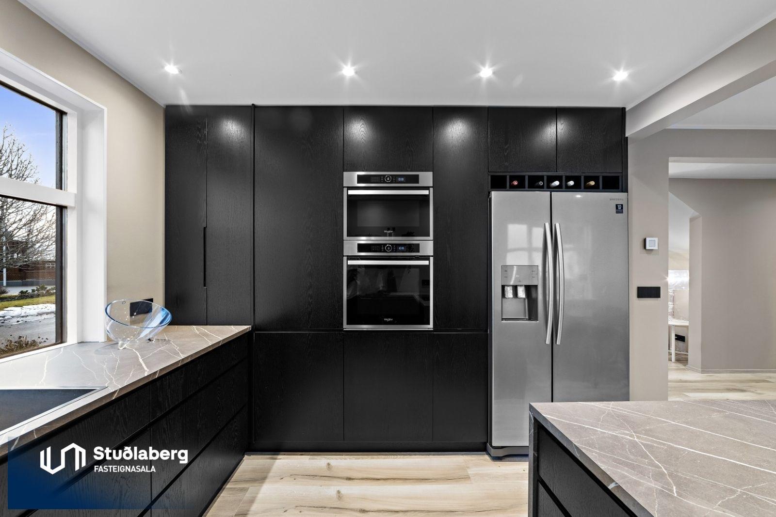 Eldhús hefur parket á gólfi, þar er vegleg innrétting og góð tæki, ofn, helluborð og vifta.