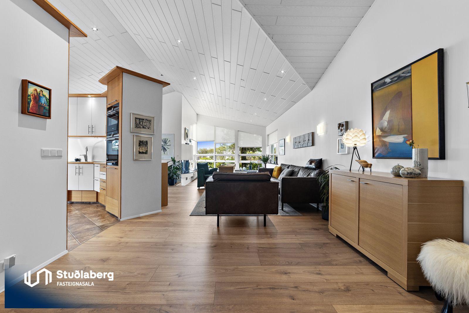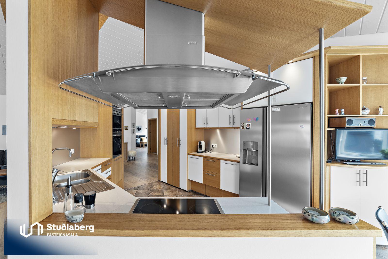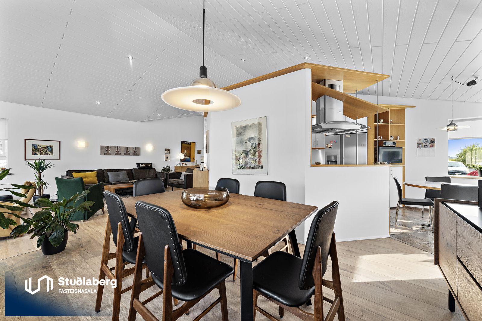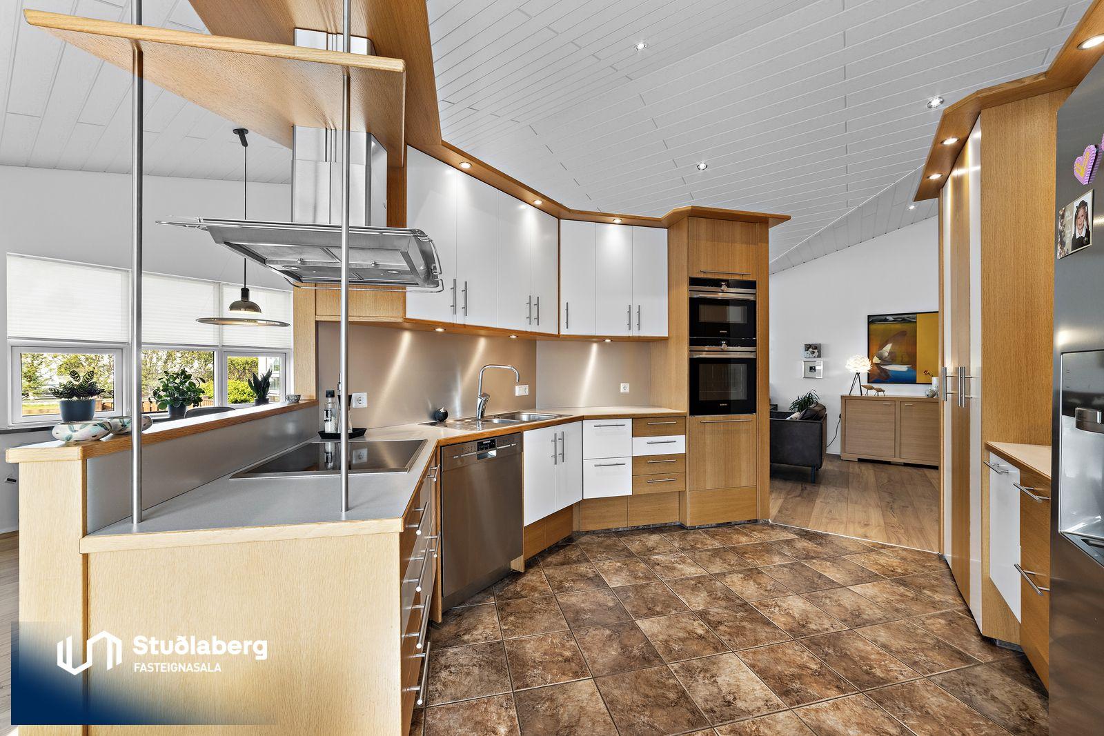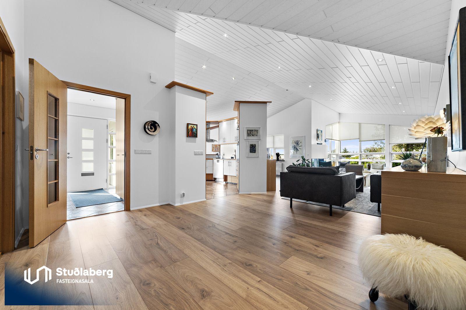 Eignin skiptist í anddyri, fimm svefnherbergi, tvö baðherbergi, eldhús, stofu, borðstofu, þvottahús og bílskúr. Einstök hönnun, sérsmíðaðar innréttingar og aukin lofthæð.