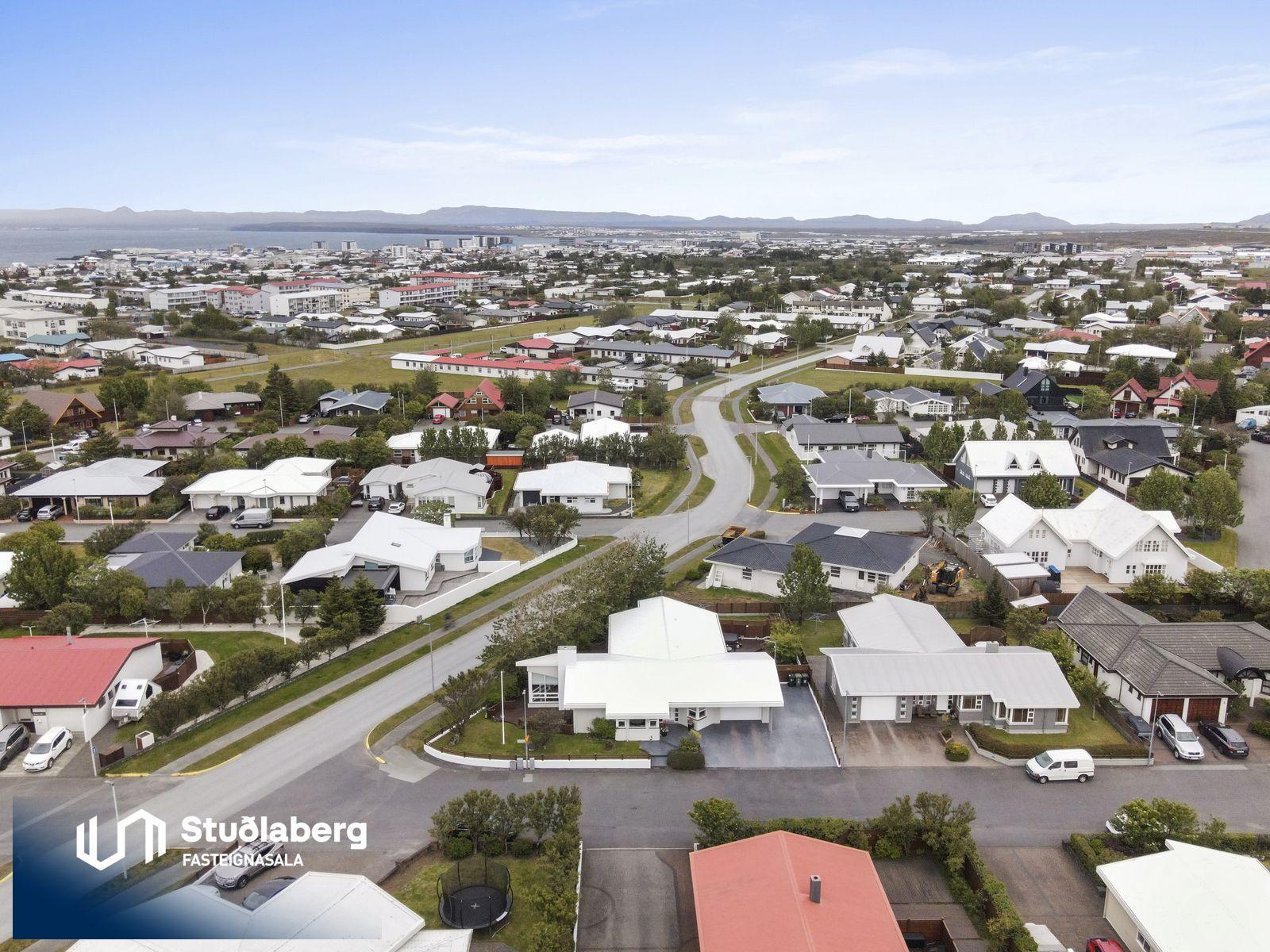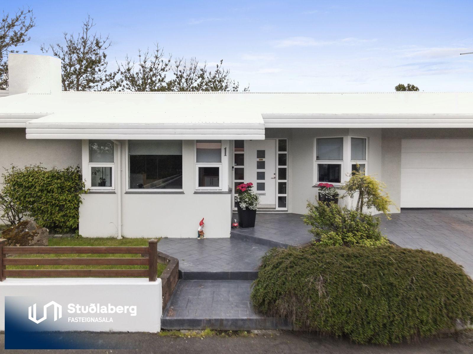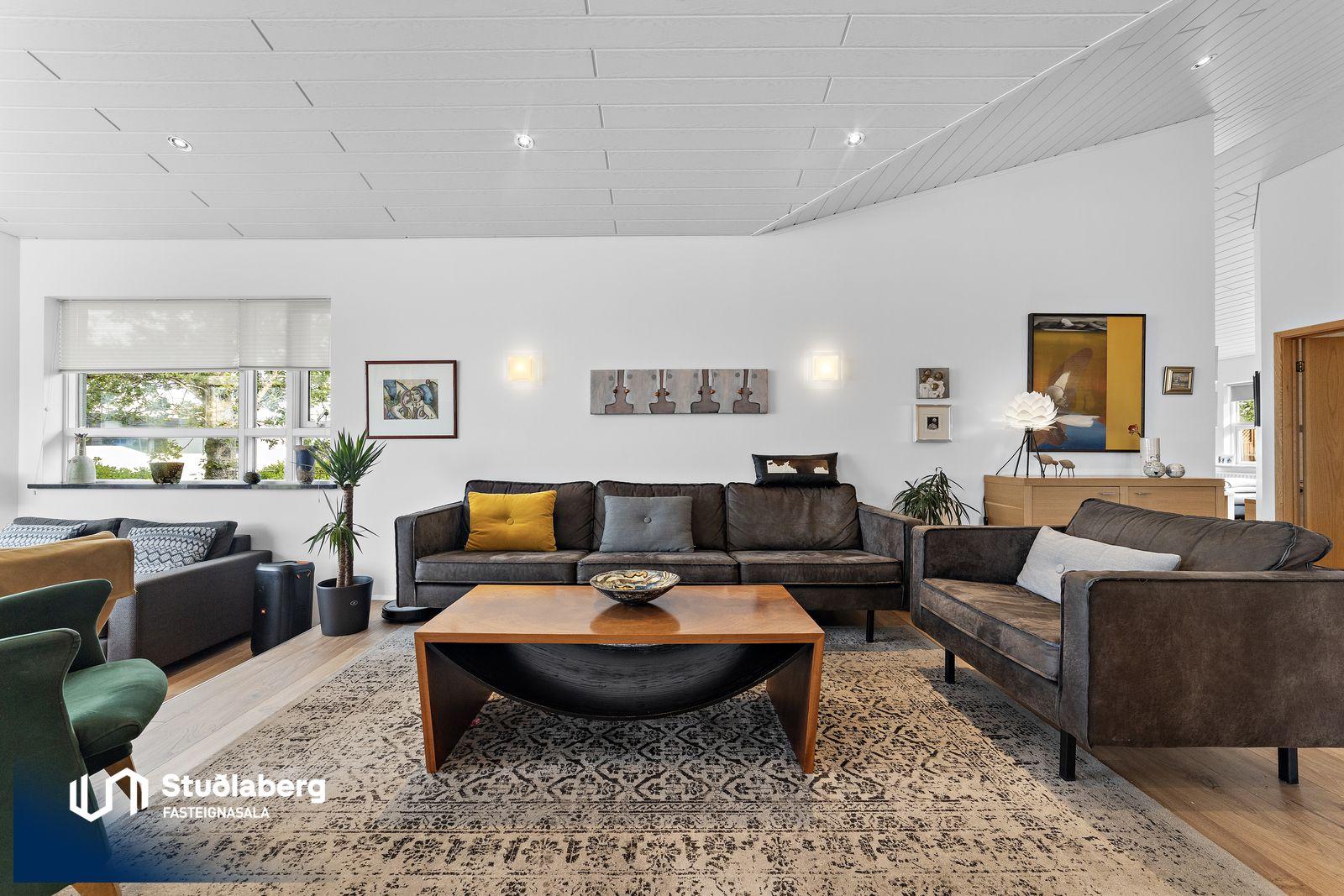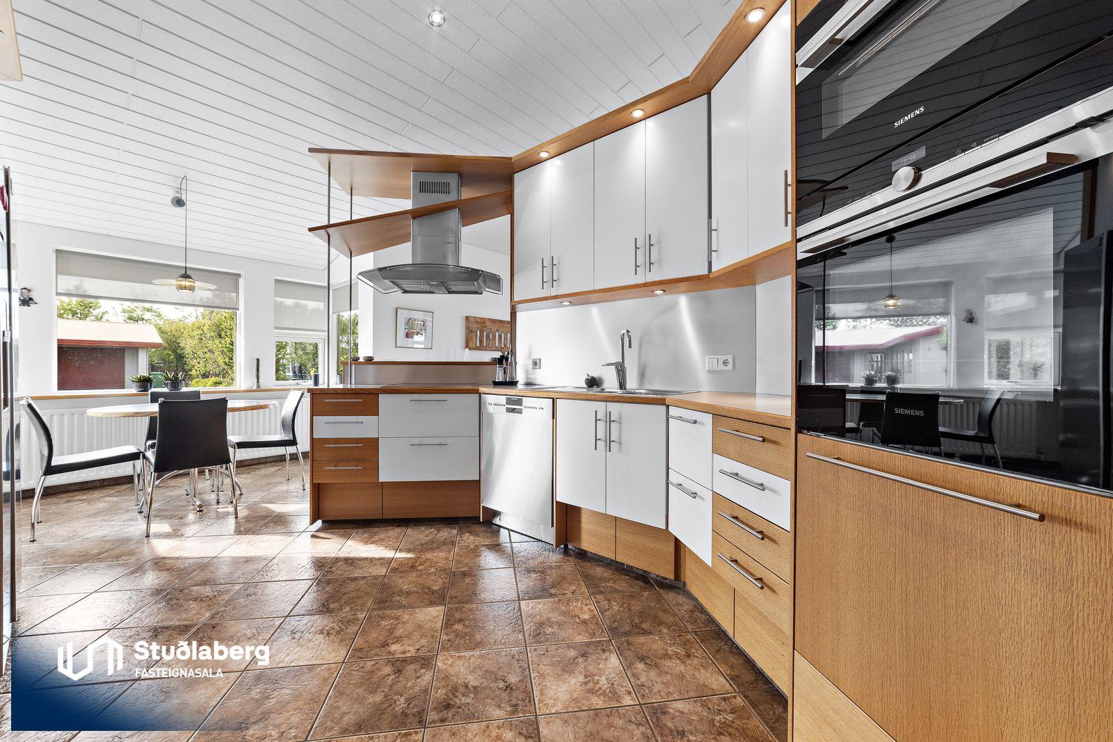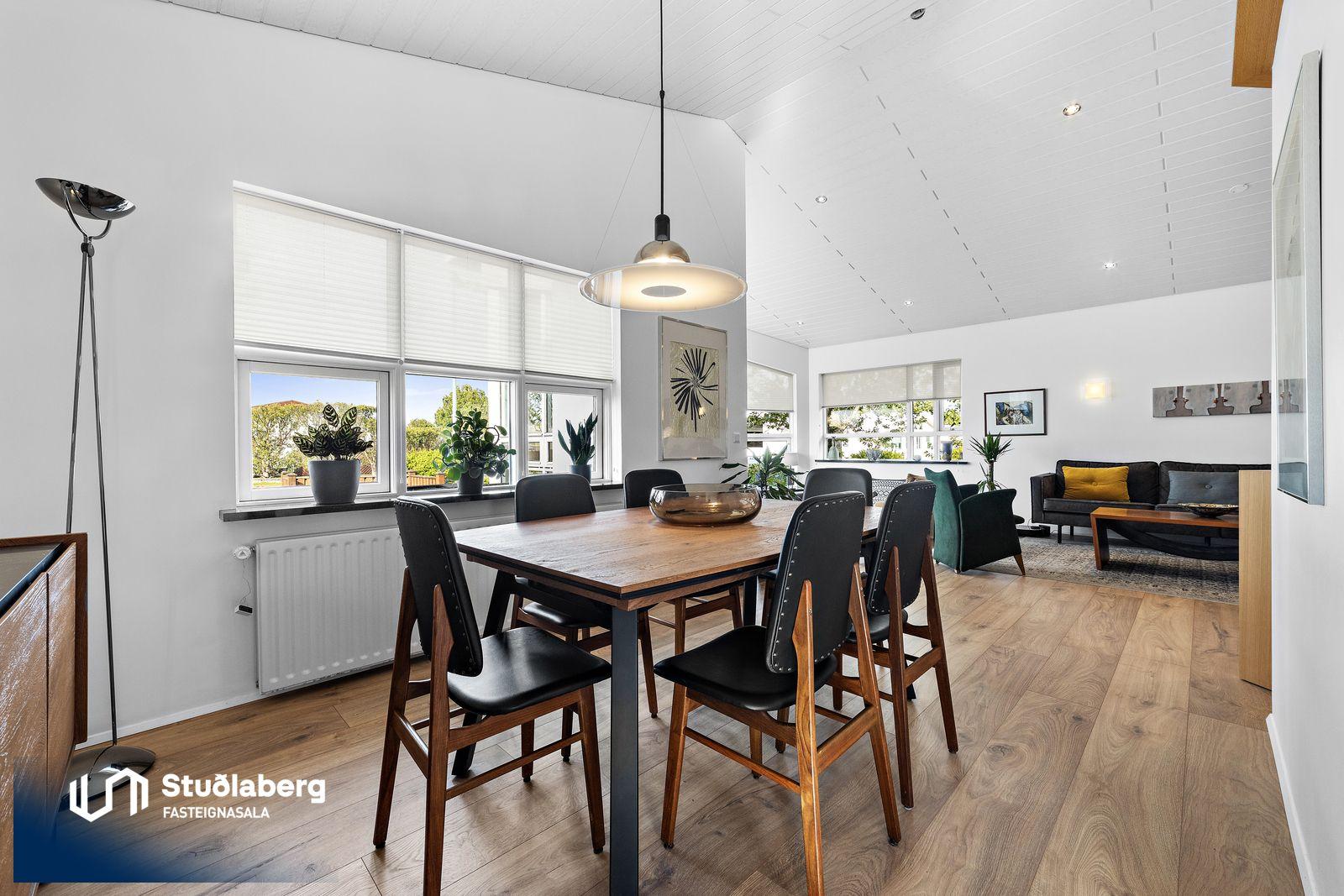 Eignin skiptist í anddyri, fimm svefnherbergi, tvö baðherbergi, eldhús, stofu, borðstofu, þvottahús og bílskúr. Einstök hönnun, sérsmíðaðar innréttingar og aukin lofthæð.