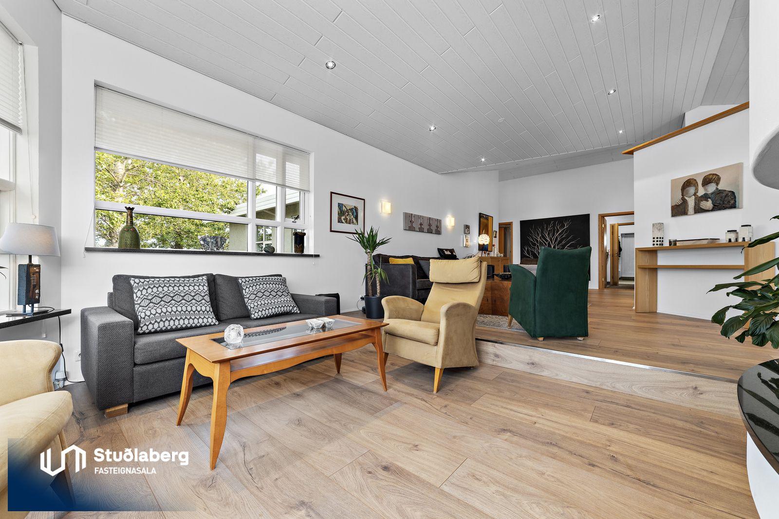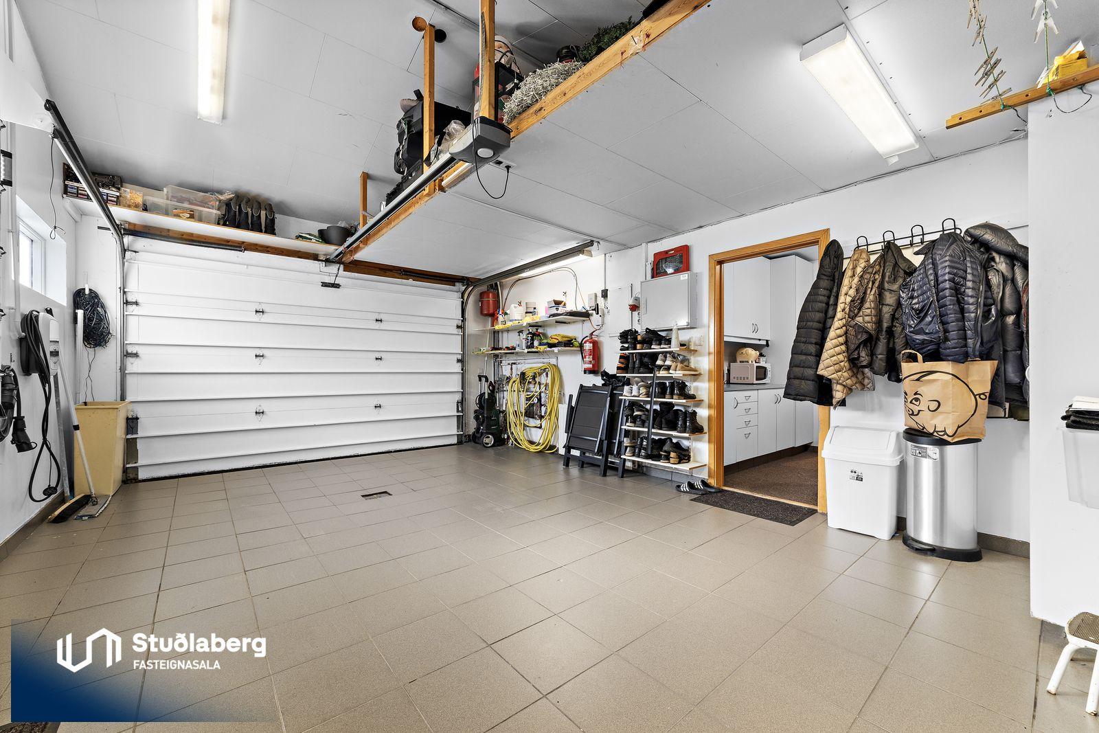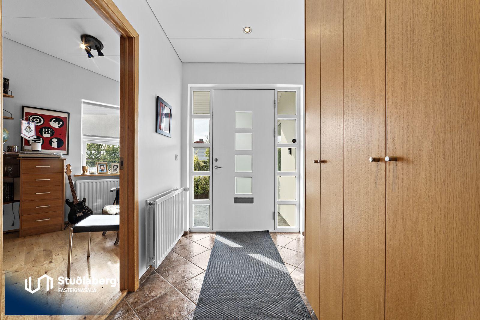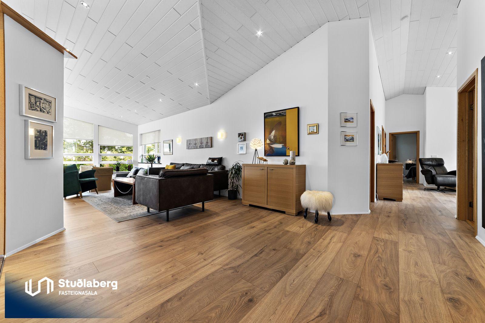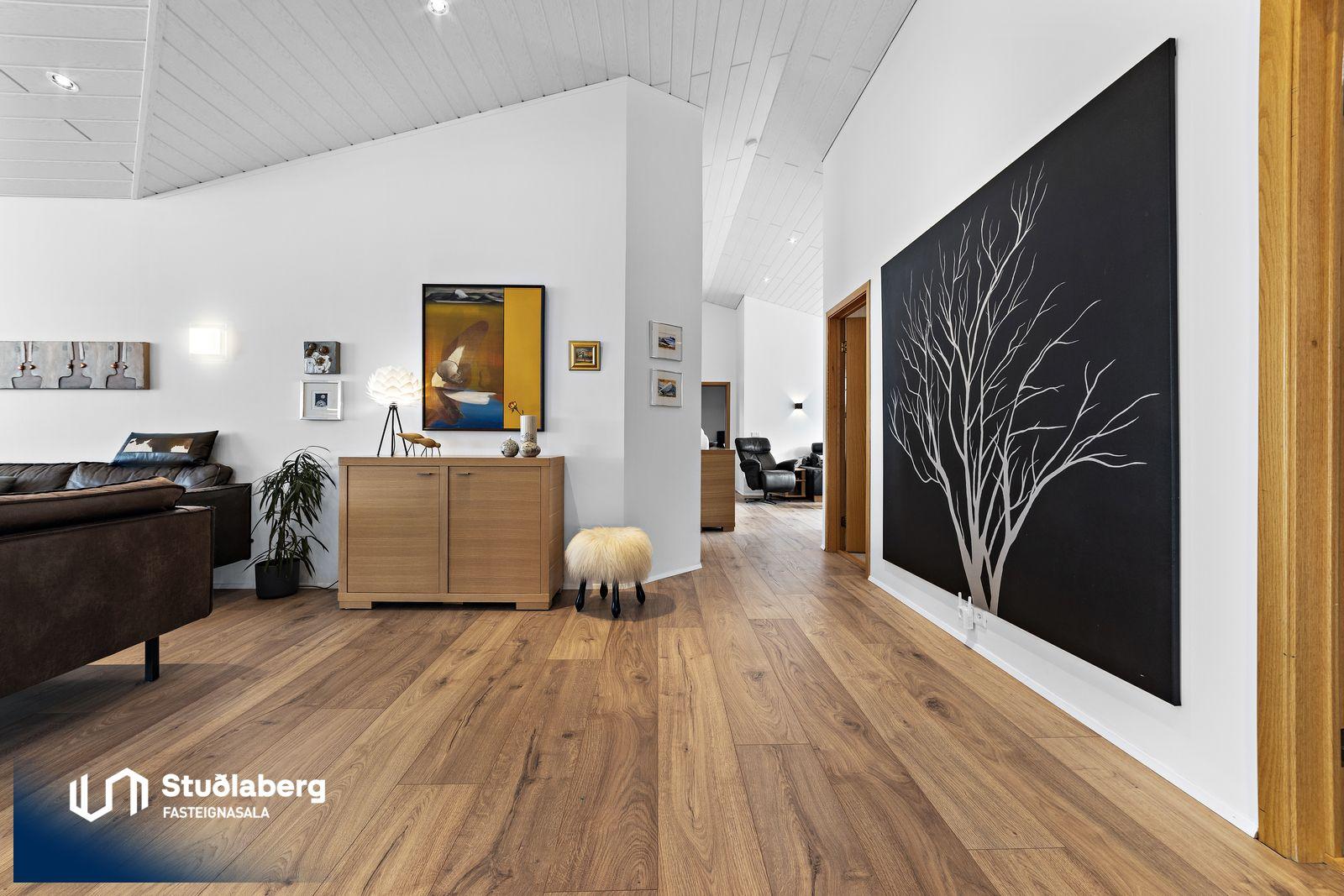 Forstofa hefur flísar á gólfi og góðum fataskáp. Hol er rúmgott með parket á gólfi. Stofa / Setustofa hefur parket á gólfi, mikil lofthæð og stórir gluggar sem gera hana bjarta og fallega, þar er stór arinn, stór sjónvarpsskáli með hurð út á verönd. Borðstofa er rúmgóð með parket á gólfi. Eldhús hefur flísar á gólfi, vönduð sérsmíðuð innrétting með miklu skápaplássi og góð eldhústæki. Borðkrókur er í eldhúsinu. Svefnherbergin eru fimm talsins, öll parketlögð með fataskápum. Innaf hjónaherbergi er baðherbergi með flísum á gólfi, upphengt salerni, góð innrétting, sturta og handklæðaofn. Baðherbergi hefur flísar á gólfi og veggjum, upphengt salerni, snyrtileg hvít innrétting, baðkar með sturtuhaus og handklæðaofn. Þvottahús hefur flísar á gólfi, stór innrétting með miklu skápaplássi og aðstöðu fyrir þvottavél og þurrkara í vinnuhæð, hurð er inní bílgeymslu. Bílskúr hefur flísar á gólfi, bílskúrshurð með rafmagnsopnun og geymsluloft. Útgönguhurð og gluggar eru í bílskúrnum út á bílaplan.