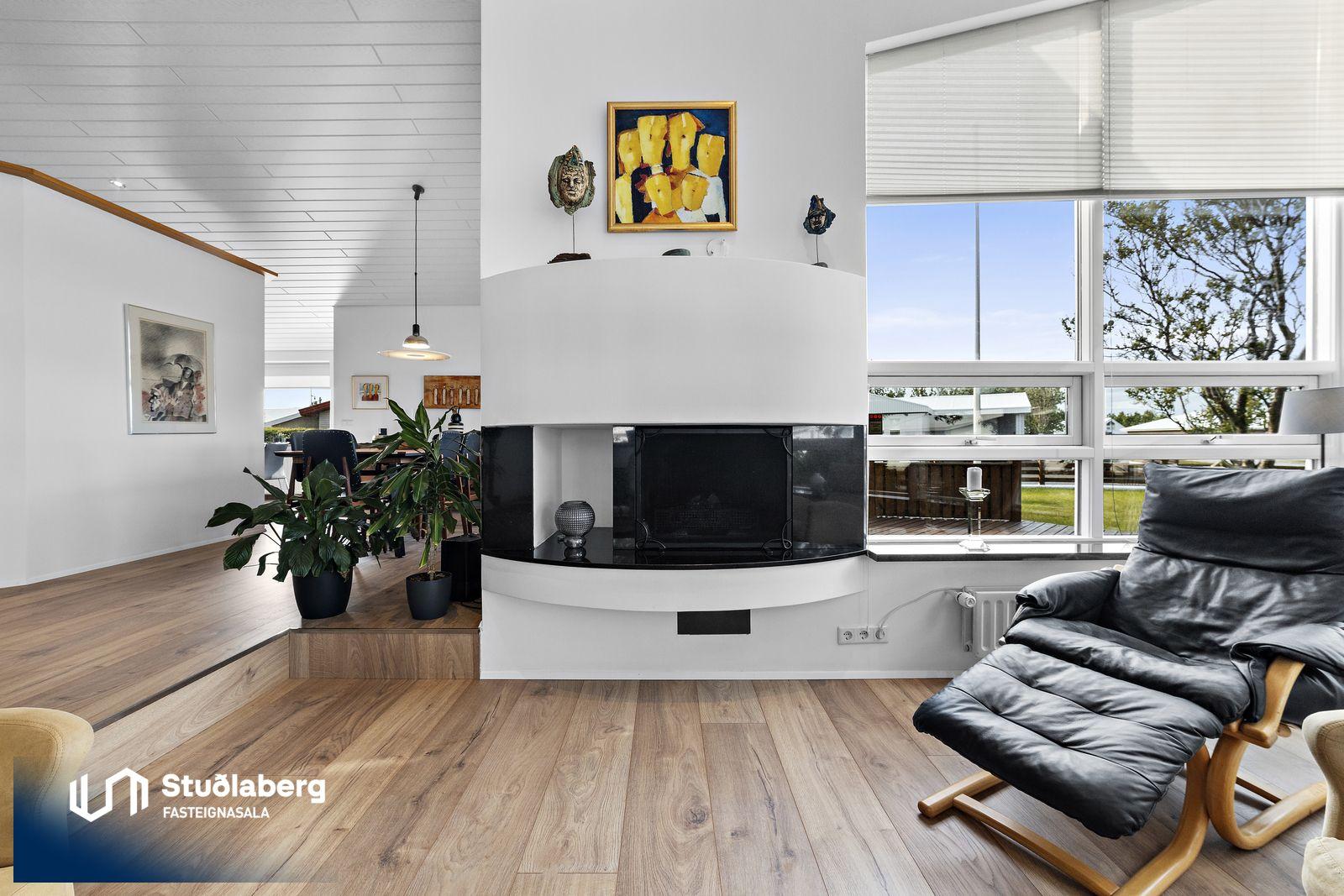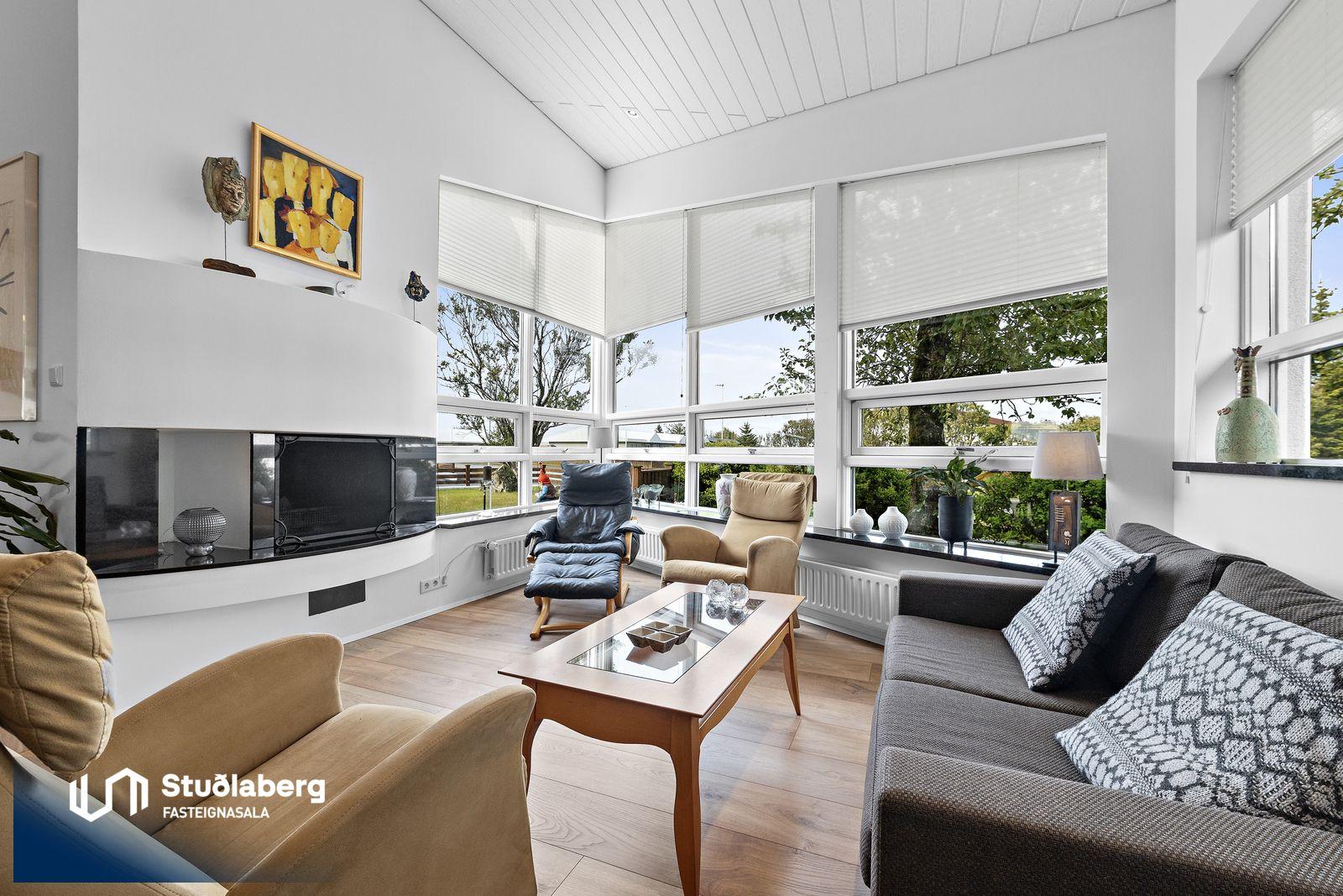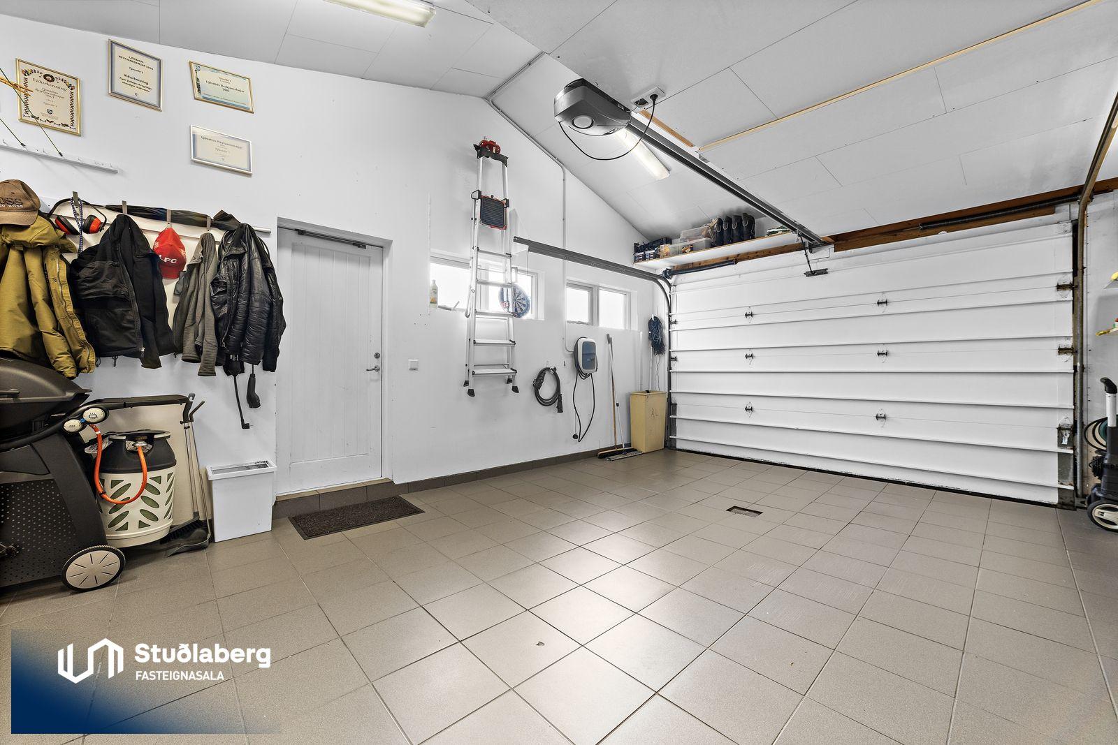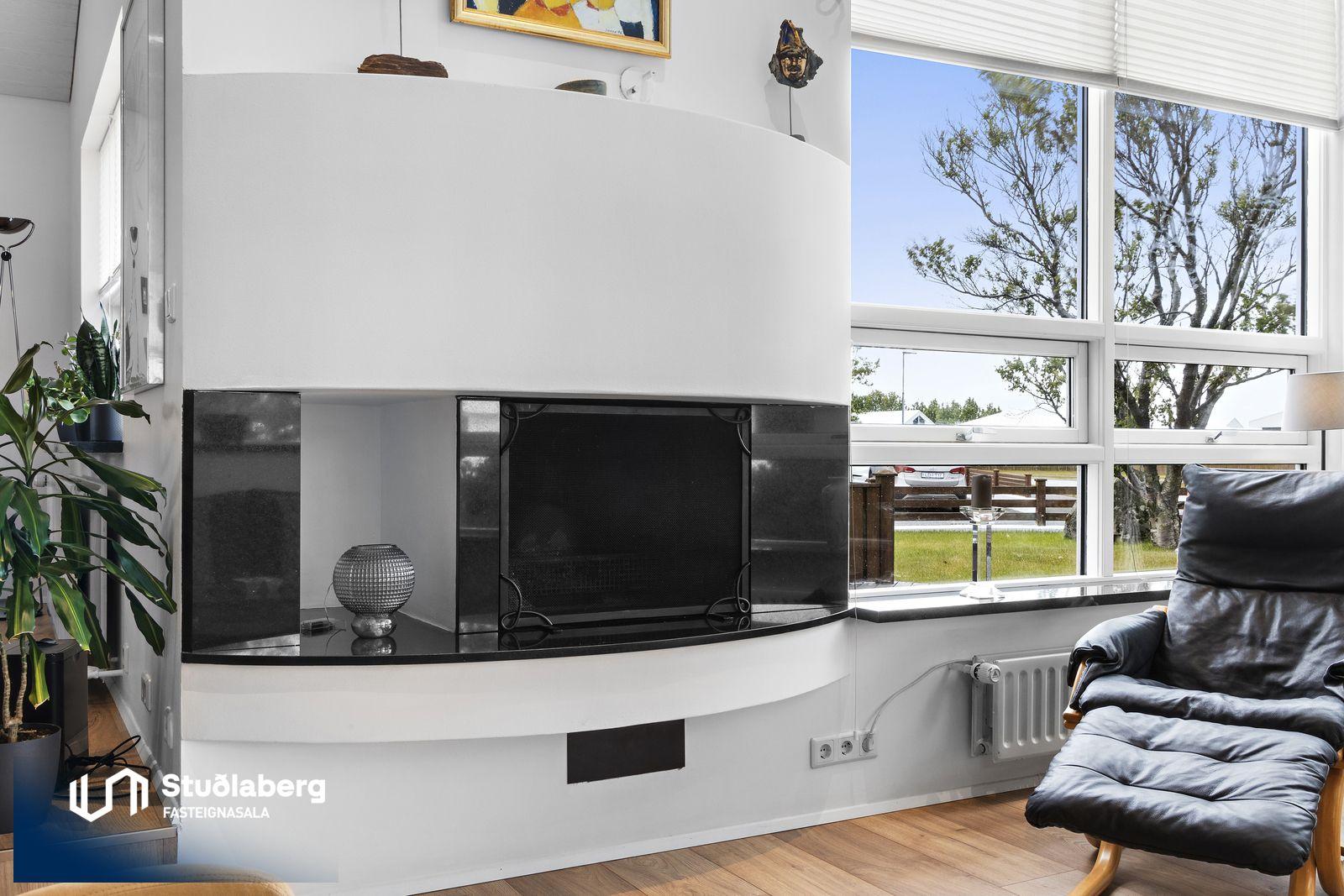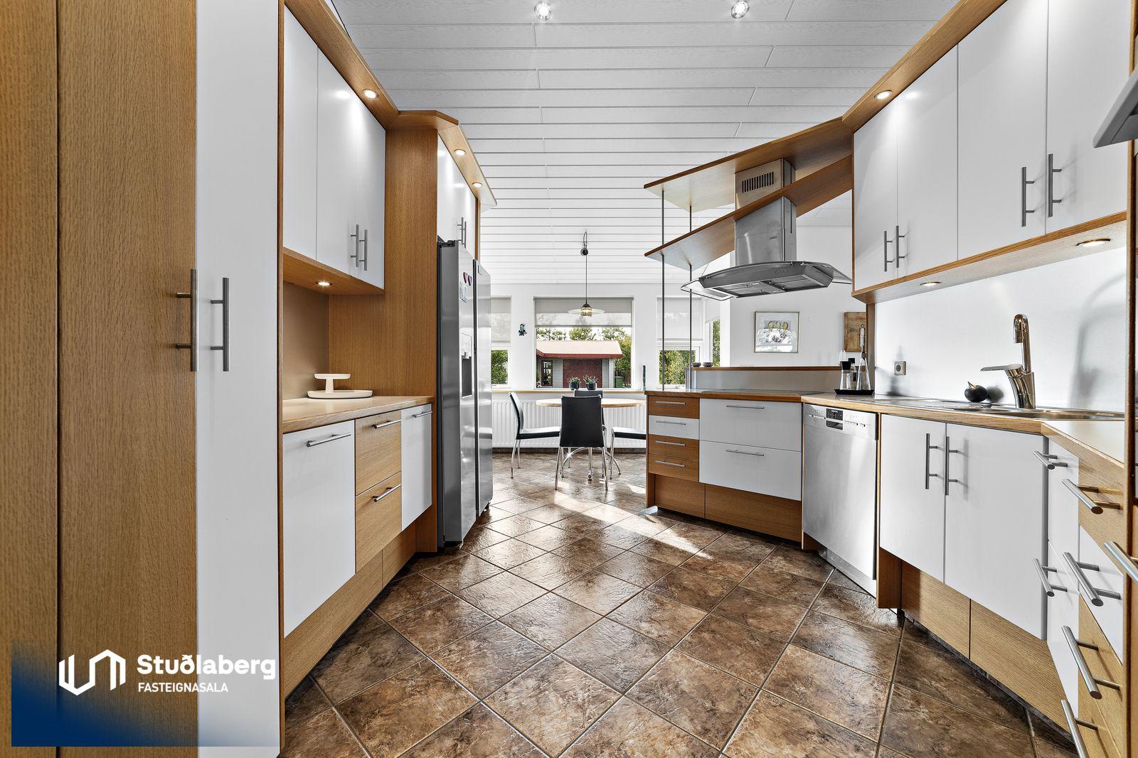 Forstofa hefur flísar á gólfi og góðum fataskáp. Hol er rúmgott með parket á gólfi. Stofa / Setustofa hefur parket á gólfi, mikil lofthæð og stórir gluggar sem gera hana bjarta og fallega, þar er stór arinn, stór sjónvarpsskáli með hurð út á verönd. Borðstofa er rúmgóð með parket á gólfi. Eldhús hefur flísar á gólfi, vönduð sérsmíðuð innrétting með miklu skápaplássi og góð eldhústæki. Borðkrókur er í eldhúsinu. Svefnherbergin eru fimm talsins, öll parketlögð með fataskápum. Innaf hjónaherbergi er baðherbergi með flísum á gólfi, upphengt salerni, góð innrétting, sturta og handklæðaofn. Baðherbergi hefur flísar á gólfi og veggjum, upphengt salerni, snyrtileg hvít innrétting, baðkar með sturtuhaus og handklæðaofn. Þvottahús hefur flísar á gólfi, stór innrétting með miklu skápaplássi og aðstöðu fyrir þvottavél og þurrkara í vinnuhæð, hurð er inní bílgeymslu. Bílskúr hefur flísar á gólfi, bílskúrshurð með rafmagnsopnun og geymsluloft. Útgönguhurð og gluggar eru í bílskúrnum út á bílaplan.