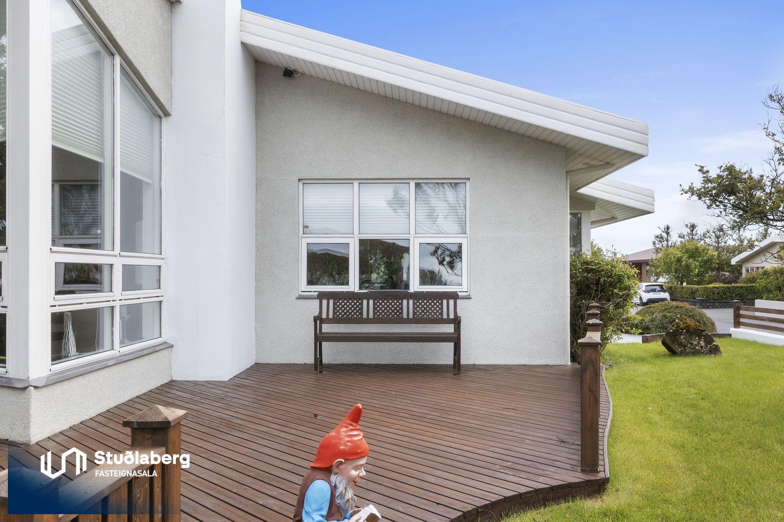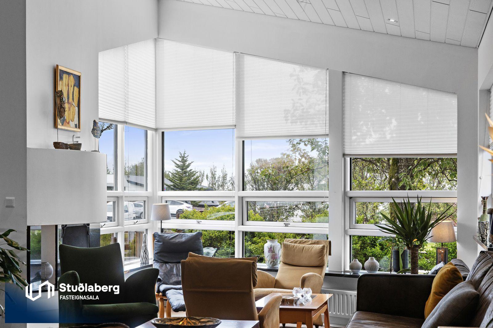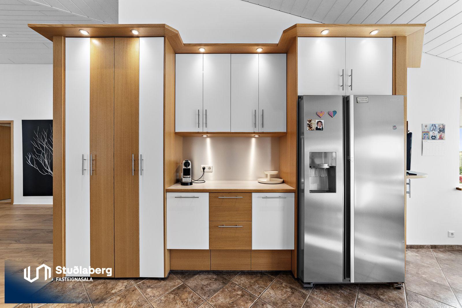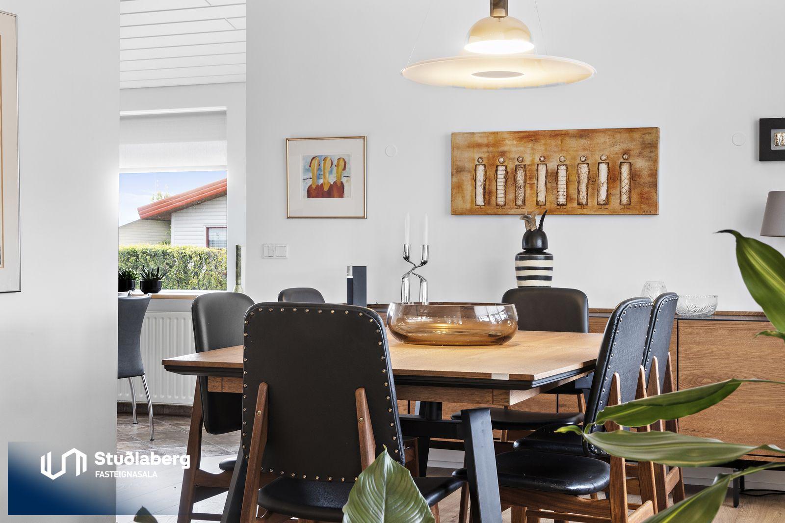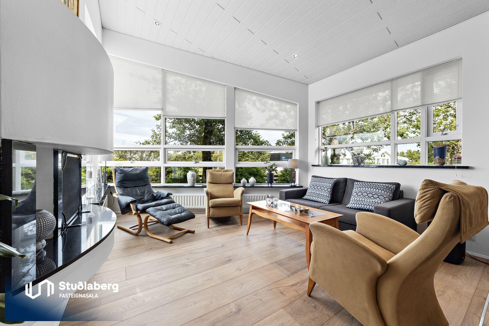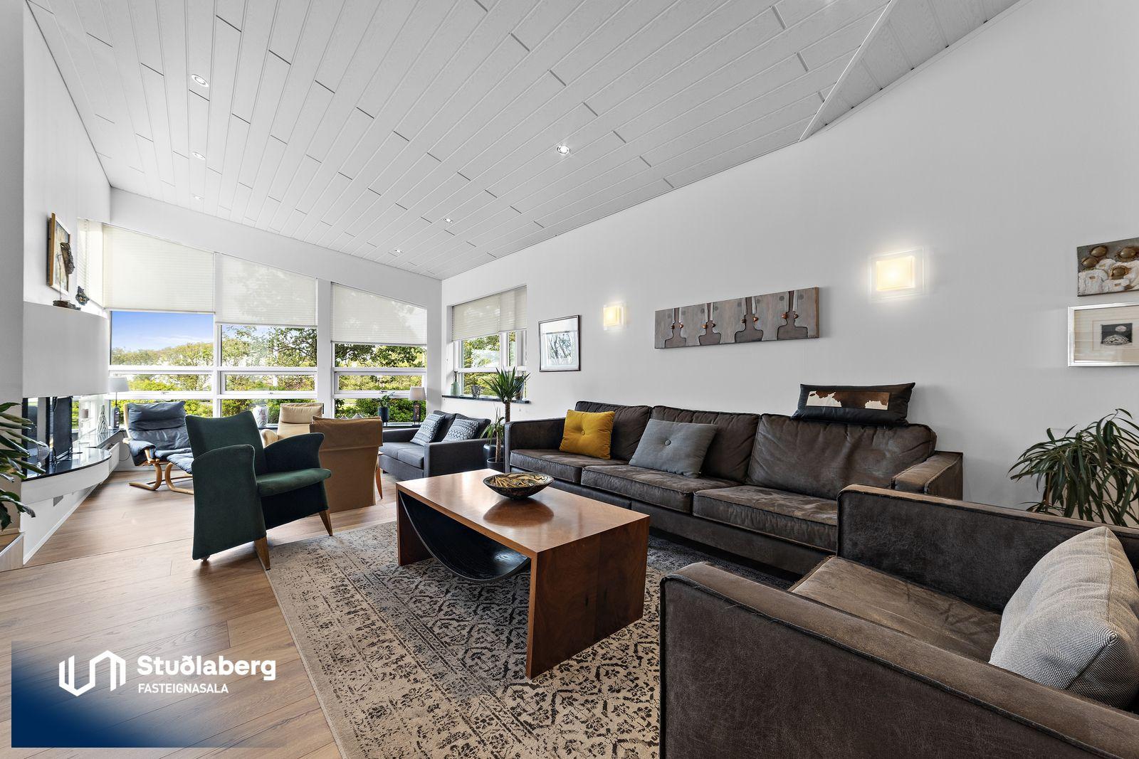 Forstofa hefur flísar á gólfi og góðum fataskáp. Hol er rúmgott með parket á gólfi. Stofa / Setustofa hefur parket á gólfi, mikil lofthæð og stórir gluggar sem gera hana bjarta og fallega, þar er stór arinn, stór sjónvarpsskáli með hurð út á verönd. Borðstofa er rúmgóð með parket á gólfi. Eldhús hefur flísar á gólfi, vönduð sérsmíðuð innrétting með miklu skápaplássi og góð eldhústæki. Borðkrókur er í eldhúsinu. Svefnherbergin eru fimm talsins, öll parketlögð með fataskápum. Innaf hjónaherbergi er baðherbergi með flísum á gólfi, upphengt salerni, góð innrétting, sturta og handklæðaofn. Baðherbergi hefur flísar á gólfi og veggjum, upphengt salerni, snyrtileg hvít innrétting, baðkar með sturtuhaus og handklæðaofn. Þvottahús hefur flísar á gólfi, stór innrétting með miklu skápaplássi og aðstöðu fyrir þvottavél og þurrkara í vinnuhæð, hurð er inní bílgeymslu. Bílskúr hefur flísar á gólfi, bílskúrshurð með rafmagnsopnun og geymsluloft. Útgönguhurð og gluggar eru í bílskúrnum út á bílaplan.