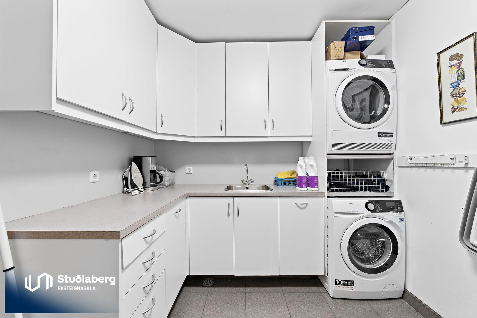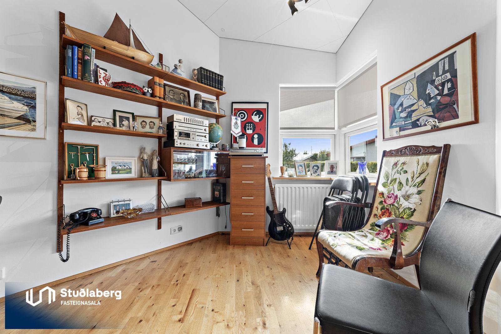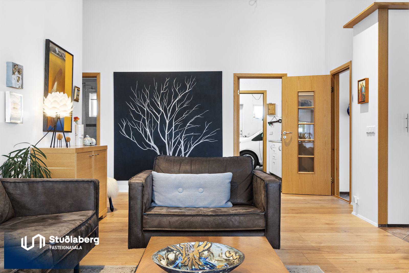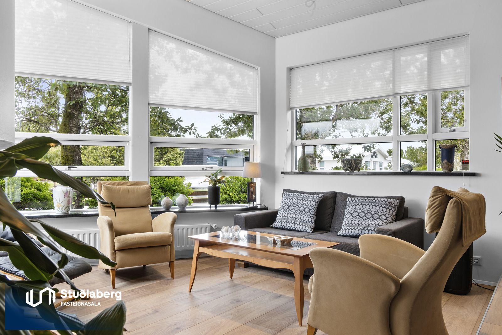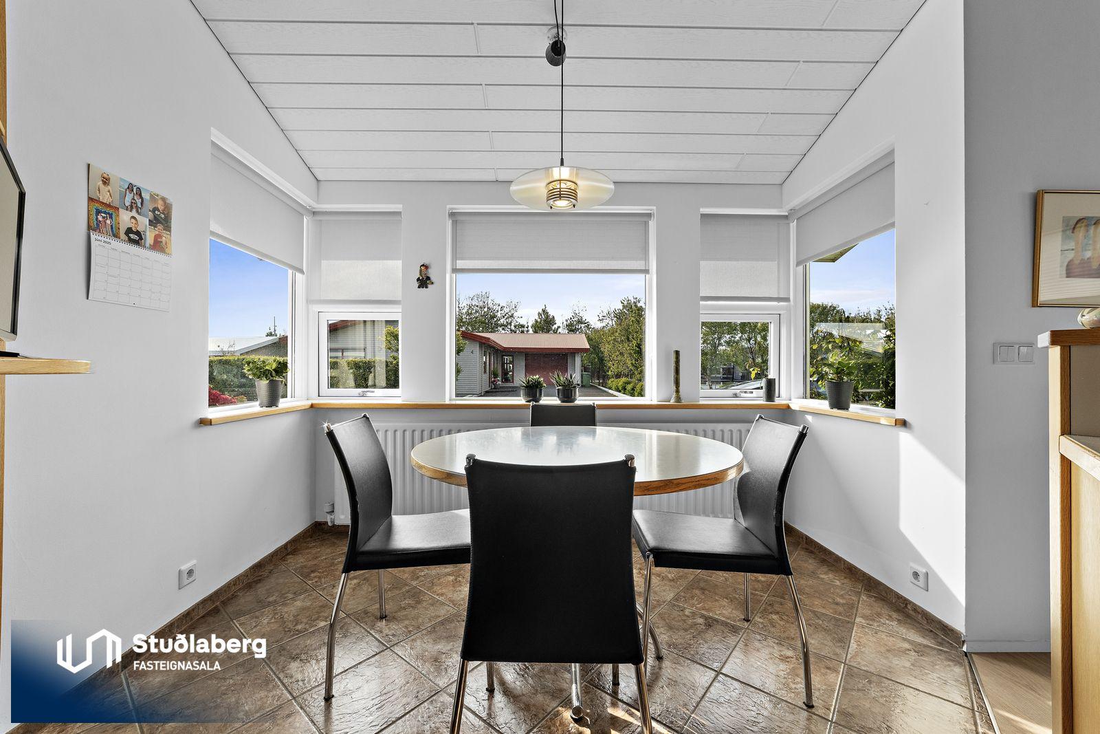 Forstofa hefur flísar á gólfi og góðum fataskáp. Hol er rúmgott með parket á gólfi. Stofa / Setustofa hefur parket á gólfi, mikil lofthæð og stórir gluggar sem gera hana bjarta og fallega, þar er stór arinn, stór sjónvarpsskáli með hurð út á verönd. Borðstofa er rúmgóð með parket á gólfi. Eldhús hefur flísar á gólfi, vönduð sérsmíðuð innrétting með miklu skápaplássi og góð eldhústæki. Borðkrókur er í eldhúsinu. Svefnherbergin eru fimm talsins, öll parketlögð með fataskápum. Innaf hjónaherbergi er baðherbergi með flísum á gólfi, upphengt salerni, góð innrétting, sturta og handklæðaofn. Baðherbergi hefur flísar á gólfi og veggjum, upphengt salerni, snyrtileg hvít innrétting, baðkar með sturtuhaus og handklæðaofn. Þvottahús hefur flísar á gólfi, stór innrétting með miklu skápaplássi og aðstöðu fyrir þvottavél og þurrkara í vinnuhæð, hurð er inní bílgeymslu. Bílskúr hefur flísar á gólfi, bílskúrshurð með rafmagnsopnun og geymsluloft. Útgönguhurð og gluggar eru í bílskúrnum út á bílaplan.