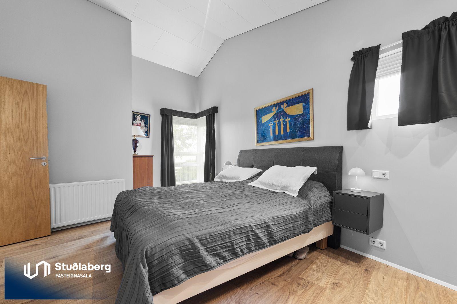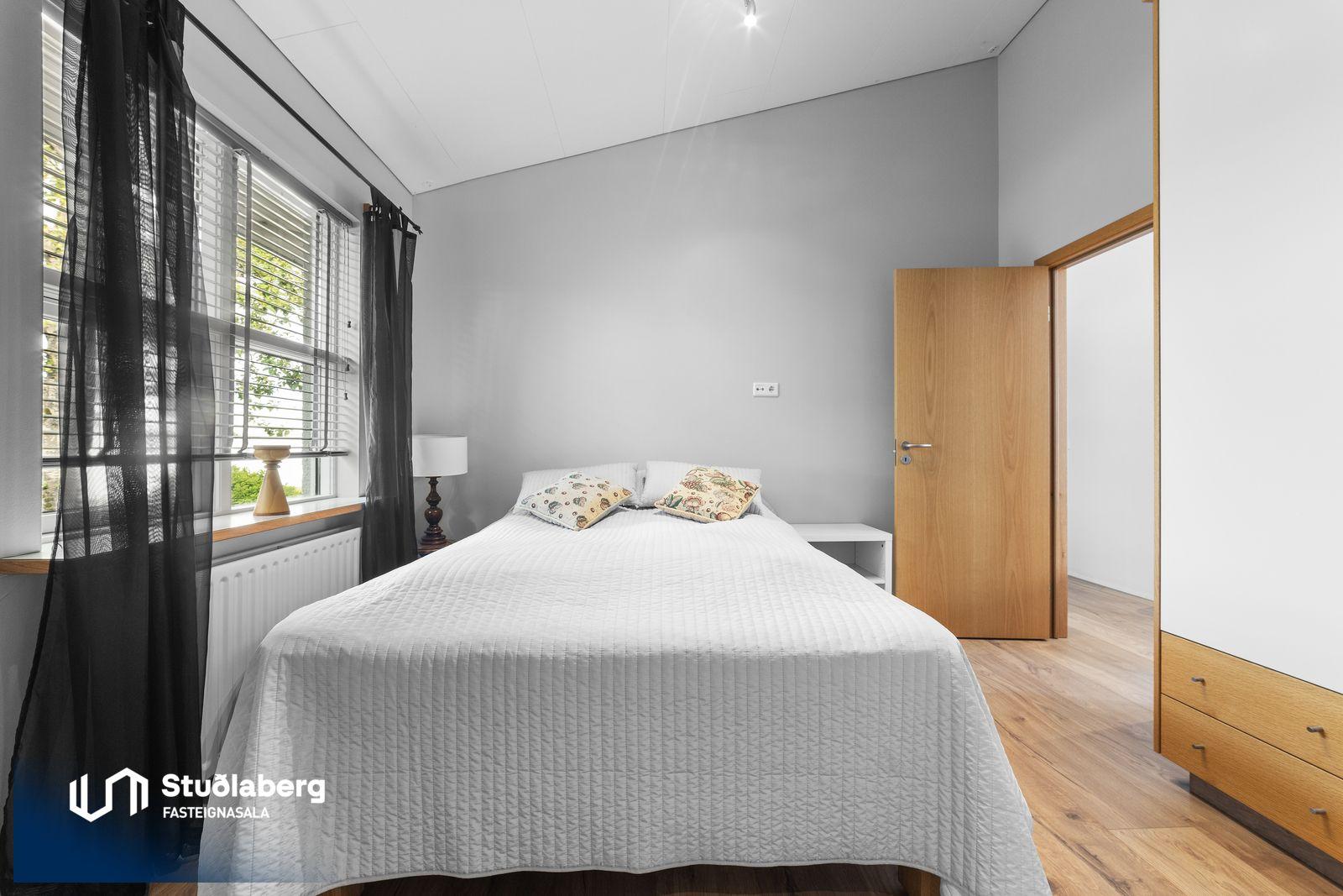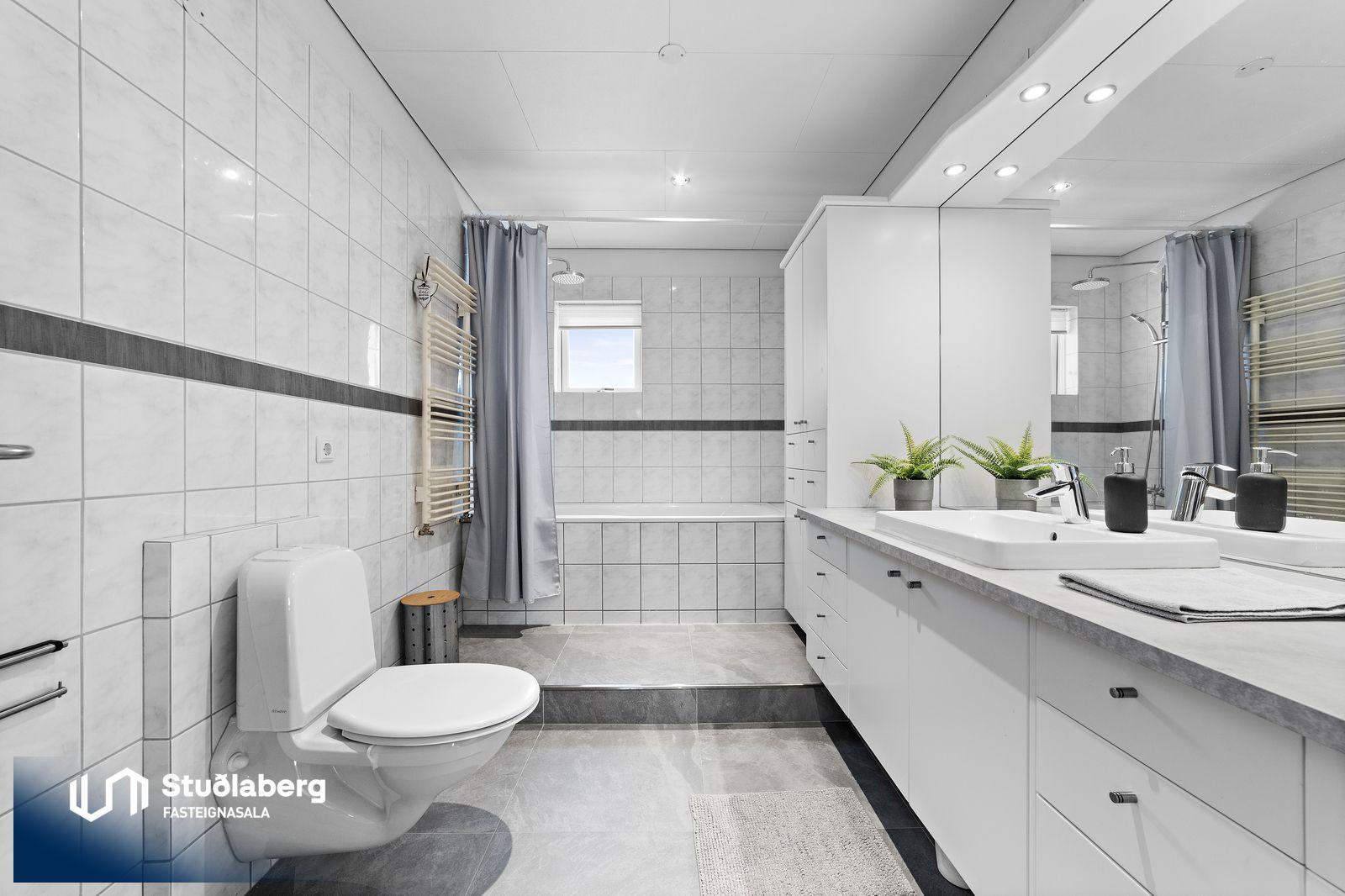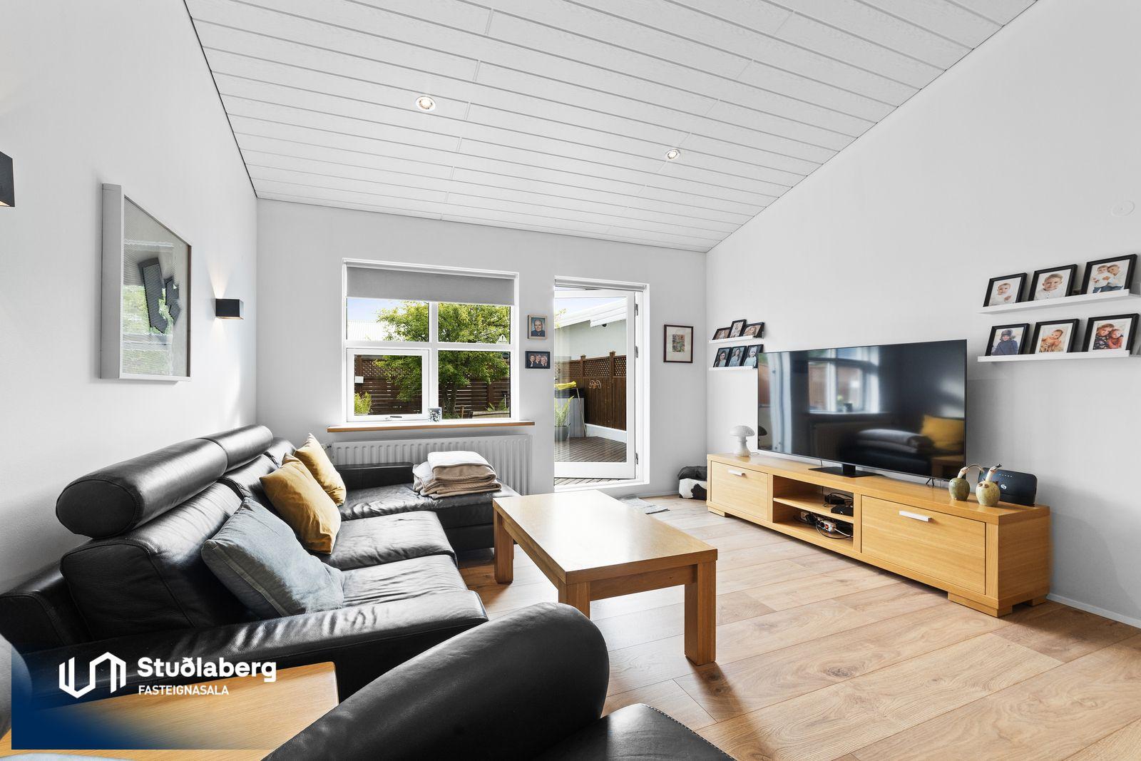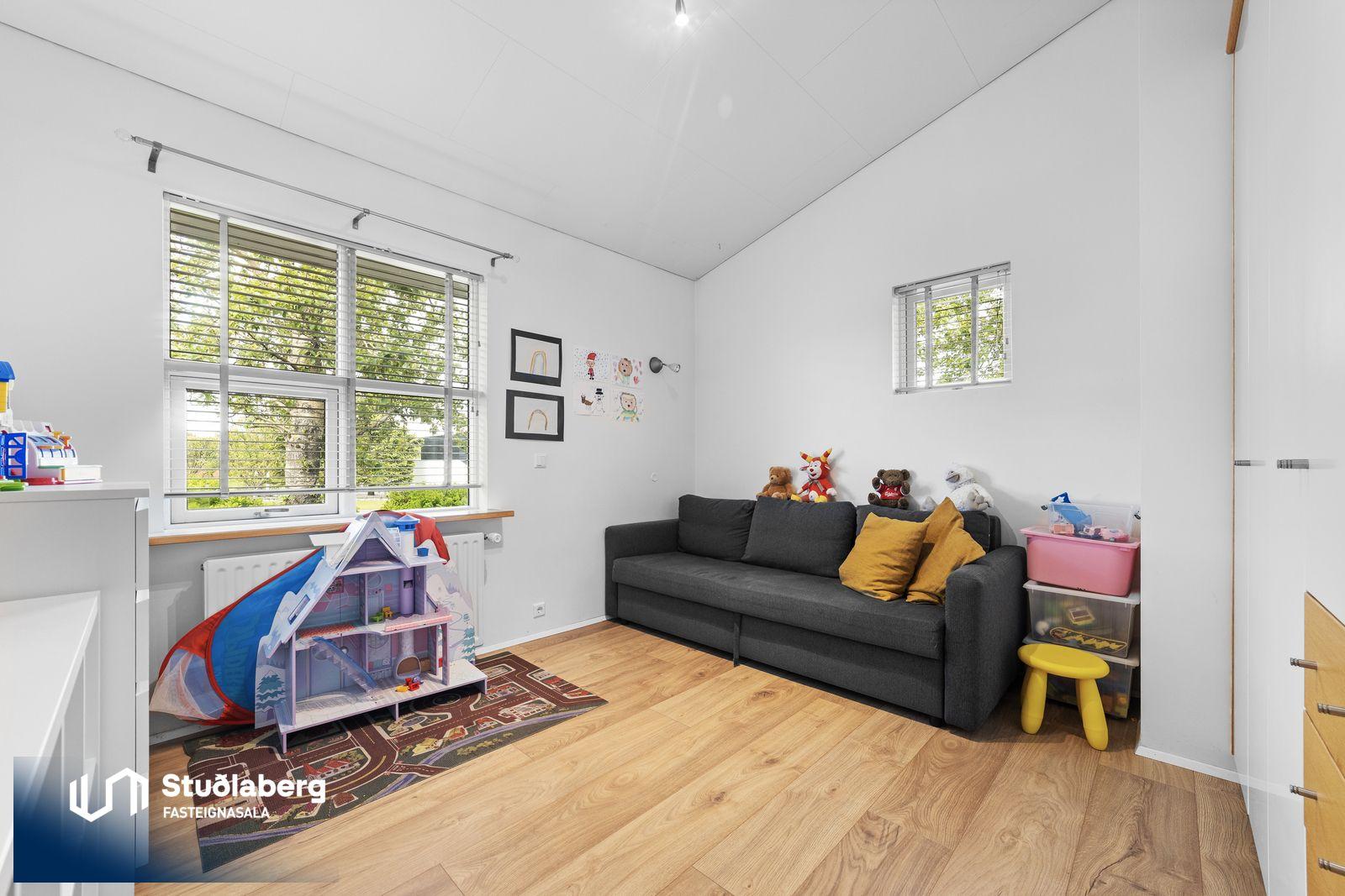Forstofa hefur flísar á gólfi og góðum fataskáp. Hol er rúmgott með parket á gólfi. Stofa / Setustofa hefur parket á gólfi, mikil lofthæð og stórir gluggar sem gera hana bjarta og fallega, þar er stór arinn, stór sjónvarpsskáli með hurð út á verönd. Borðstofa er rúmgóð með parket á gólfi. Eldhús hefur flísar á gólfi, vönduð sérsmíðuð innrétting með miklu skápaplássi og góð eldhústæki. Borðkrókur er í eldhúsinu. Svefnherbergin eru fimm talsins, öll parketlögð með fataskápum. Innaf hjónaherbergi er baðherbergi með flísum á gólfi, upphengt salerni, góð innrétting, sturta og handklæðaofn. Baðherbergi hefur flísar á gólfi og veggjum, upphengt salerni, snyrtileg hvít innrétting, baðkar með sturtuhaus og handklæðaofn. Þvottahús hefur flísar á gólfi, stór innrétting með miklu skápaplássi og aðstöðu fyrir þvottavél og þurrkara í vinnuhæð, hurð er inní bílgeymslu. Bílskúr hefur flísar á gólfi, bílskúrshurð með rafmagnsopnun og geymsluloft. Útgönguhurð og gluggar eru í bílskúrnum út á bílaplan.