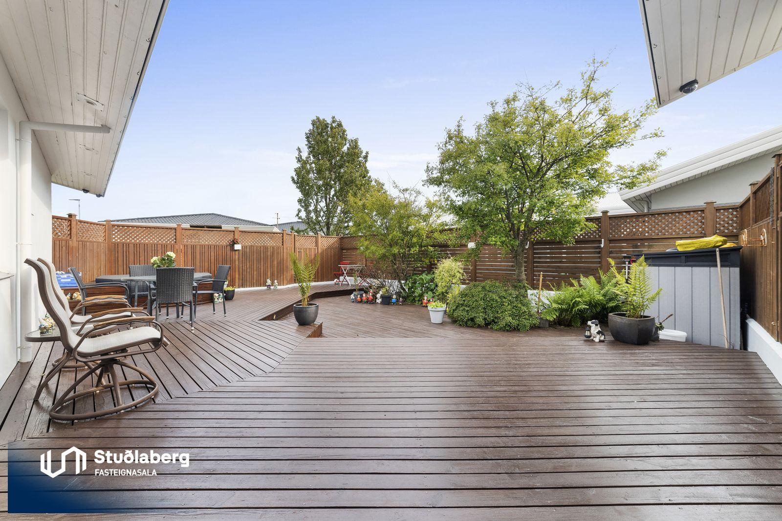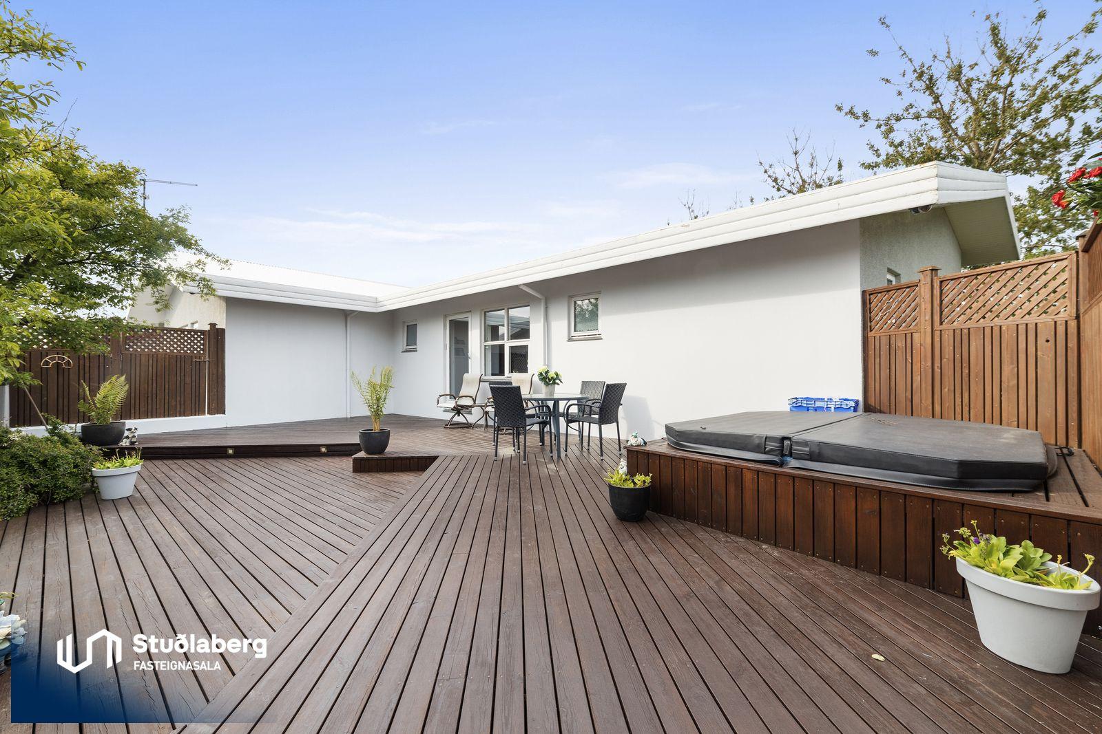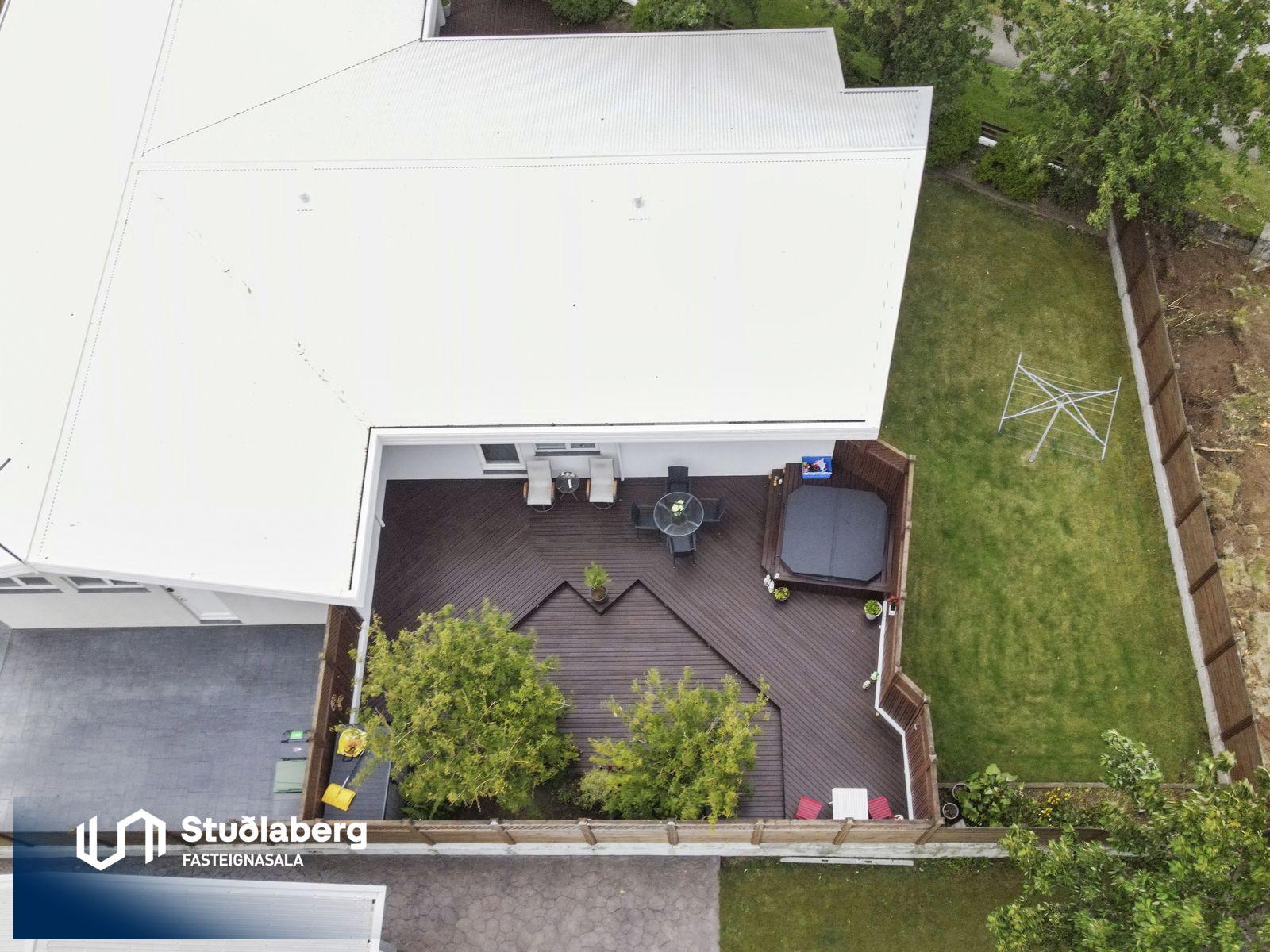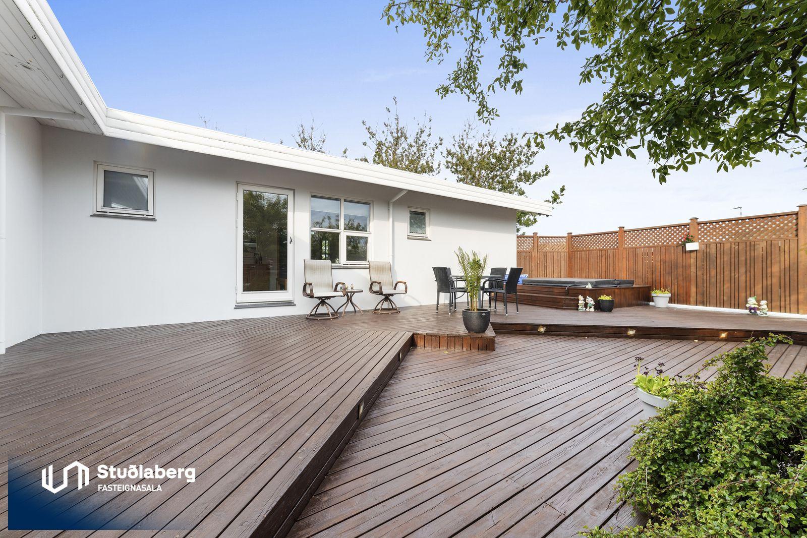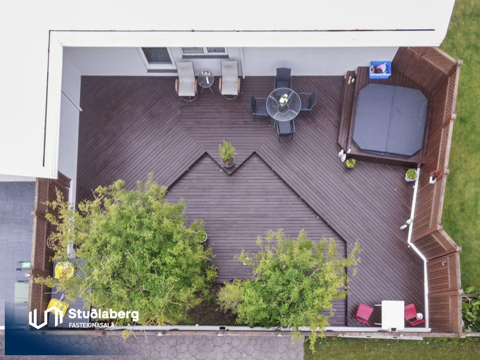 *Veröndin er stór og afgirt. *fallegur viðarpallur með heitum pott. *stórt steypt upphitað bílaplan.