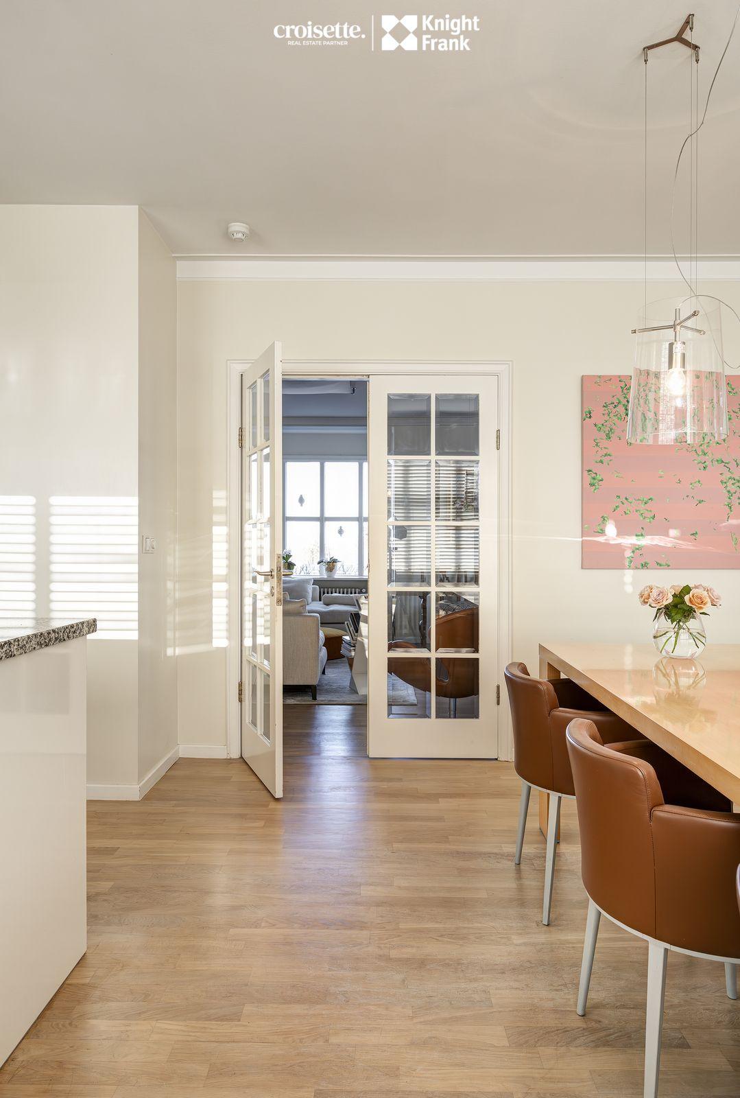 Stofan, sjónvarpsherbergið og eldhús sambyggt borðstofu eru björt rými með fallegum gluggum. Arinn er í stofu og úr borðstofunni er útsýni á aðra hönd upp í Öskuhlíð og á hina höndina yfir miðbæ Reykjavíkur, líkt og úr stofunni. Glæsilegt eldhúsinnrétting frá Phoggen Phol er með Miele tækjum.