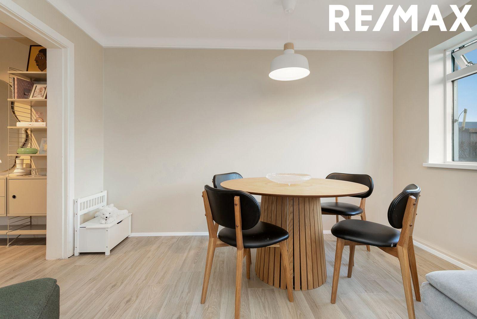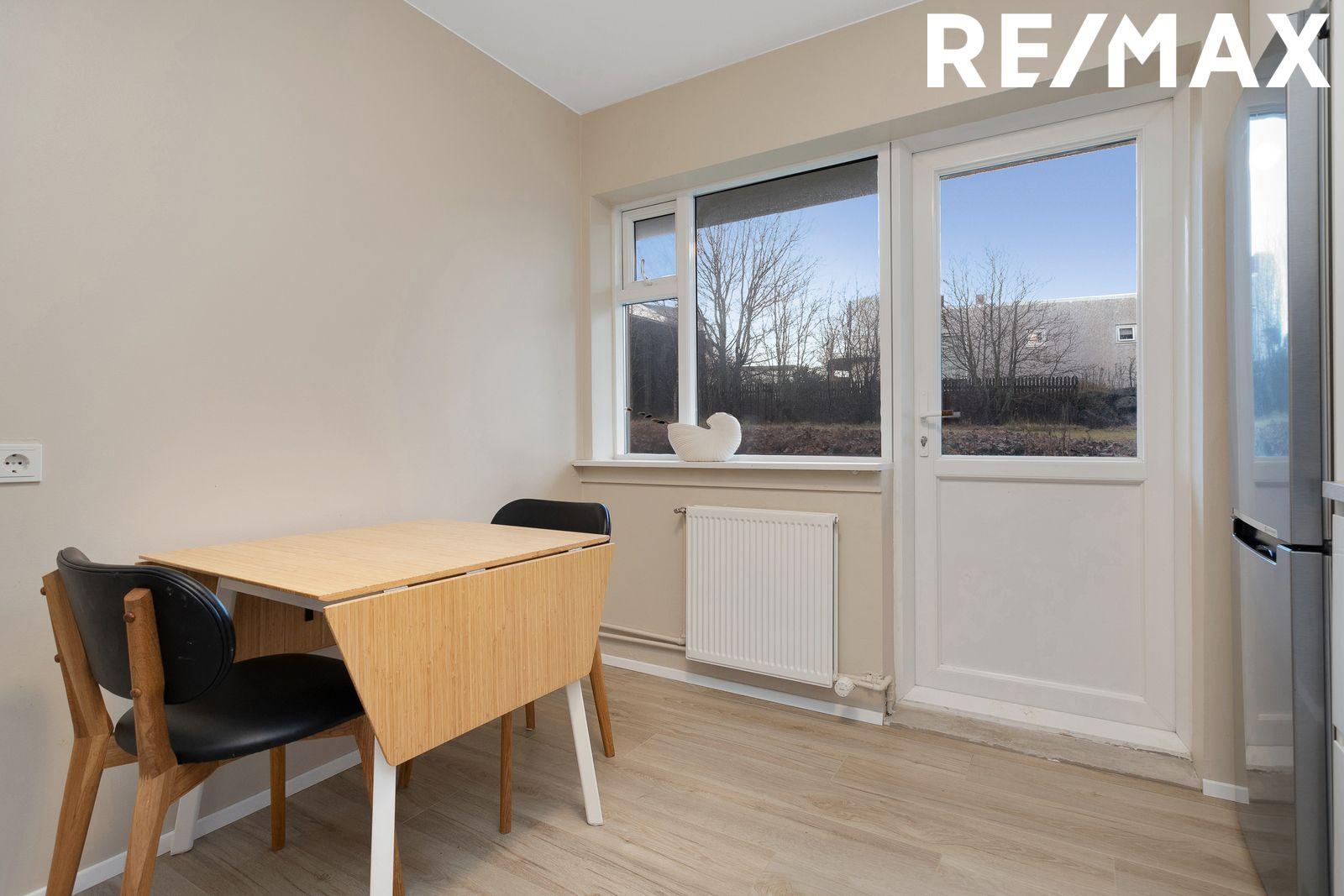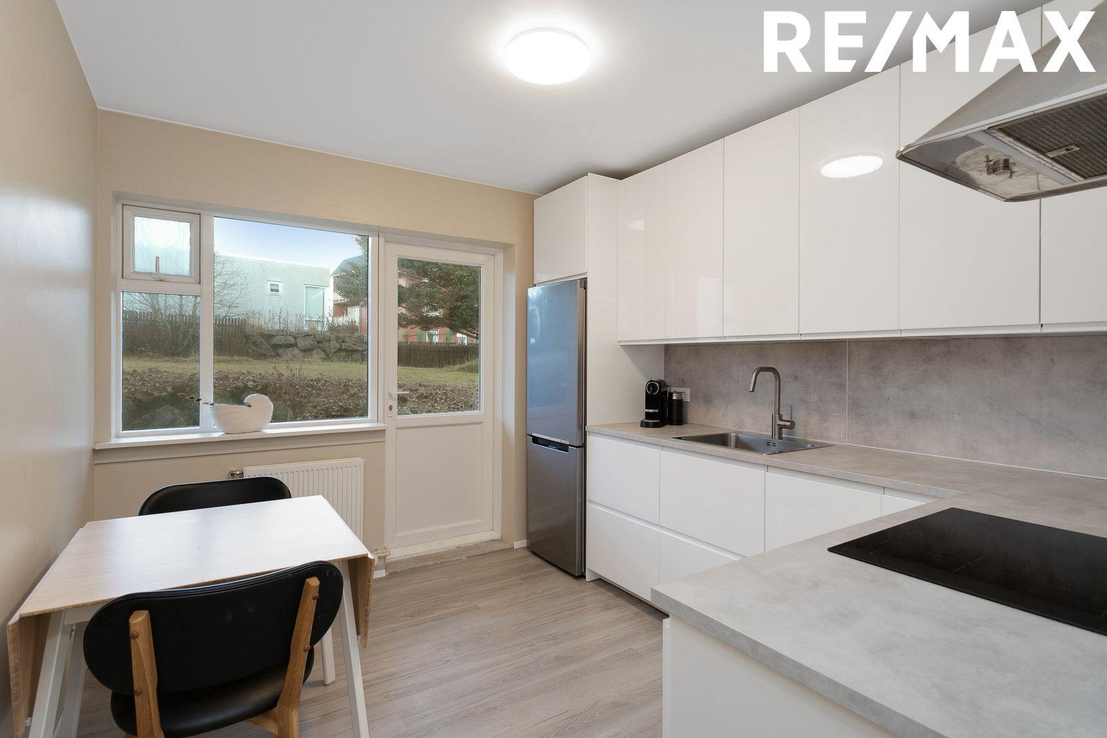 Eldhús: Eldhúsið er með fallegri hvítri innréttingu í vinkil með efri og neðri skápum. Nýlegt helluborð, gufugleypir og bakaraofn er í innréttingunni. Ljósgrá borðplata er á borðum og klæðning í sama stíl er á vegg á milli efri og neðri skápa og við eldavélina. Góður borðkrókur er við glugga. Fallegt harðparket er á gólfi. Búið er að endurnýja gluggann í heild sinni og setja hurð út úr eldhúsinu út í garðinn þar sem leyfir er til að setja verönd.