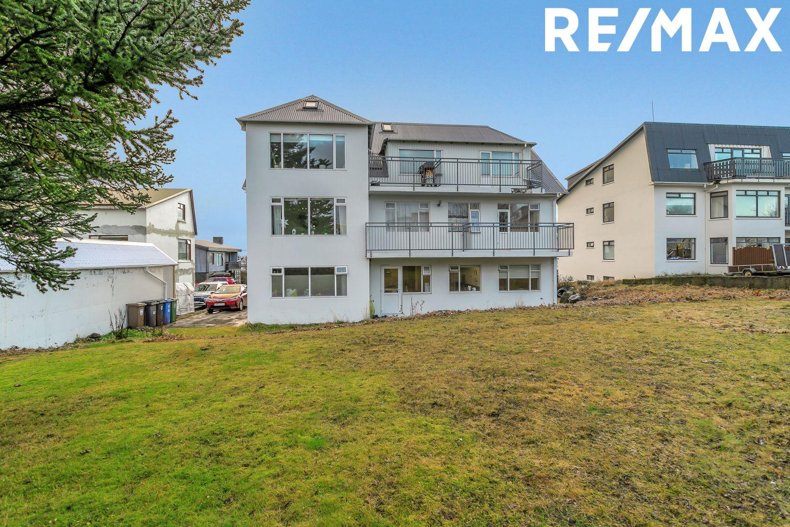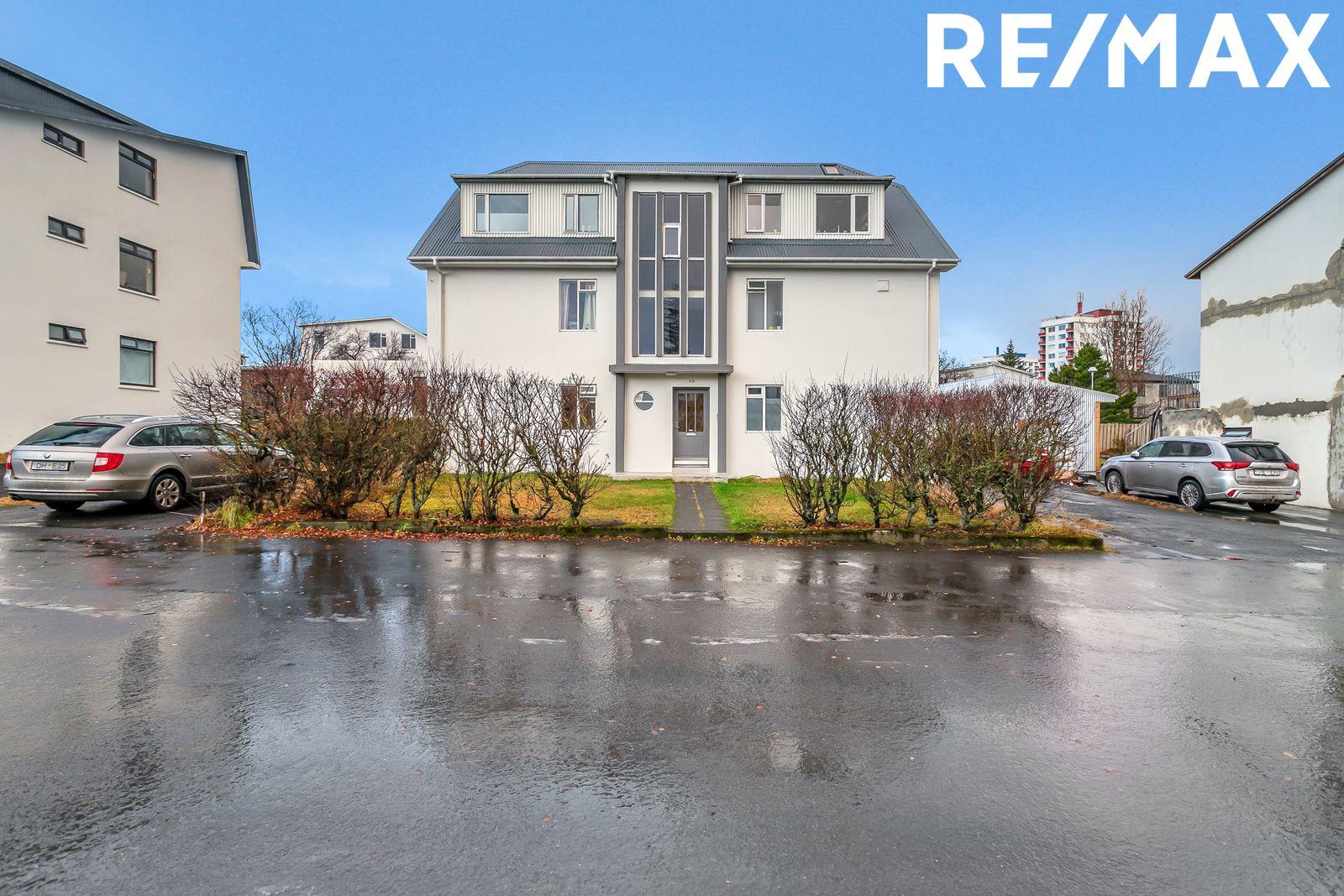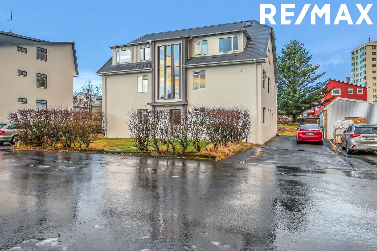 Þvottaherbergi: Sameiginlegt þvottaherbergi er við hlið geymslunnar þar sem allar íbúðir hafa tengi fyrir sínar vélar og gott aðgengi að snúrum til að þurrka. Góðir gluggar eru í rýminu og út gengi á lóðina á hægri gafli hússins.