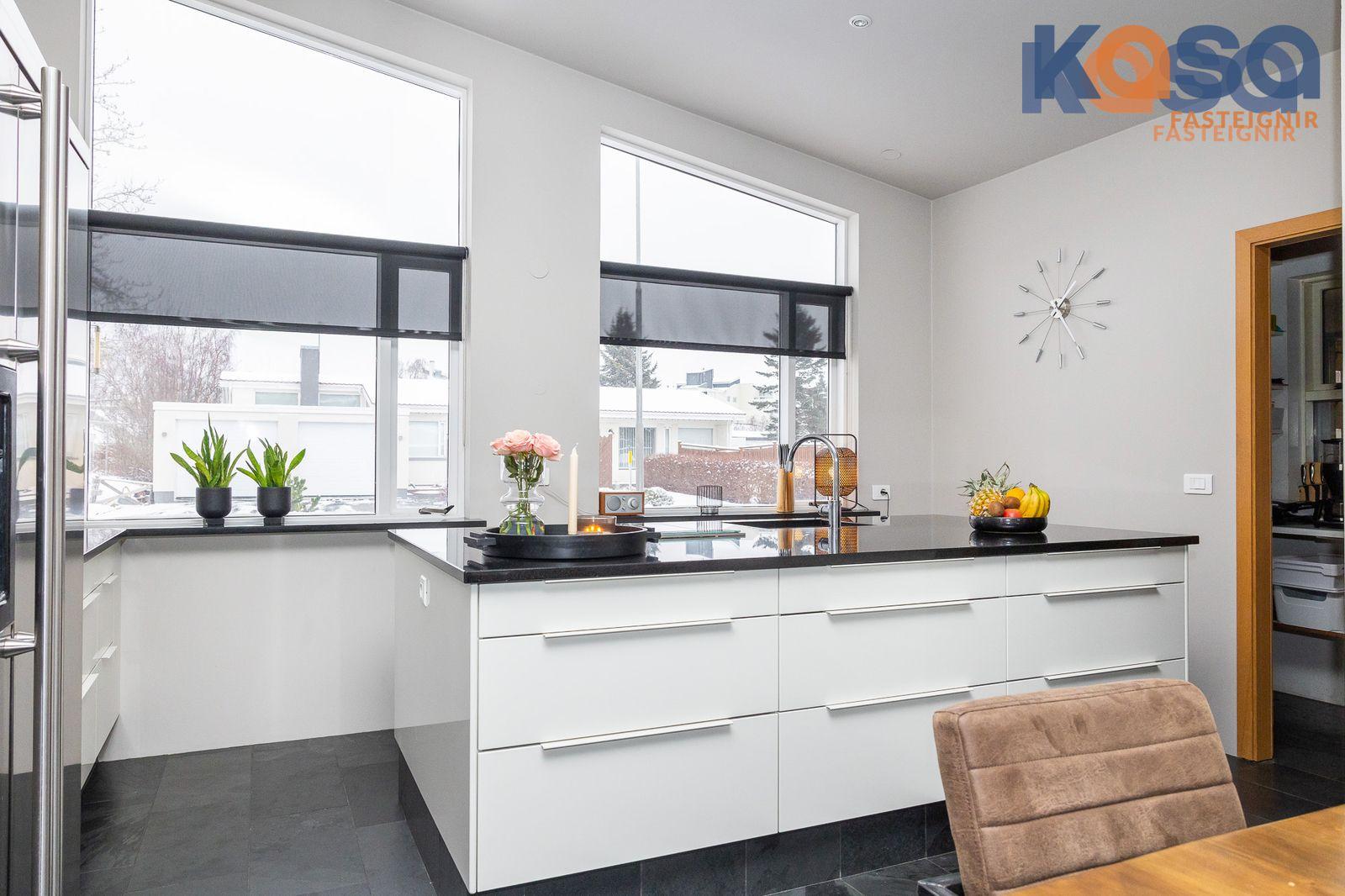 Eldhús: Rúmgóð innrétting með góðu skápa og skúffuplássi. Pláss er fyrir tvöfaldan ísskáp í innréttingu. Bakara- og örbylgjuofn í vinnuhæð. Tækjaskápur. Eyjan er með skúffum beggja vegna, stórt