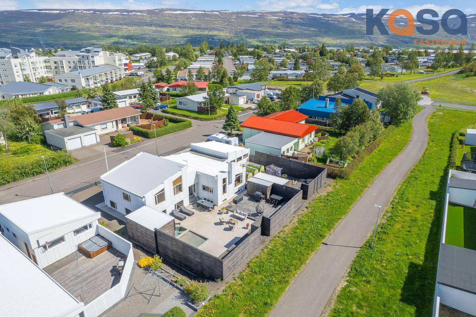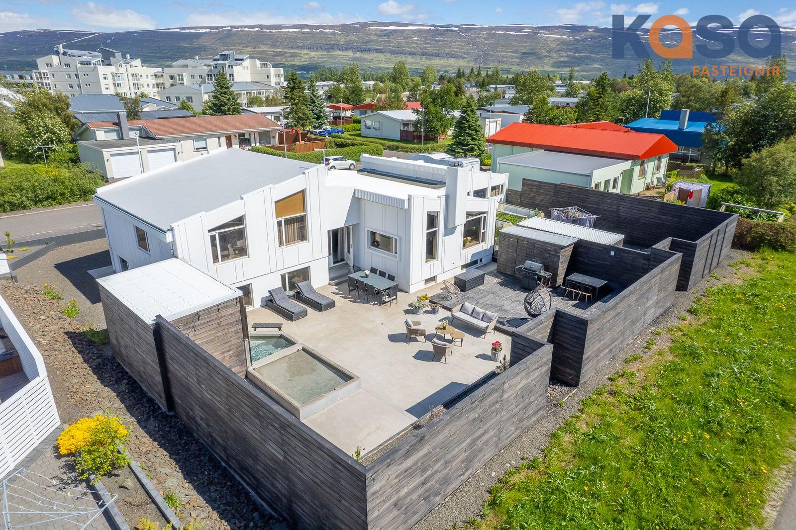 Eikarlundur 20 - Glæsilegt 288,9 fm 8 herbergja einbýlishús á pöllum með tvöföldum bílskúr ásamt stórum steyptum palli með heitum potti, vaðlaug, sauna, sturtuaðstöðu og útieldhúsi.