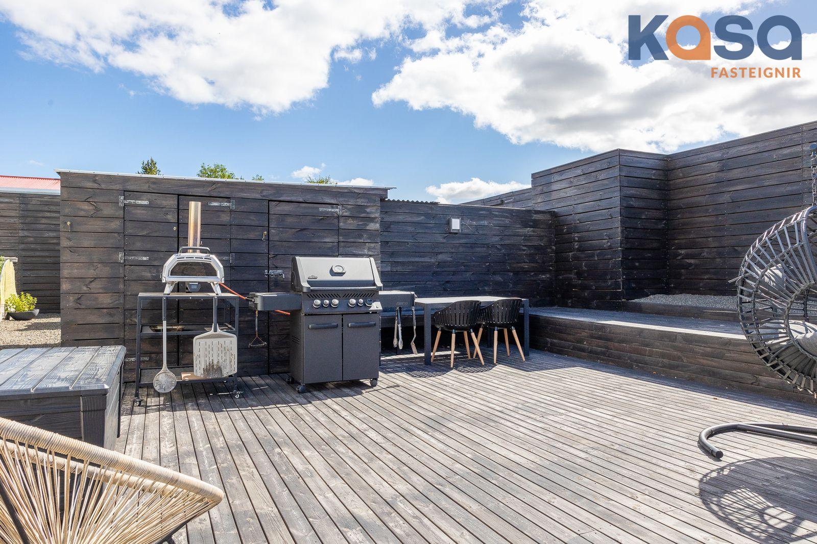Sólpallur: Út frá aðalhæð er gengið á mjög stórann steyptan sólpall með steyptum heitum potti ásamt vaðlaug. Einnig er útihús sem er einangrað, þar er stórt sauna, salerni og sturtuaðstaða. Búið er að gera aðstöðu fyrir útieldhús á pallinum og gera góðan geymsluskúr.