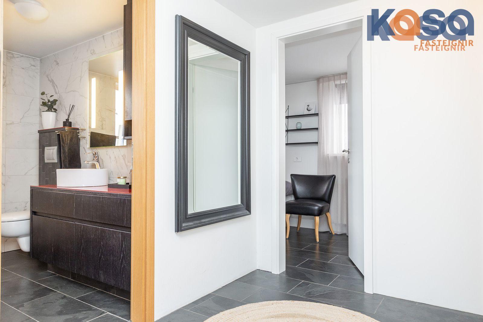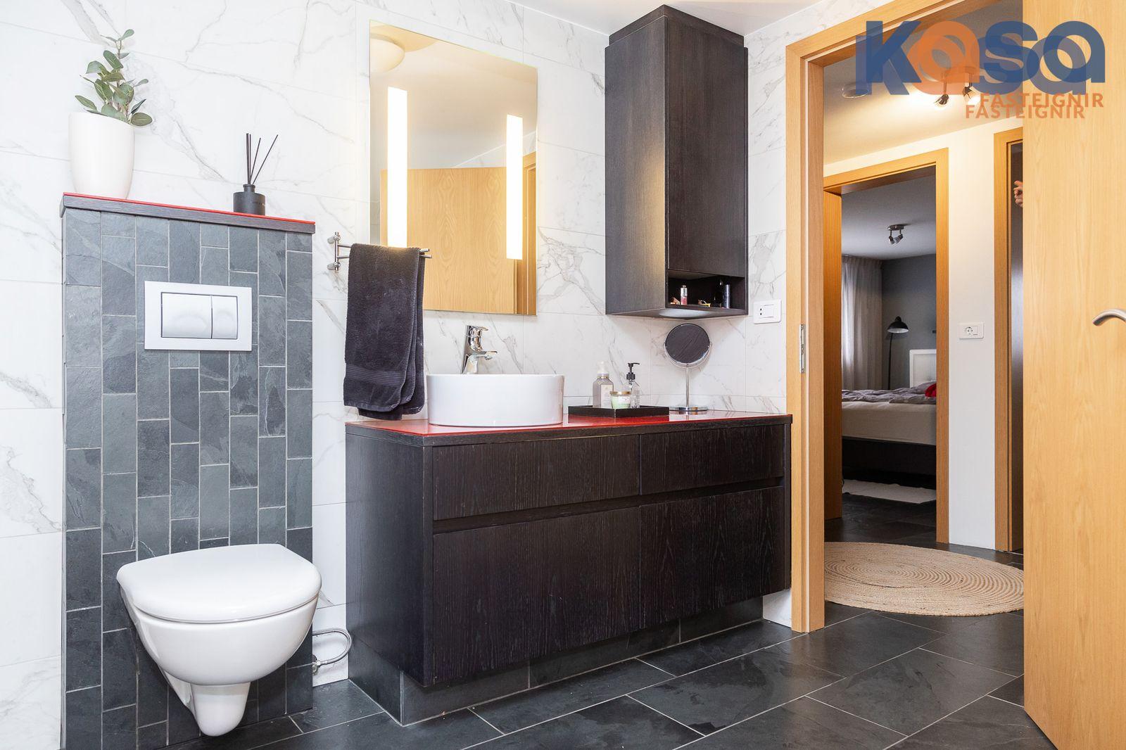 Baðherbergi: Flott innrétting með stein plötu. Borðvaskur er á plötunni. Stór sturta með sturtugleri. Vegghengt salerni og handklæðaofn. Flísalagt í hólf og gólf.