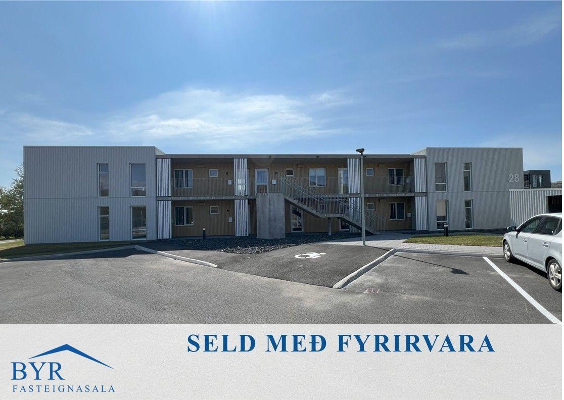 Skipulag eignar: Anddyri, alrými með stofu, borðstofu og eldhúsi, tvö svefnherbergi og baðherbergi. Í sameign sér geymsla, hjóla- og vagnageymsla.