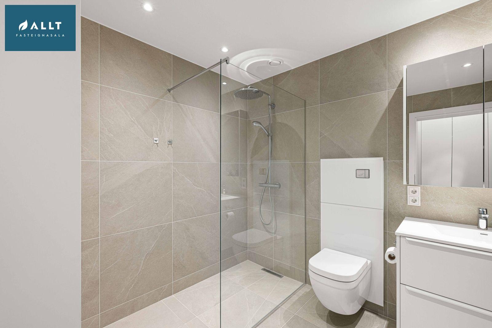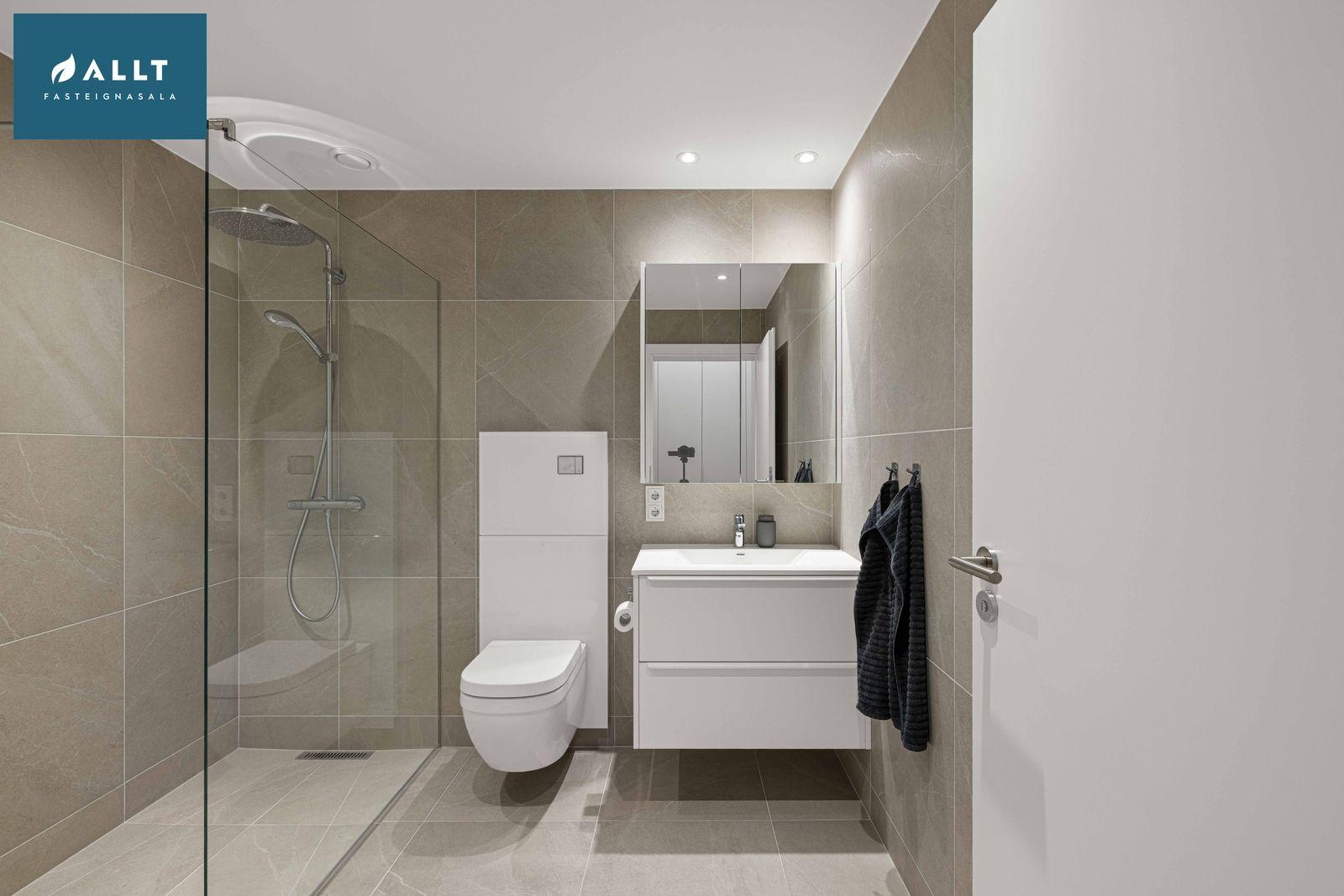 Baðherbergi: Er flísalagt í hólf og gólf með 60x60 flísum, upphengt salerni, sturtuklefi og innrétting við vask með ljúflokun á skúffum, tengi fyrir þvottavél og þurrkara.