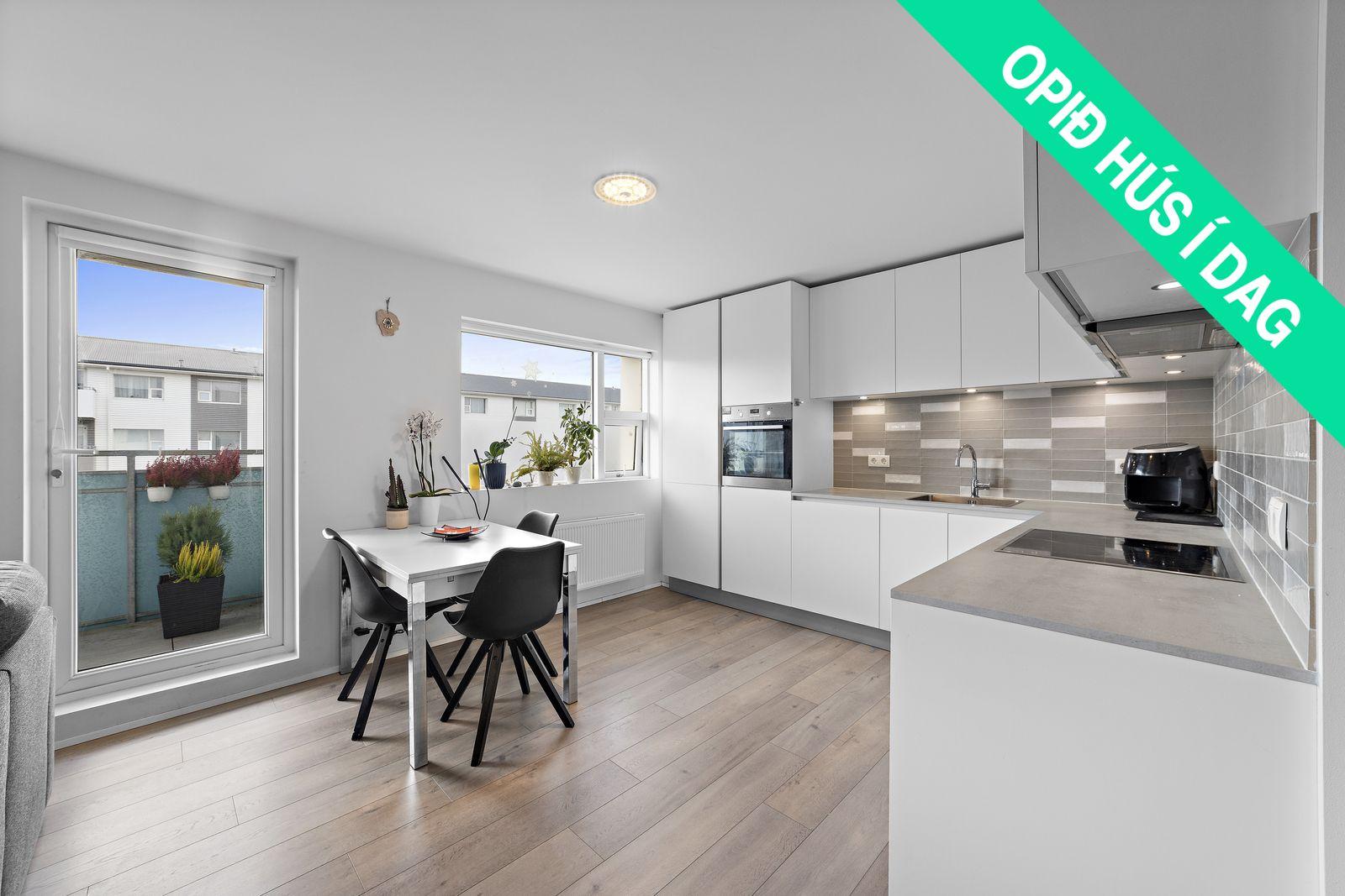 Stofan er opin við eldhús, þaðan er útgengt á rúmgóðar svalir.