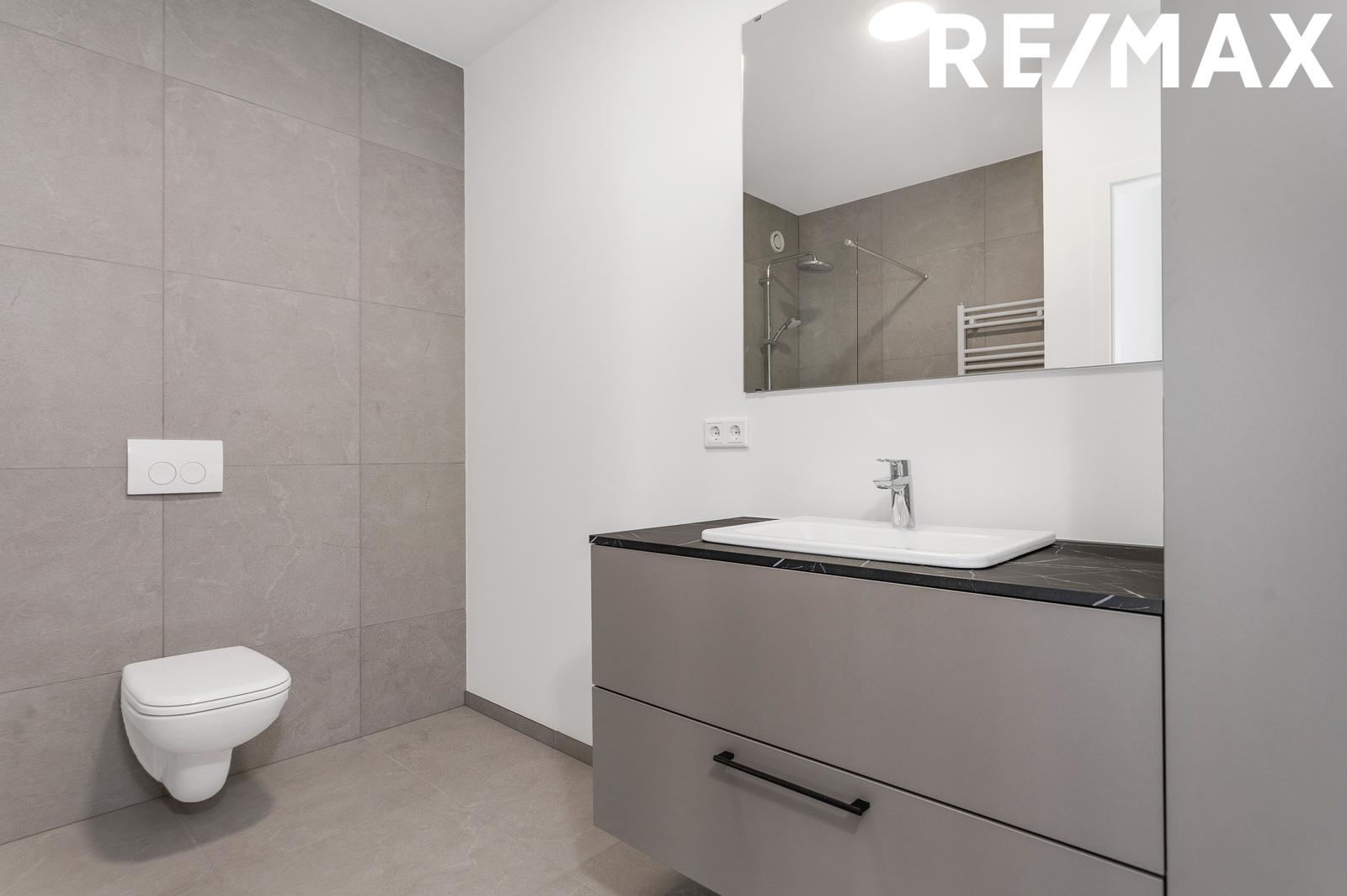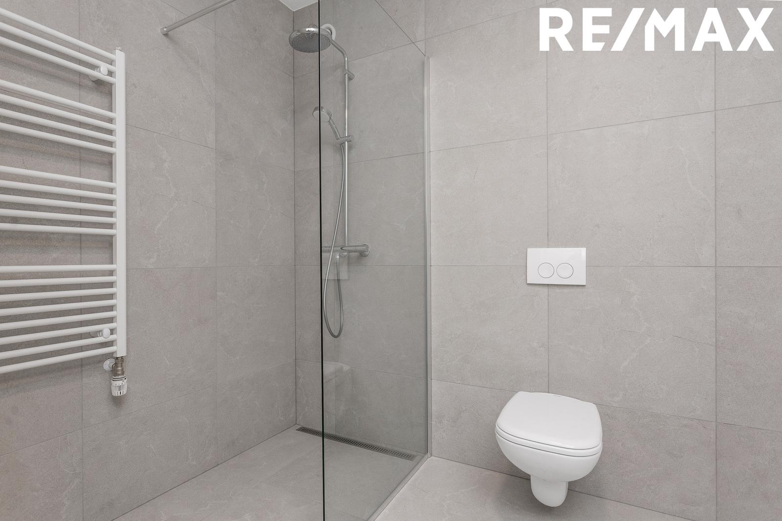 Baðherbergi með Walk-in sturtu, flísum á gólfi og á hluta af veggjum. Handklæðaofn, upphengt salerni, baðinnrétting með handlaug og spegil.