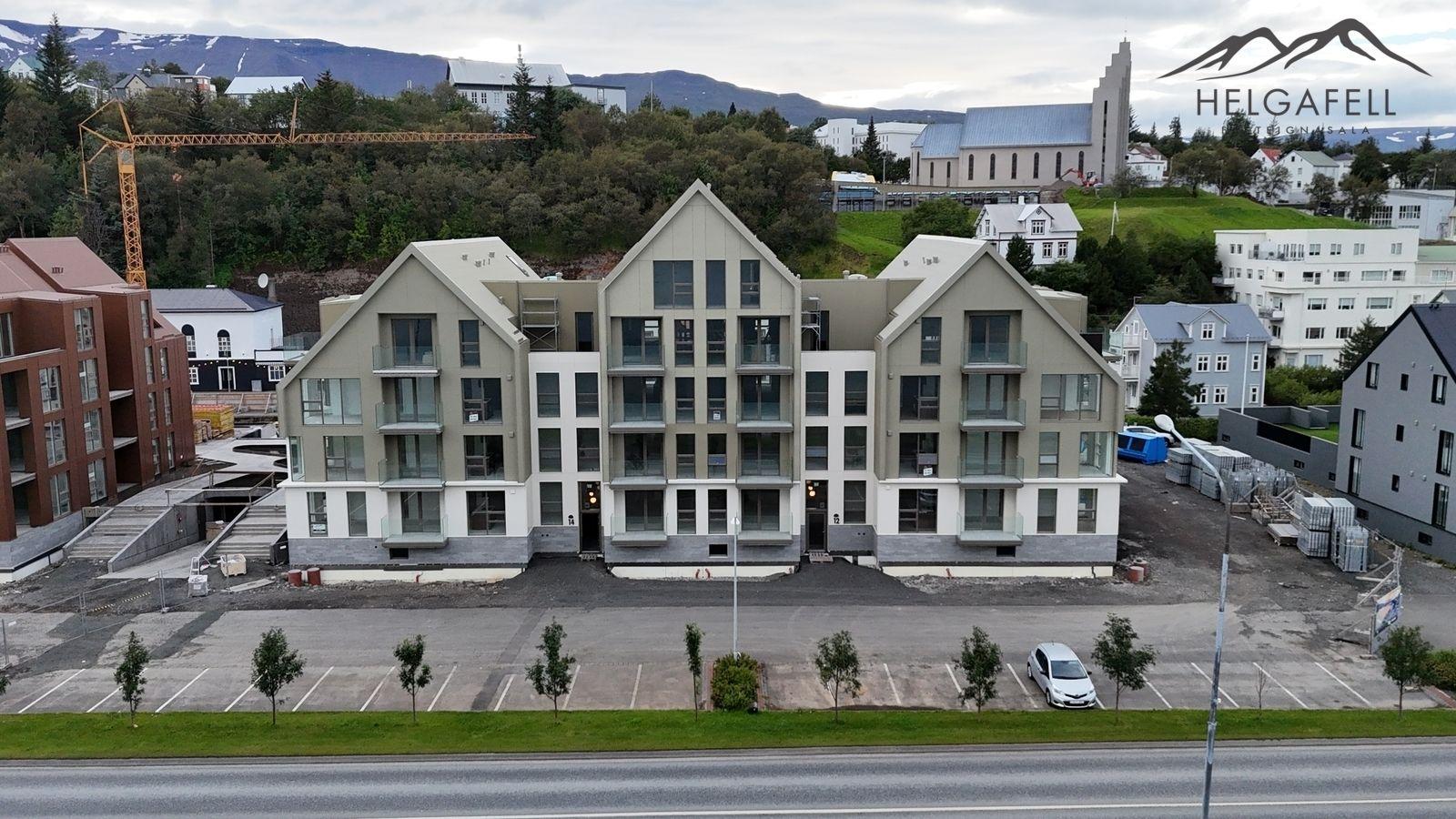 Íbúðin: Komið er inn í opið forstofu með skáp. Úr forstofunni er útgengt út á verönd til vesturs. Opið eldhús, L - laga með kvarts stein og span helluborði. Skúffur og skápar í eldhúsinu eru allar með ljúflokum. Eldhúsinnrétting með kvarts stein, bakaraofn í vinnuhæð, innfelldur vaskur. Allar skúffur og skápar með ljúflokum. Innfelld lýsing frá Lumex. Stofa/borðstofa, útgengt út á svalir til austurs með glæsilegu útsýni yfir pollinn. Hjónaherbergi með góðum skáp. Baðherbergi er flísalagt í hólf og gólf. Sturta með glerskili. Falleg innrétting frá Parka, kvarts steinn á borðplötu. Upphengt salerni. Skápur fyrir þvottavél og þurrkara, borðplata úr kvarts stein.