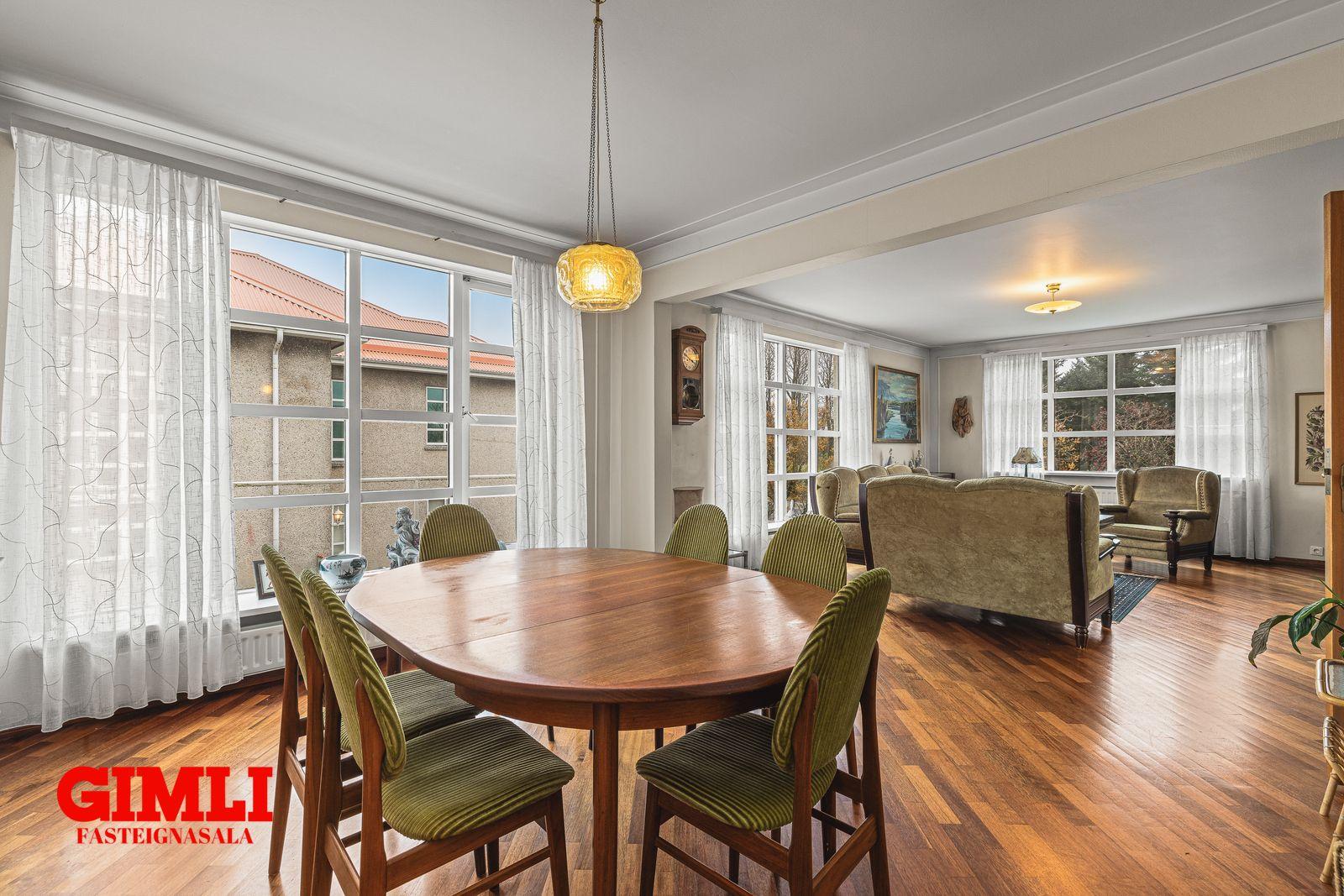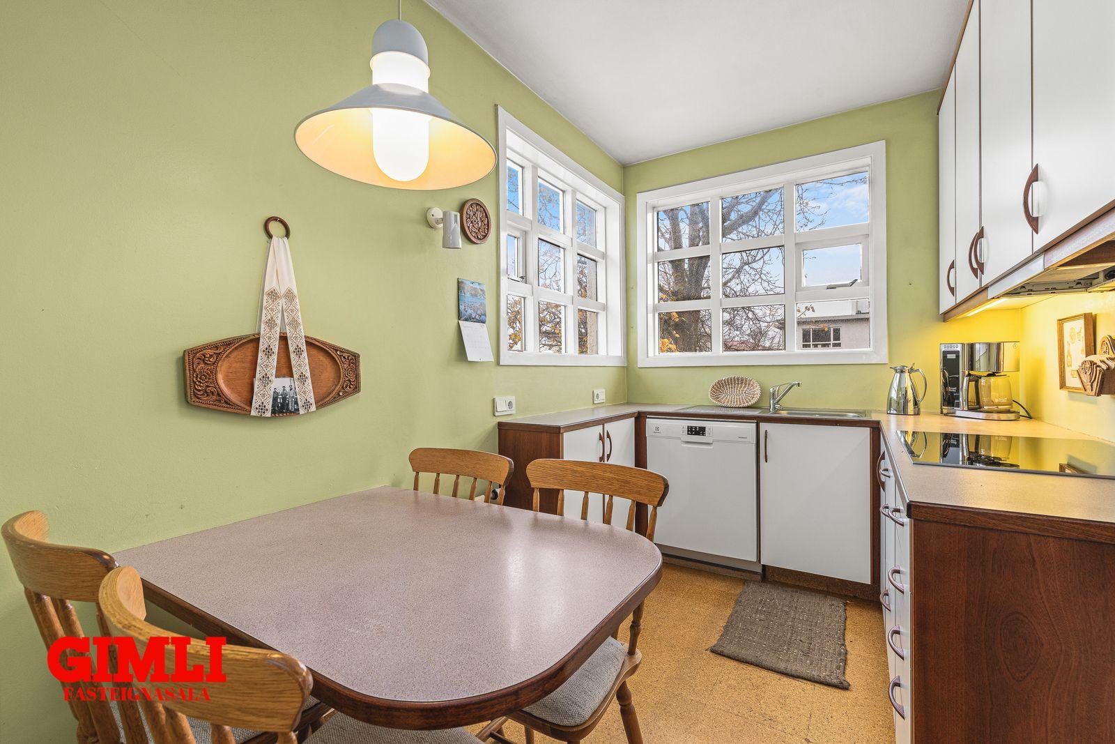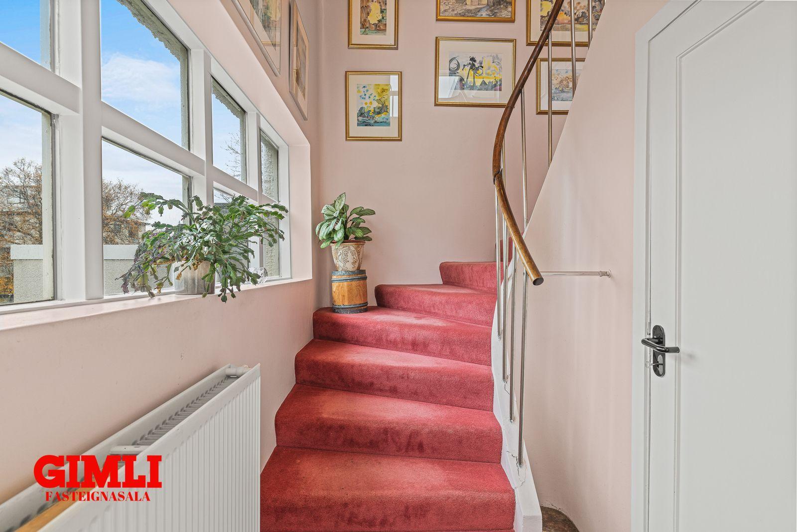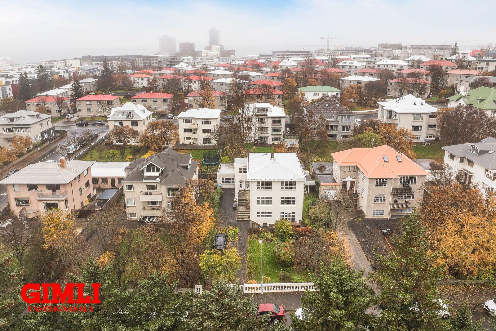 Gimli fasteignasala og Lilja Hrafnberg kynna: Falleg og björt efri sérhæð ásamt aukaíbúð í sérlega glæsilegu húsi með franskri gluggasetningu á þessum eftirsótta stað á móts við Kjarvalsstaði. Stutt er í skóla, þjónustu og í miðborgina. Eignin er í heildina skráð 161,9 fm og skiptist í forstofu með stiga upp á 2.hæð, arinstofu, tvær samliggjandi stofur, eldhús, tvö svefnherbergi, tvennar svalir, baðherbergi, geymslu, risloft og 36,6 fm aukaíbúð í vinnustofu/bílskúr. Eigninni fylgja sérstæði.