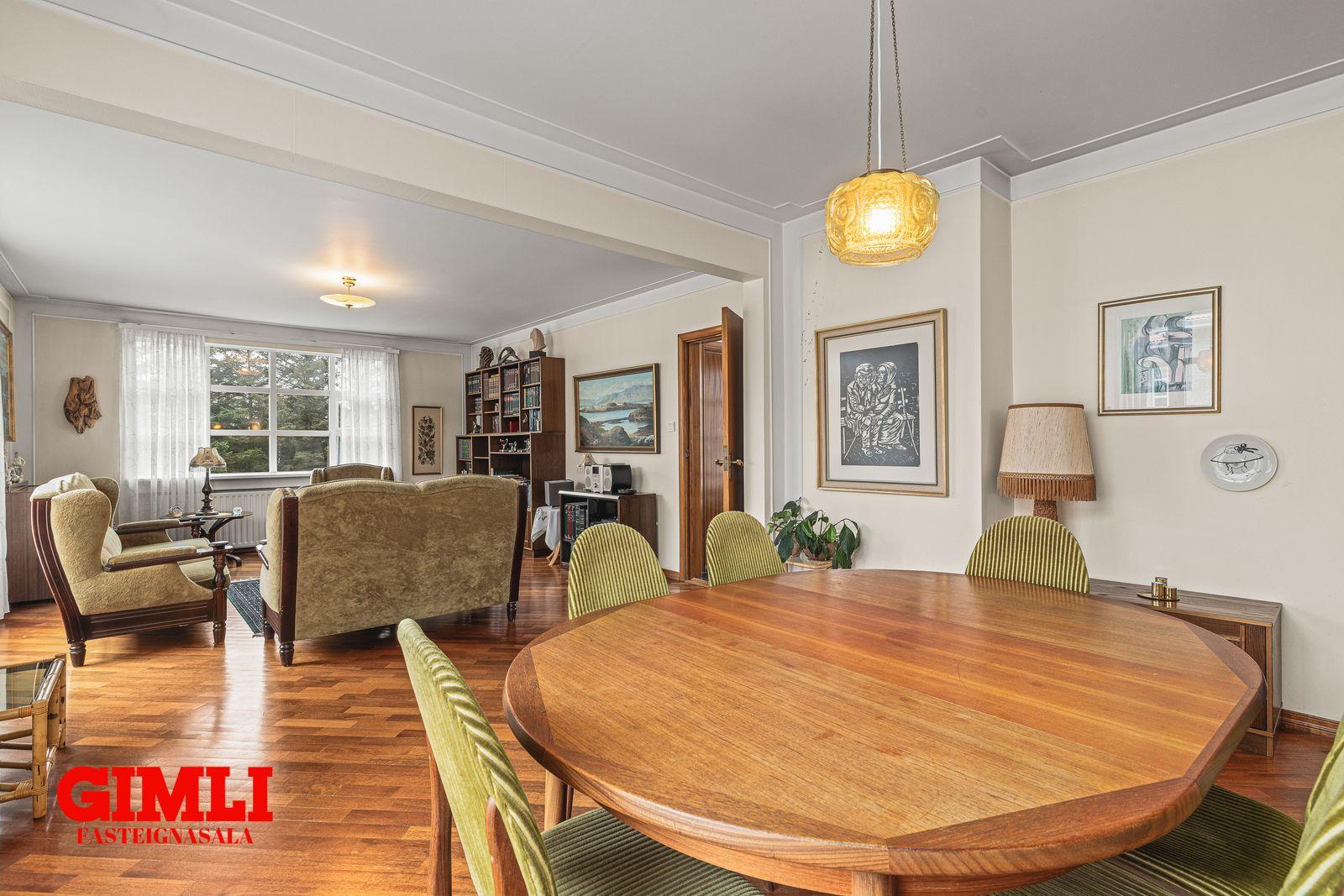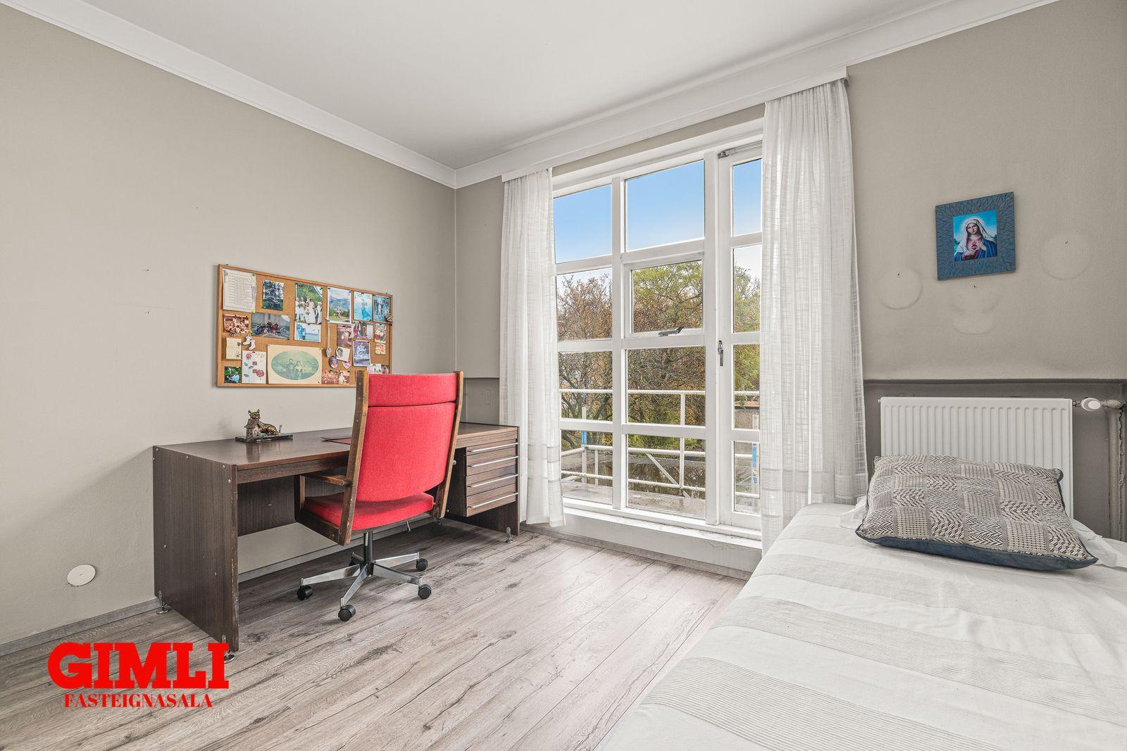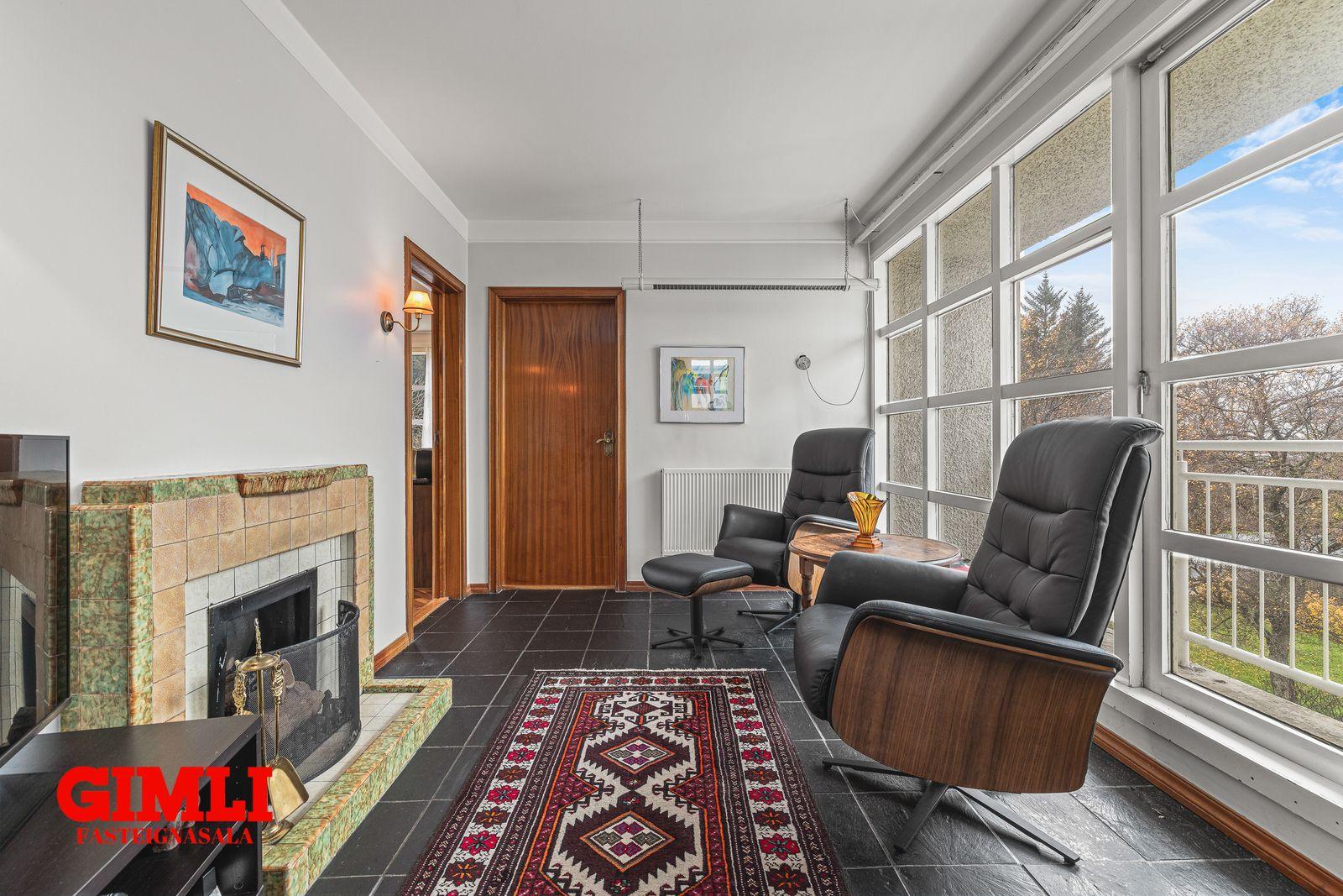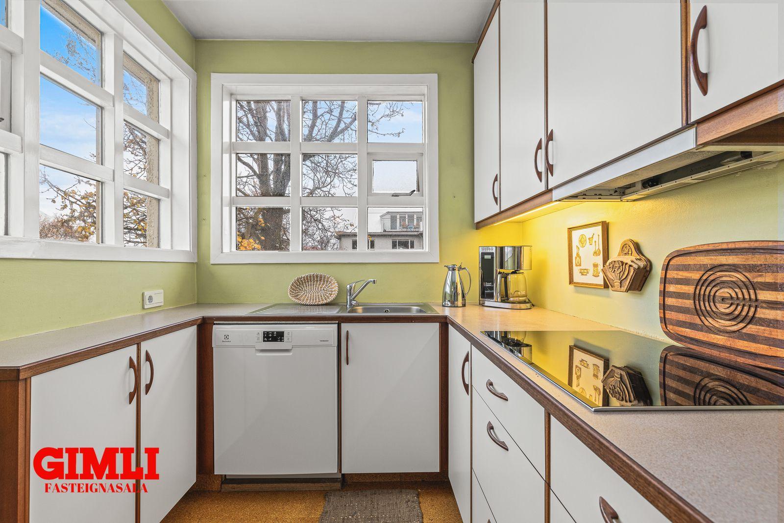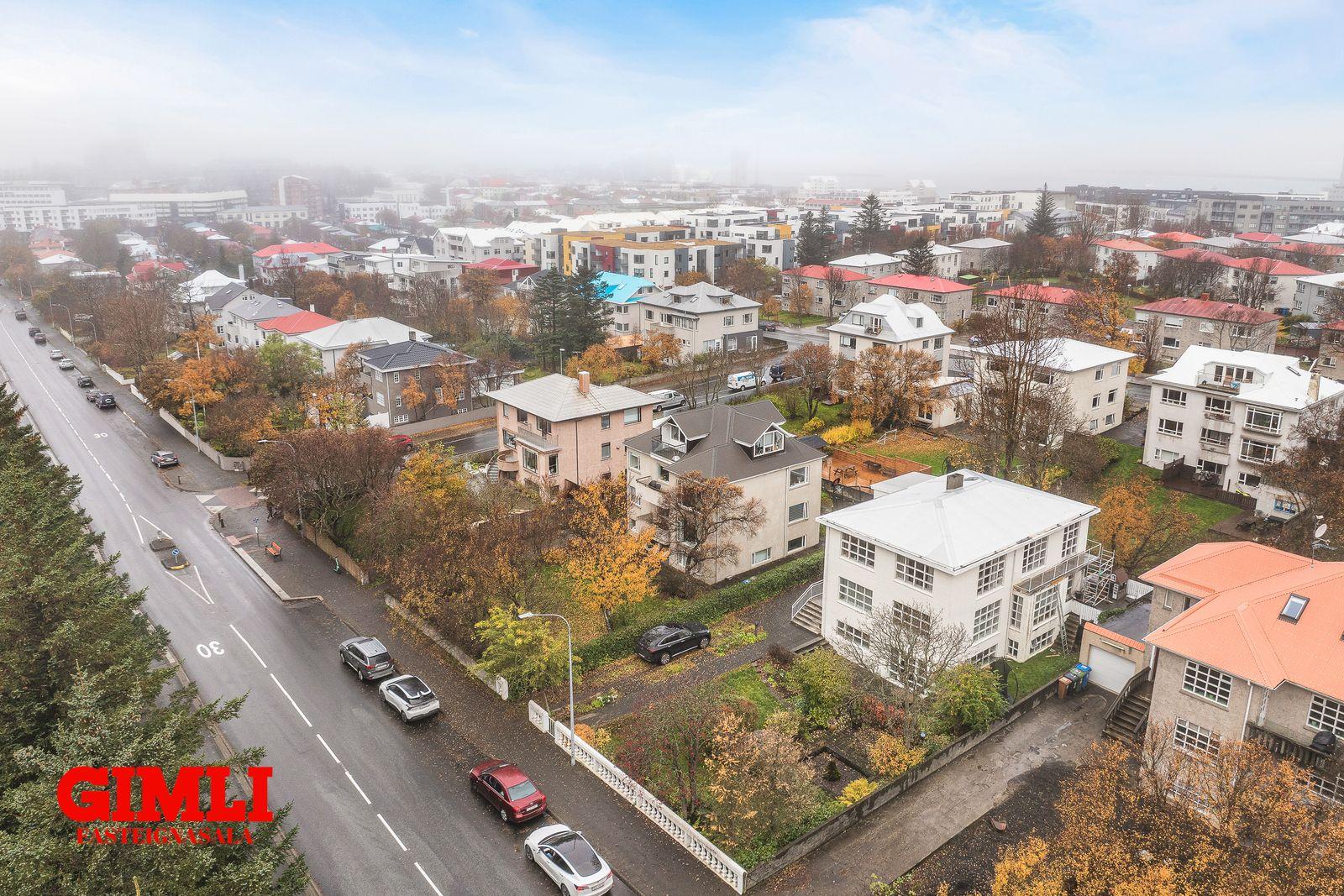 Gimli fasteignasala og Lilja Hrafnberg kynna: Falleg og björt efri sérhæð ásamt aukaíbúð í sérlega glæsilegu húsi með franskri gluggasetningu á þessum eftirsótta stað á móts við Kjarvalsstaði. Stutt er í skóla, þjónustu og í miðborgina. Eignin er í heildina skráð 161,9 fm og skiptist í forstofu með stiga upp á 2.hæð, arinstofu, tvær samliggjandi stofur, eldhús, tvö svefnherbergi, tvennar svalir, baðherbergi, geymslu, risloft og 36,6 fm aukaíbúð í vinnustofu/bílskúr. Eigninni fylgja sérstæði.