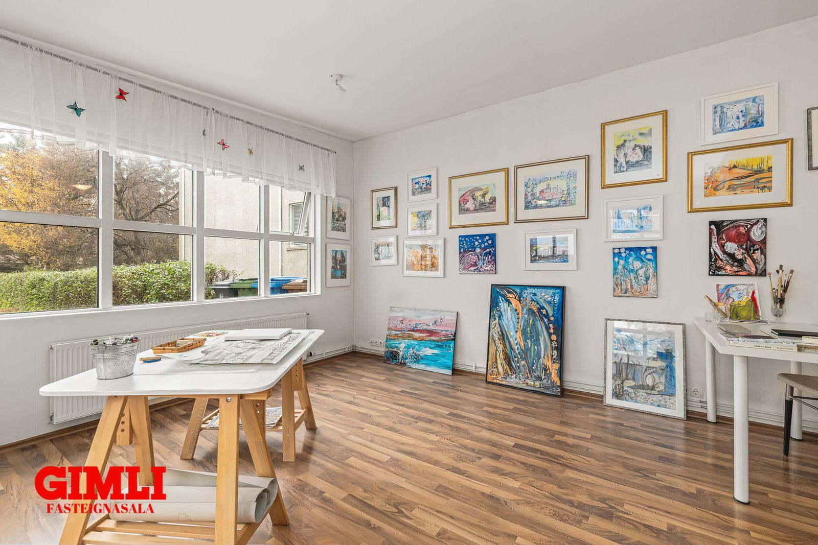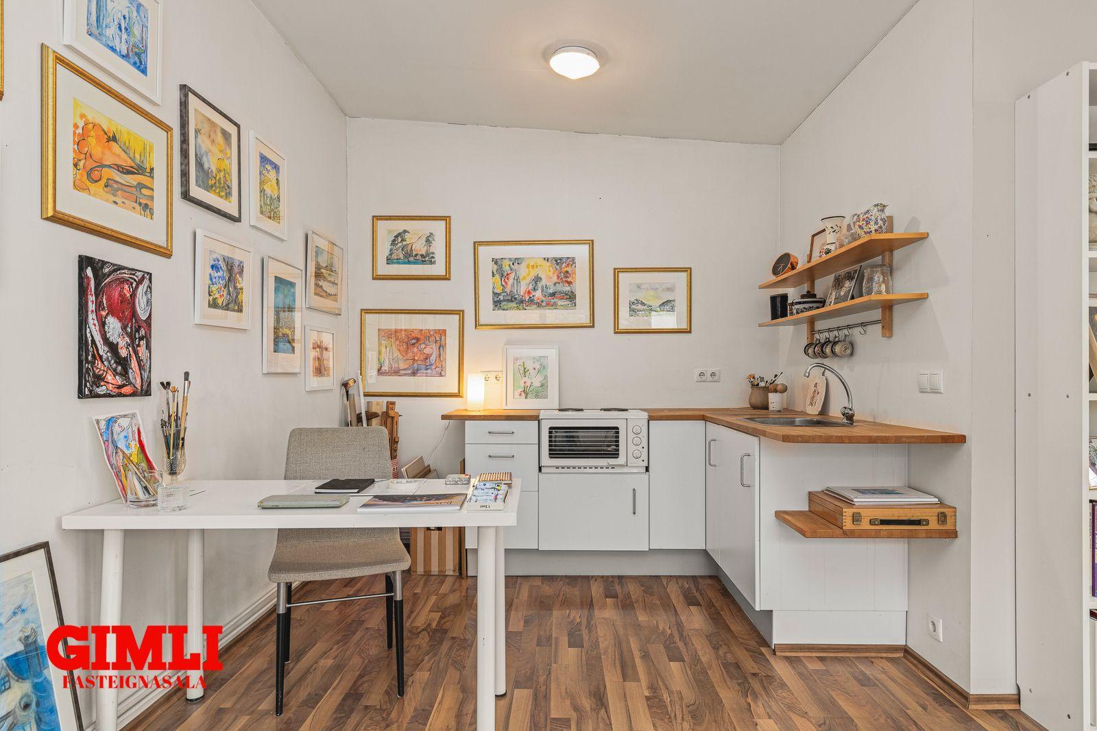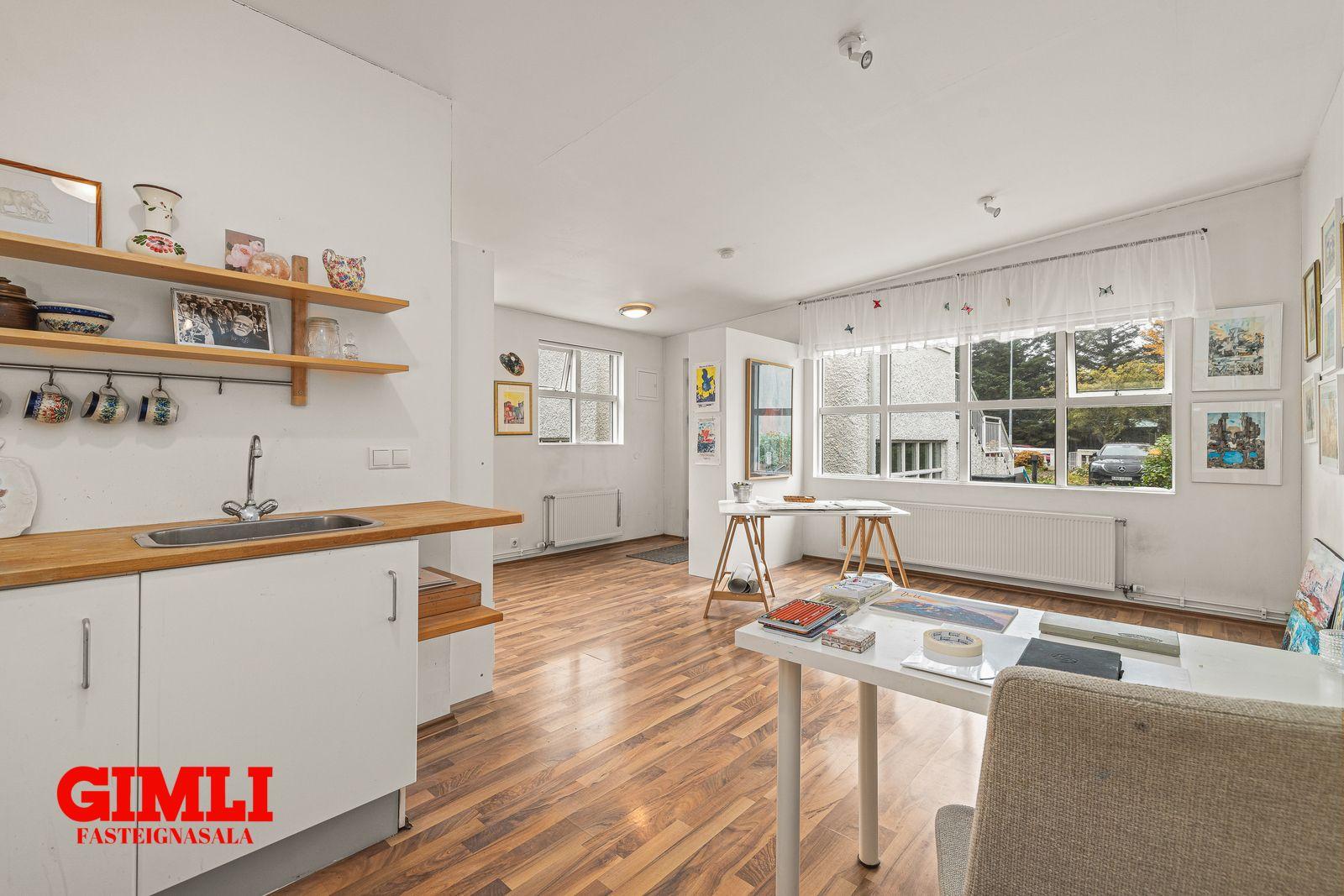 Vinnustofa/bílskúr: 36,6 fm stúdíó íbúð með eldhúsi og baðherbergi. Möguleiki á góðum leigutekjum.