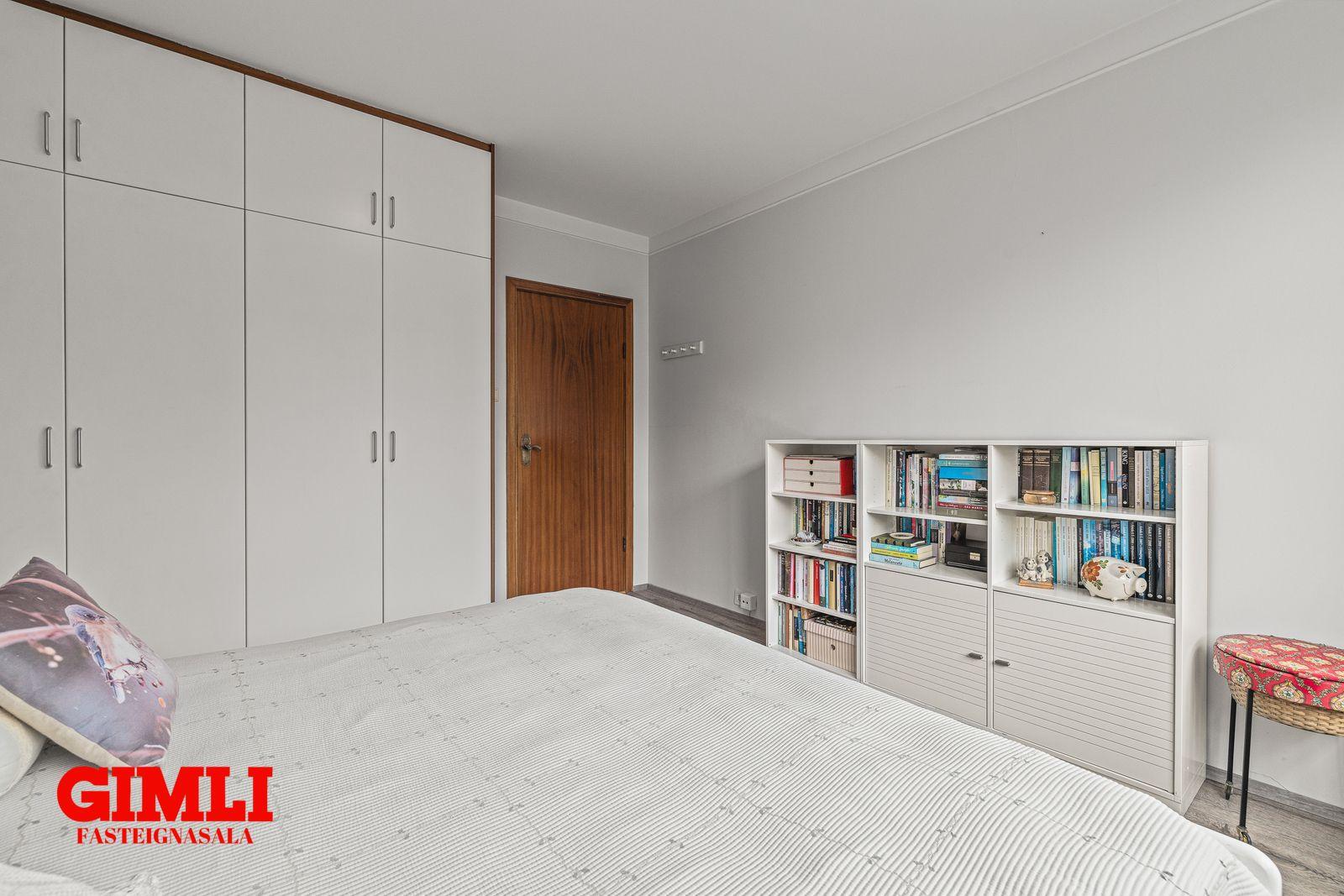Hjónaherbergi: Bjart og rúmgott með hvítum fataskápum. Nýlegt harðparket á gólfi.