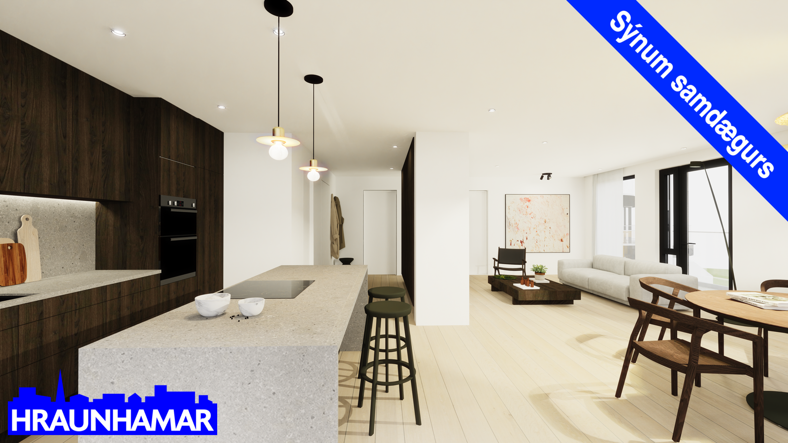 Íbúðirnar eru sérlega vel innréttaðar með innréttingum frá Voke III og vönduðum eldunartækjum. Innbyggður ísskápur og uppþvottavél fylgja.