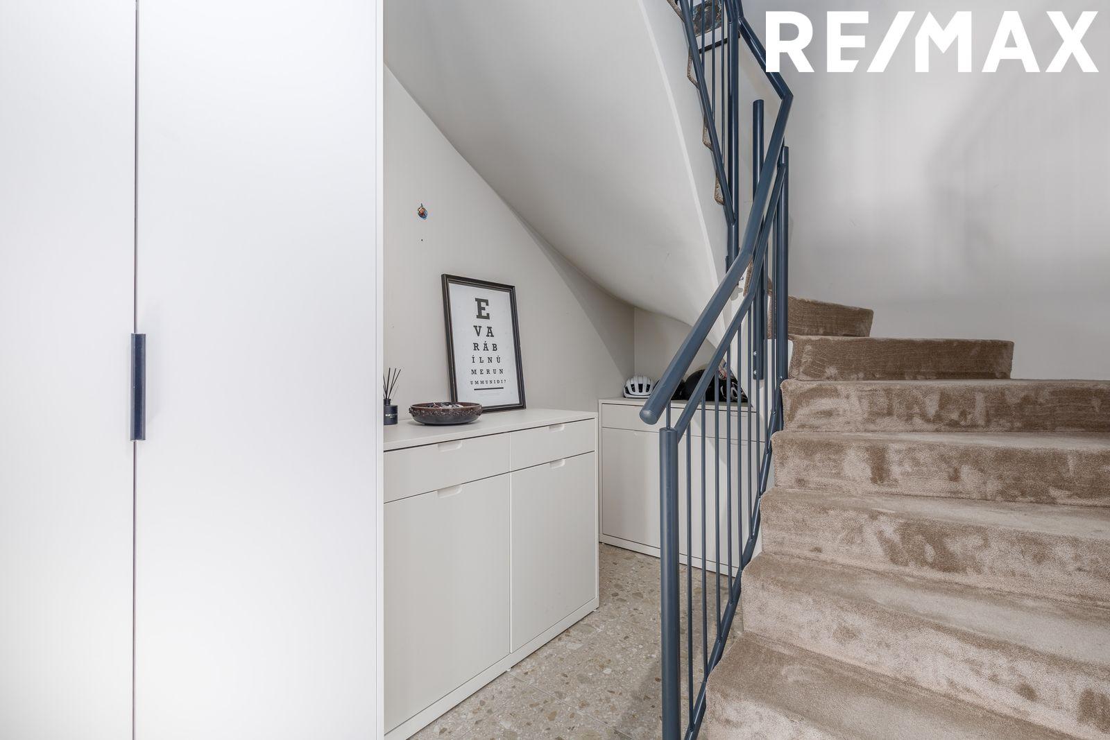 Forstofa: Flísar á gólfi og fataskápur. Fallegt teppi á stiga upp að íbúð. Gott geymslurými er undir stiganum.